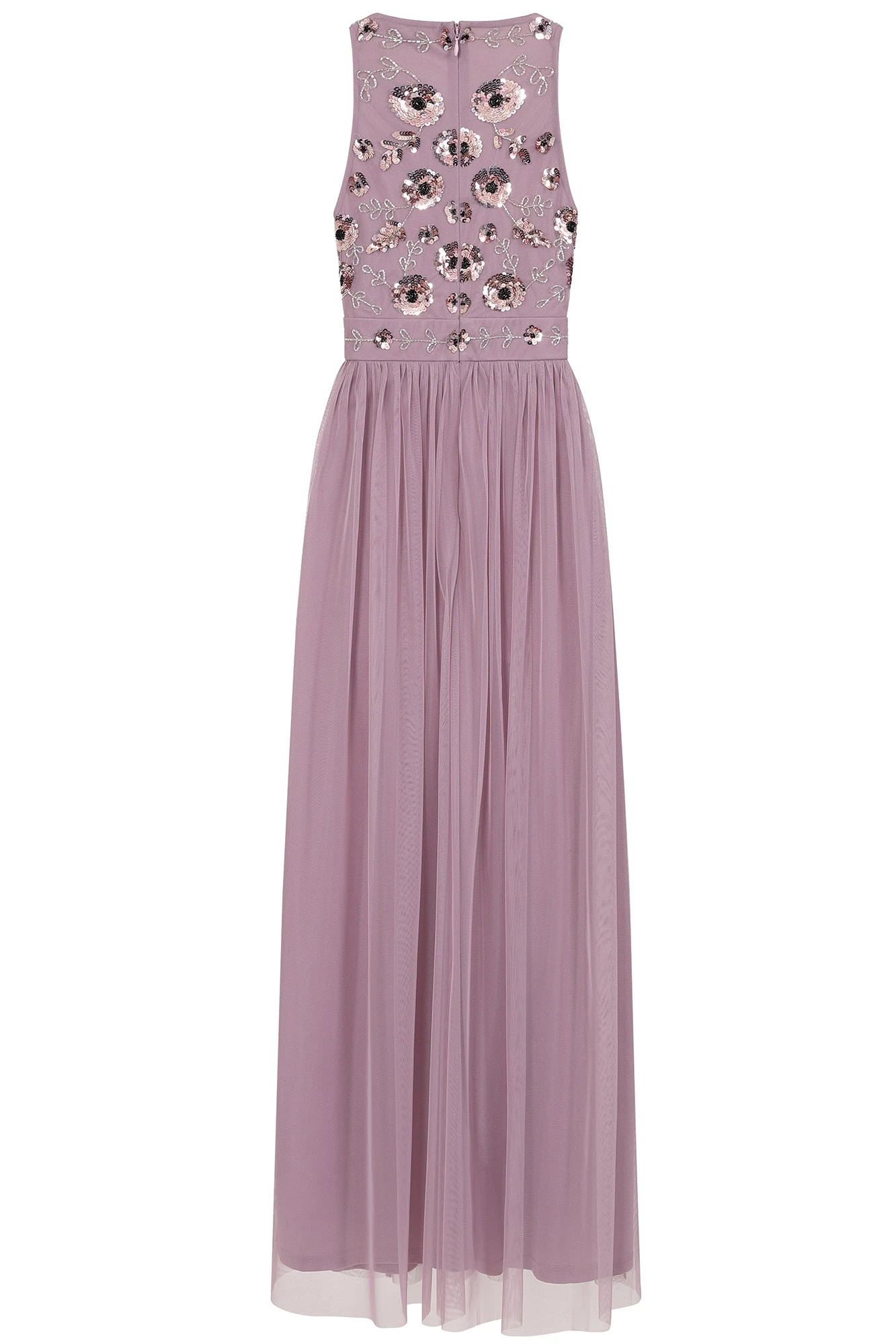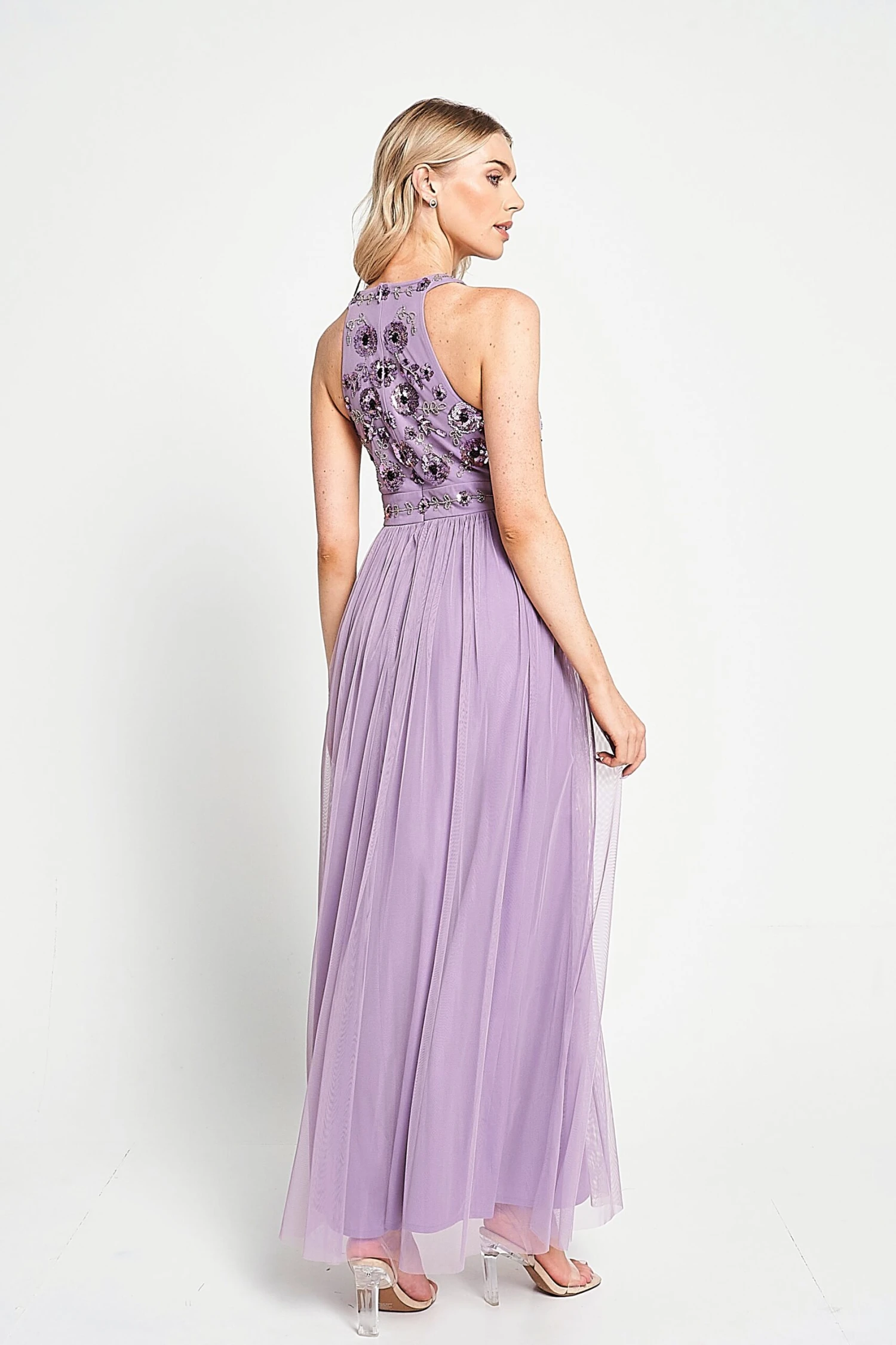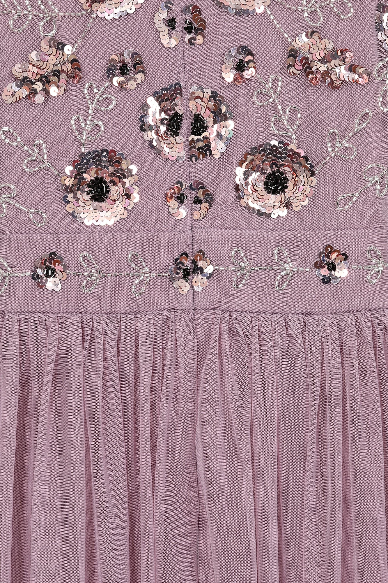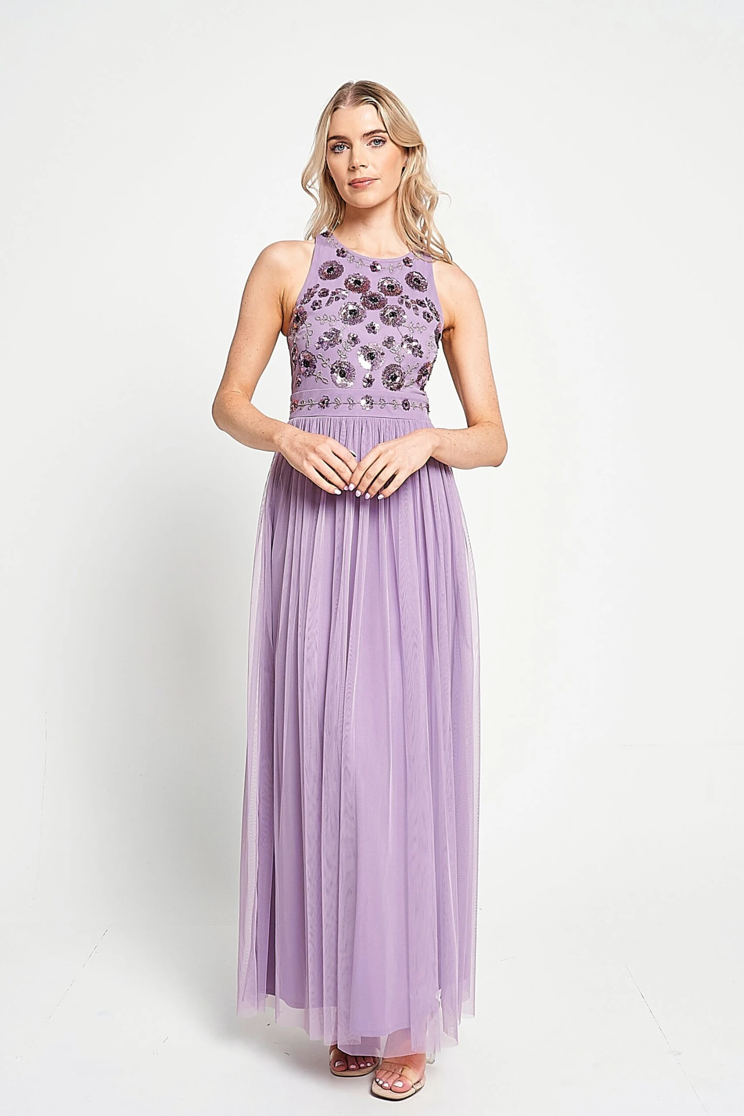 Bring a touch of floral detailing to special occasion dressing with Aeris. Realised in a hazy lilac hue, this sleeveless gown comprises of a fitted bodice and a flowing, full length tulle skirt. Sequin embellishment, arranged in a floral motif, completes this charming style.
