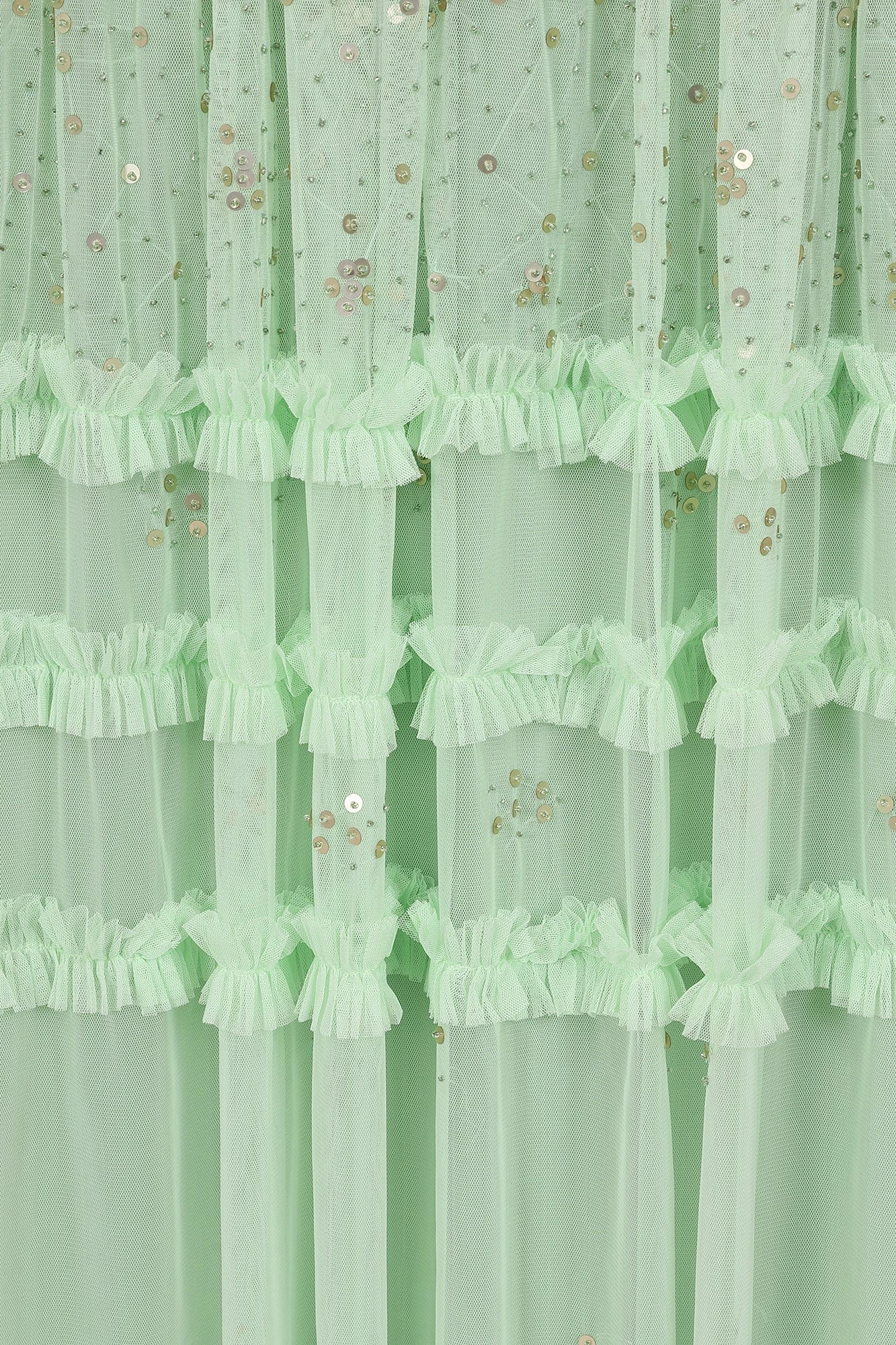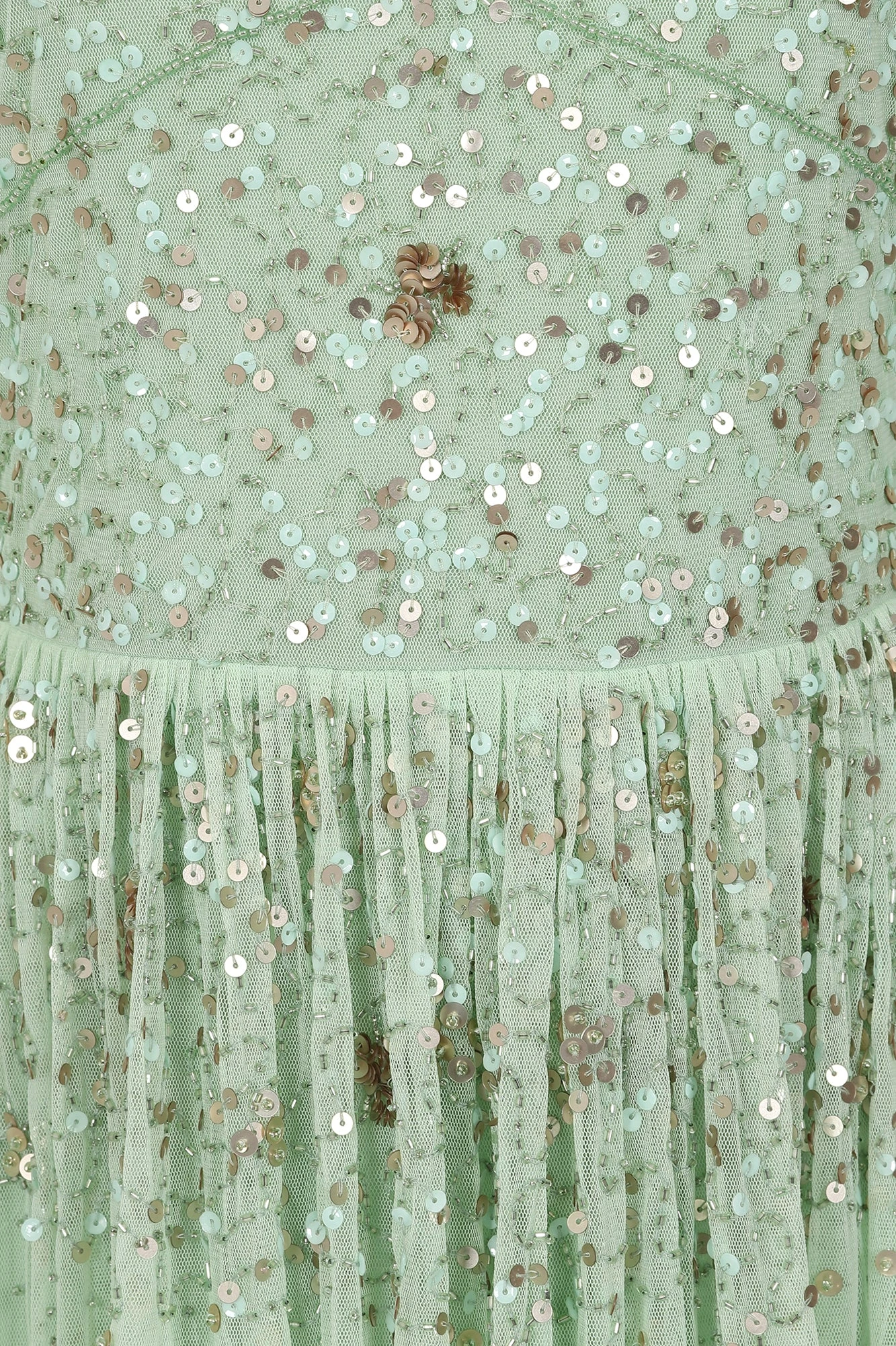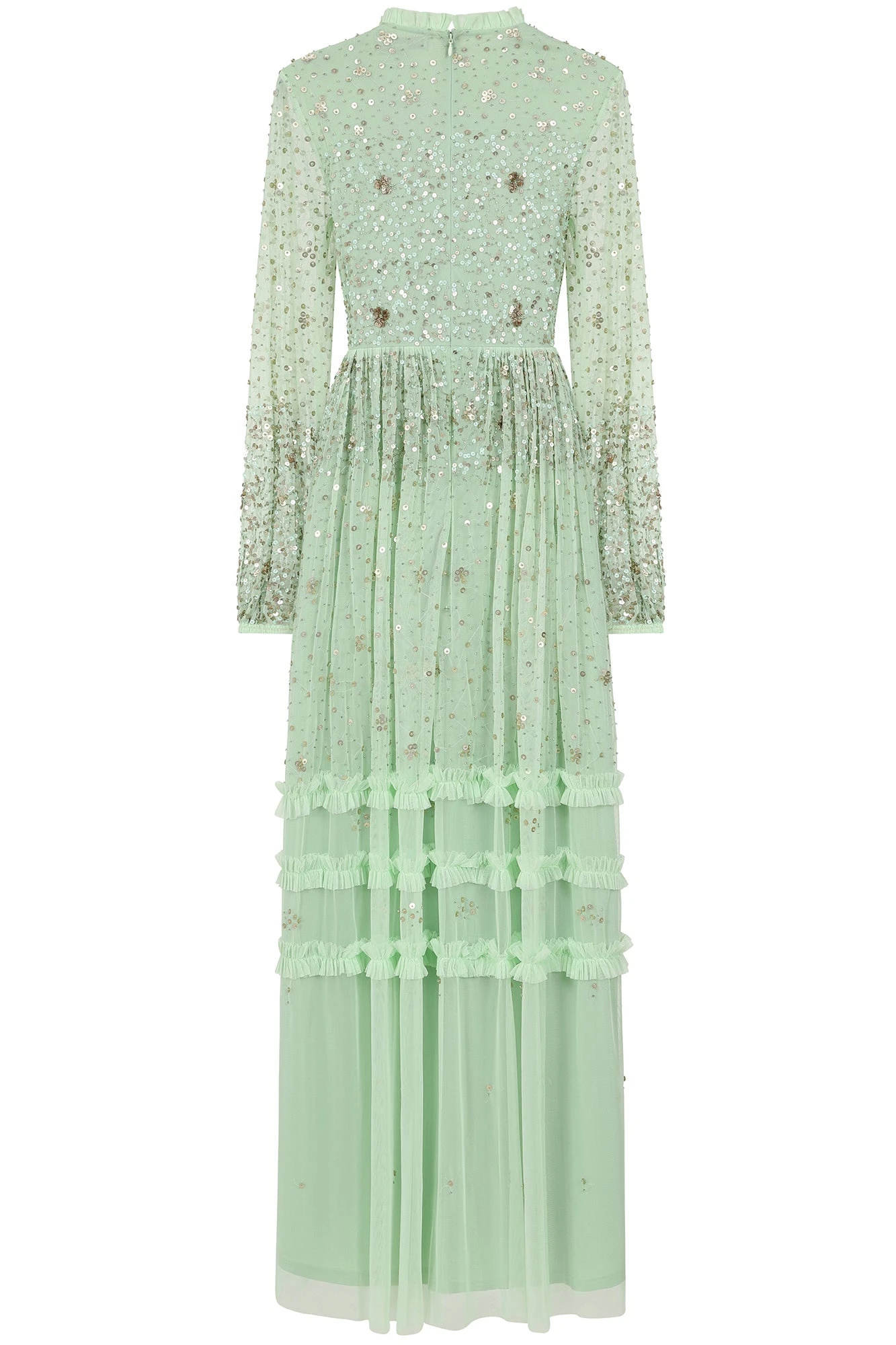 Now available in a fresh aqua green, bring a touch of sparkle to any special occasion with Agnes! Strewn with shimmering sequins, this long sleeved maxi dress is complete with ruffled trim and a keyhole cut out at front.