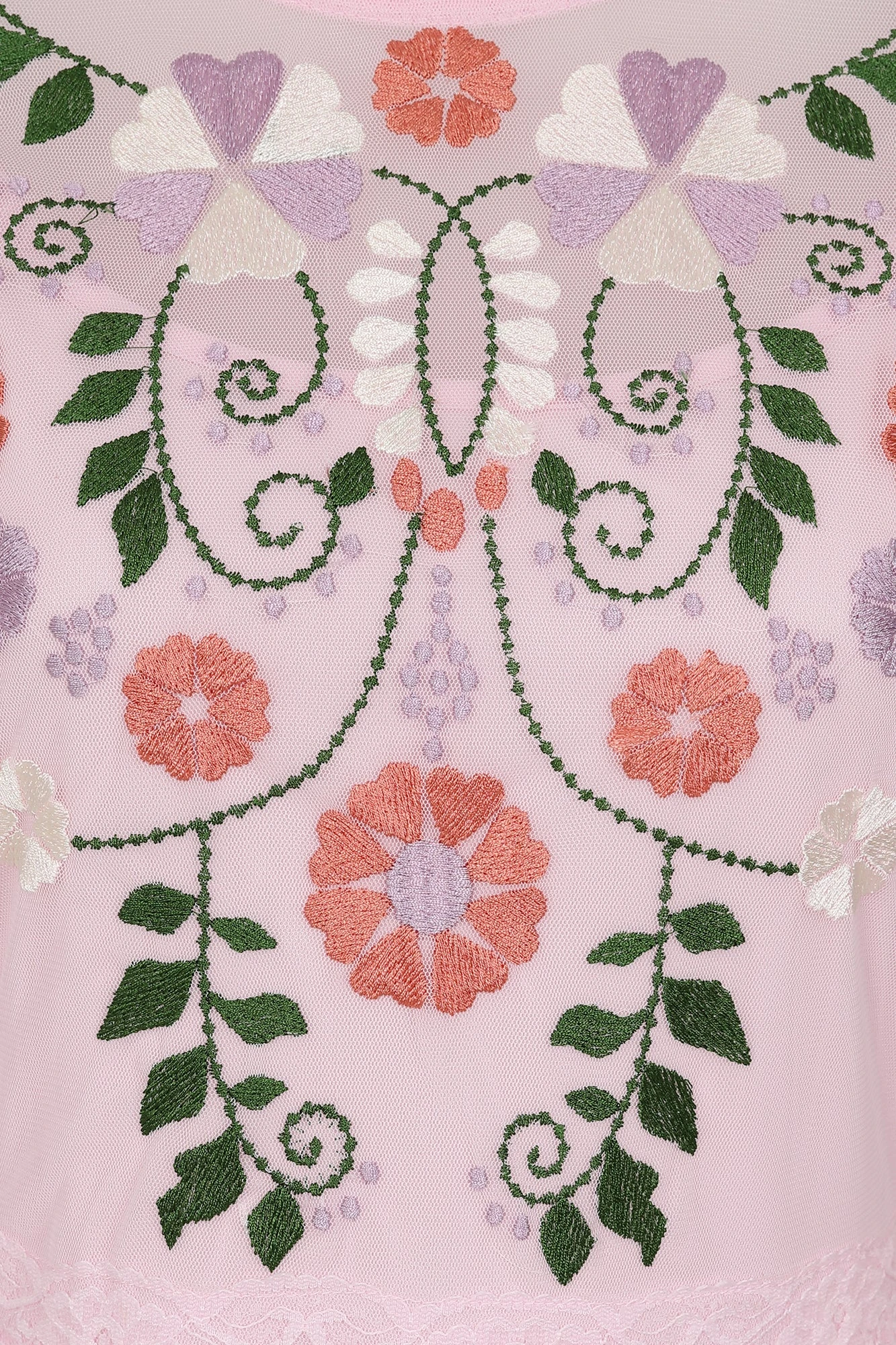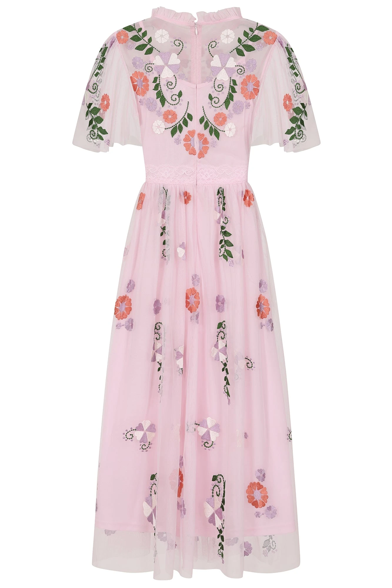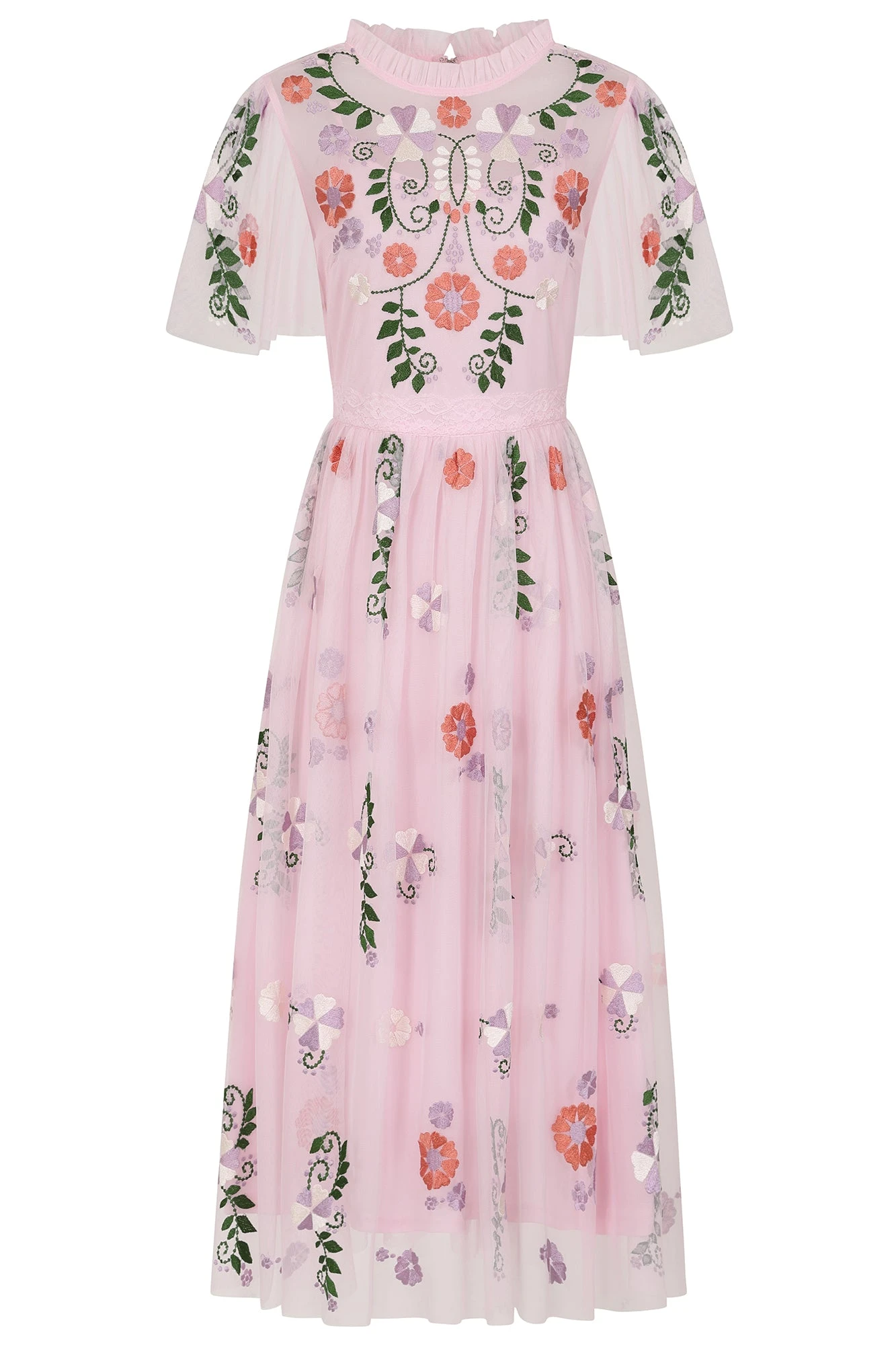 Add abstract florals to your summer repertoire with Althea. Comprising of a fitted bodice and flowing tulle skirt, this pretty pink dress is embroidered throughout with botanical inspired detailing. This mid length piece is complete with sheer sleeves and ruffled neckline.