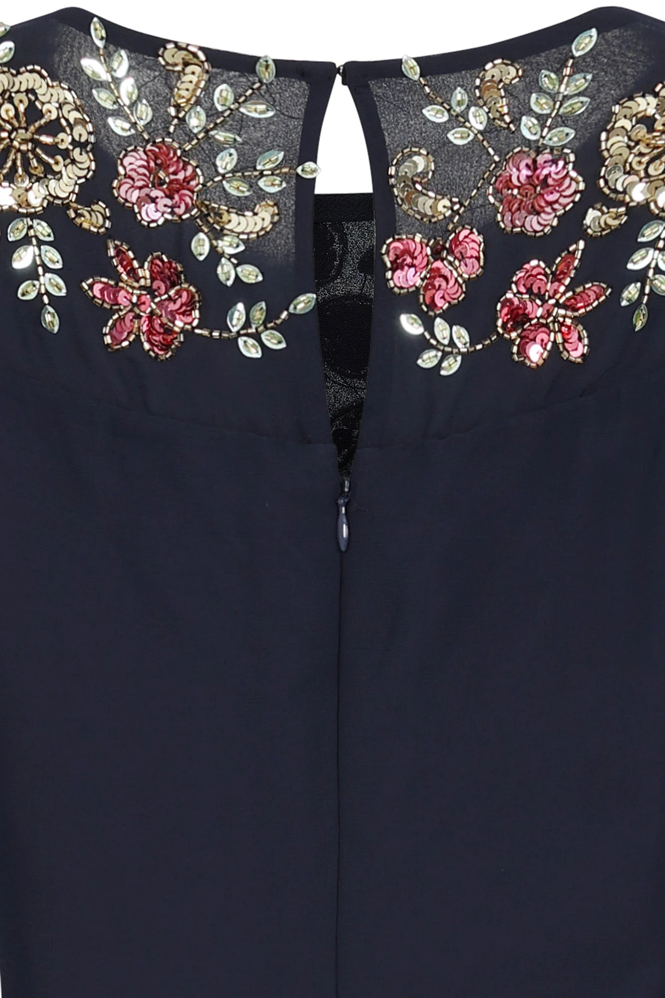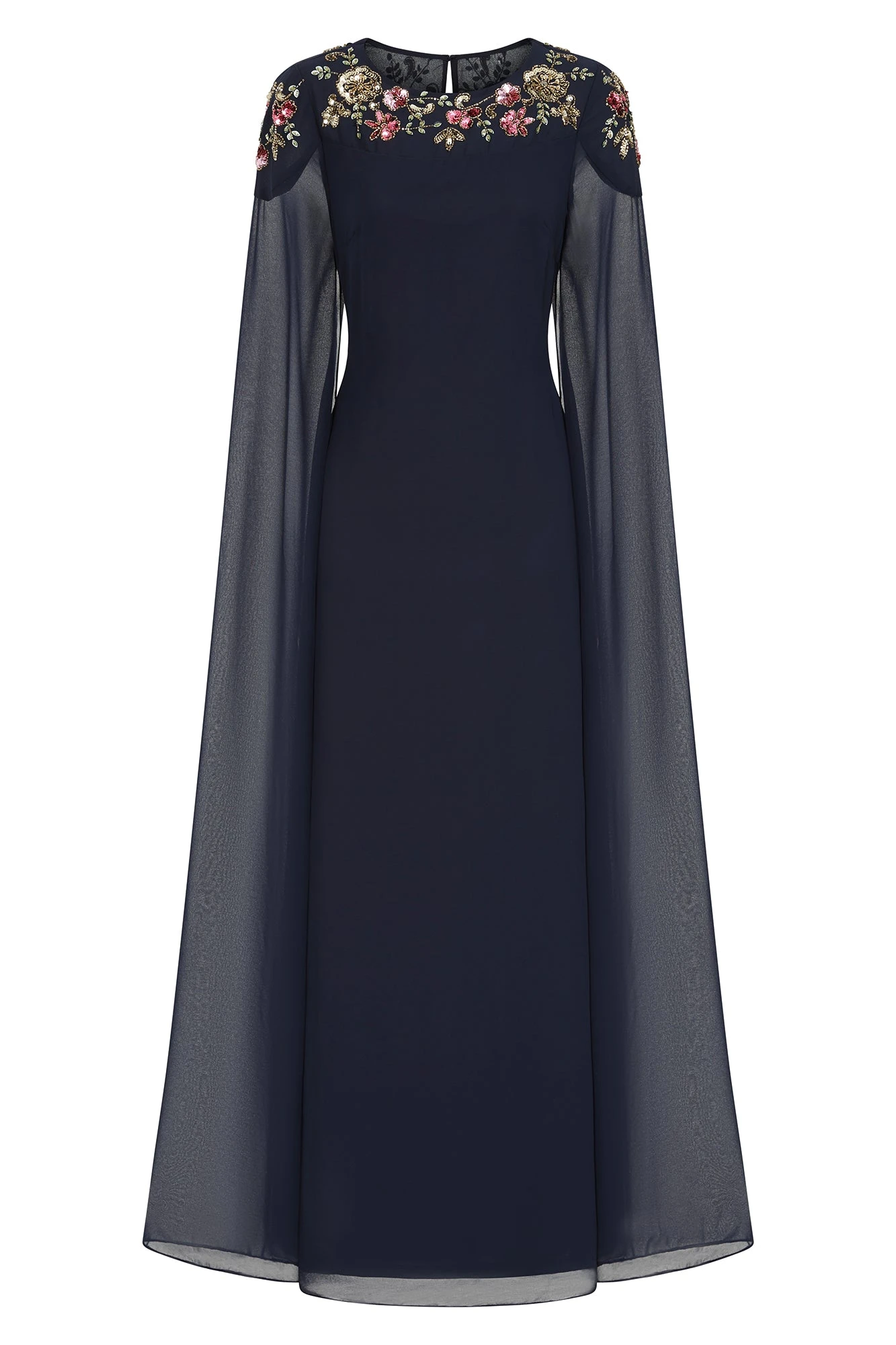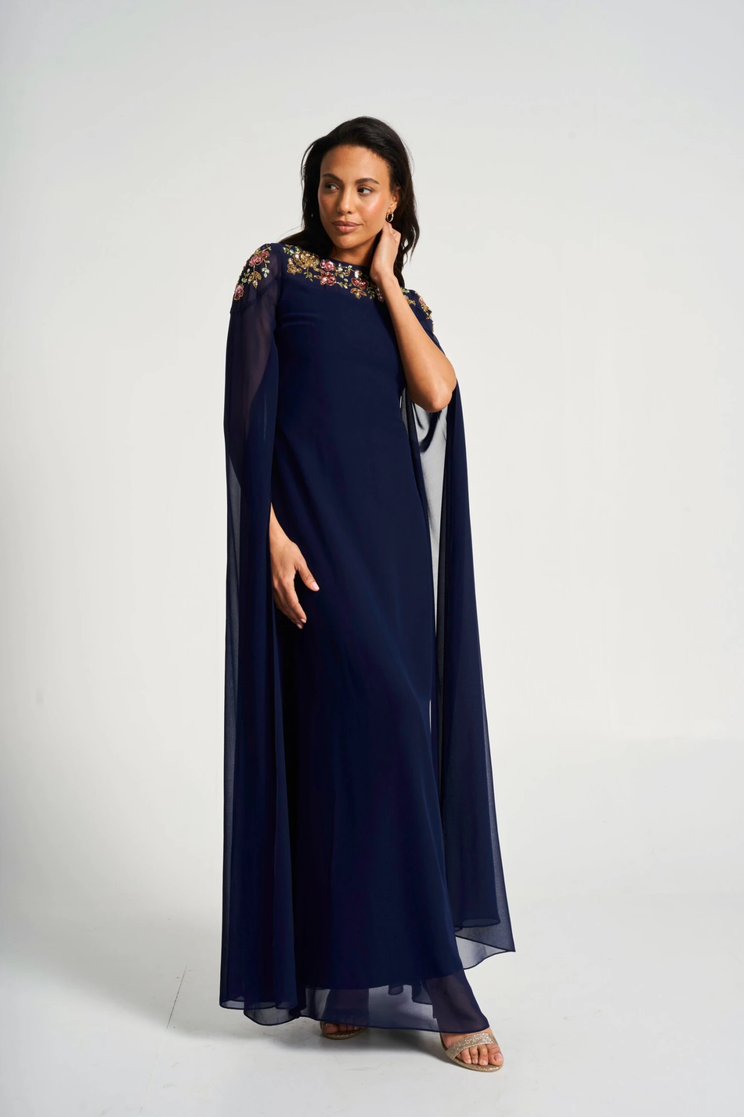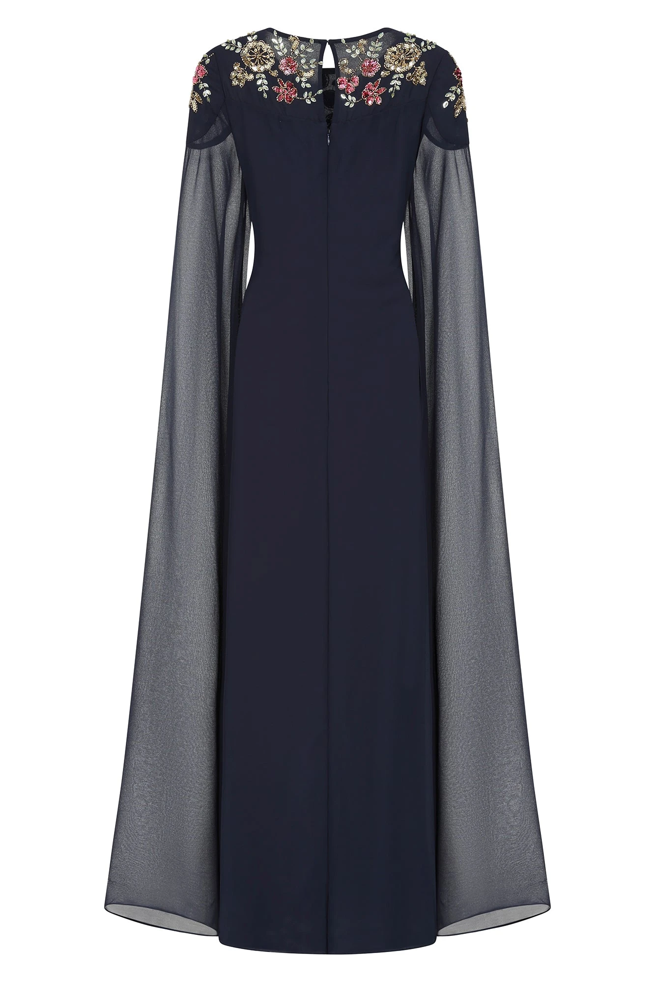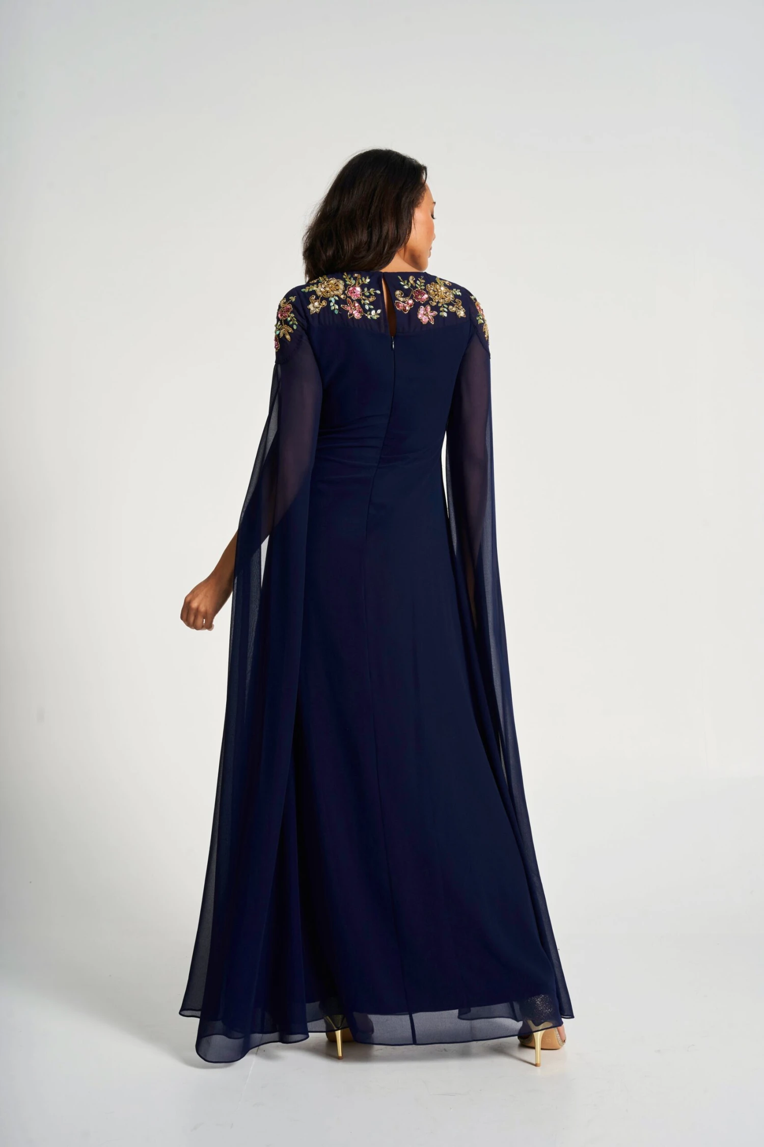 Aster Navy Floral Embellished Cape Sleeve Maxi Dress