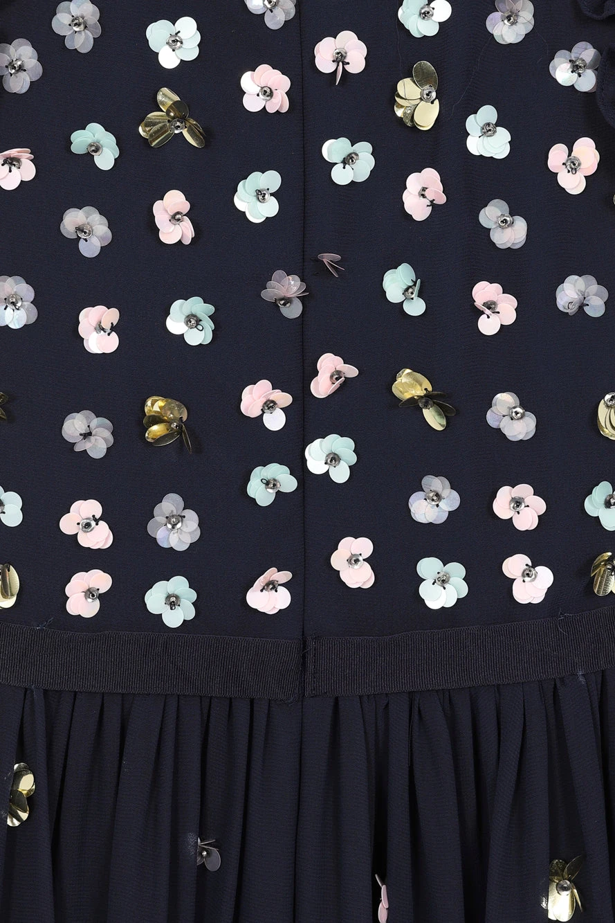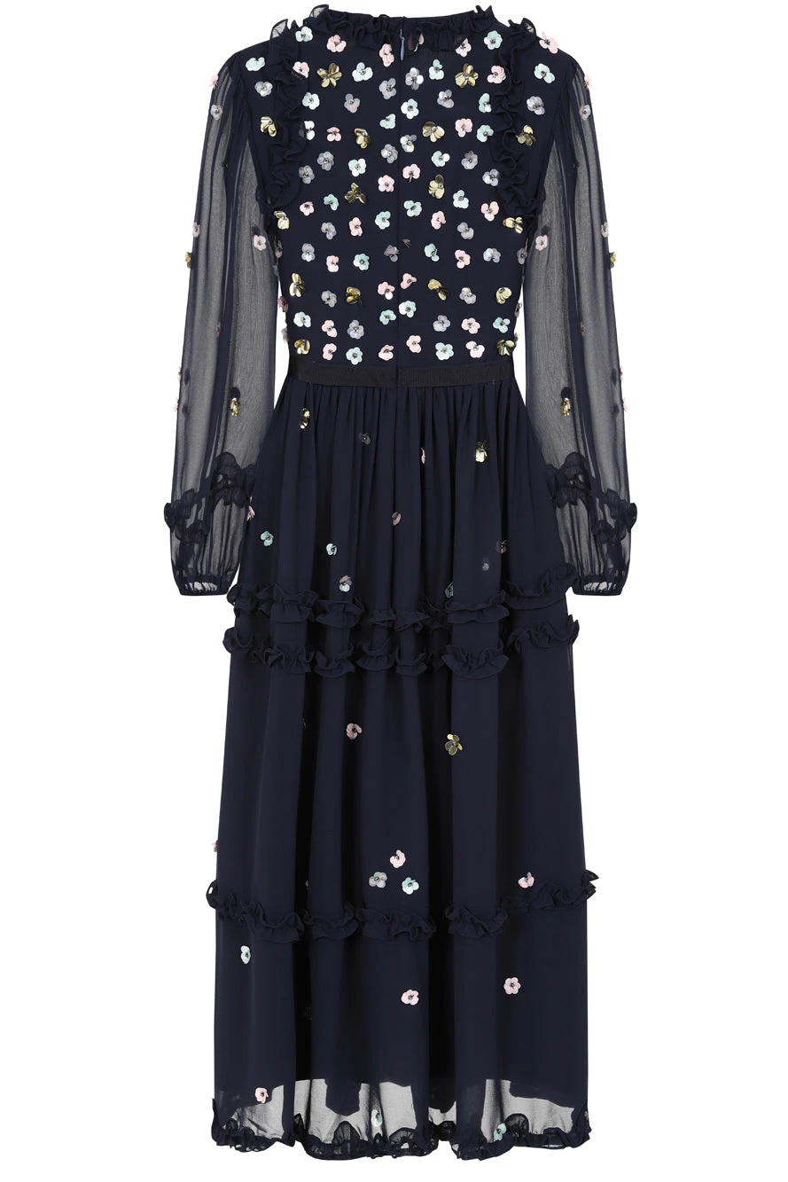 Cut in a flattering fit and flare silhouette, Astor in navy is sure to become your go-to style for very special occasions. Scattered with gold and pastel hued paillettes, arranged in flower inspired motifs, this inky midi is trimmed throughout with delicate ruffled trim. Astor is complete with full length sleeves and a hem length lining.