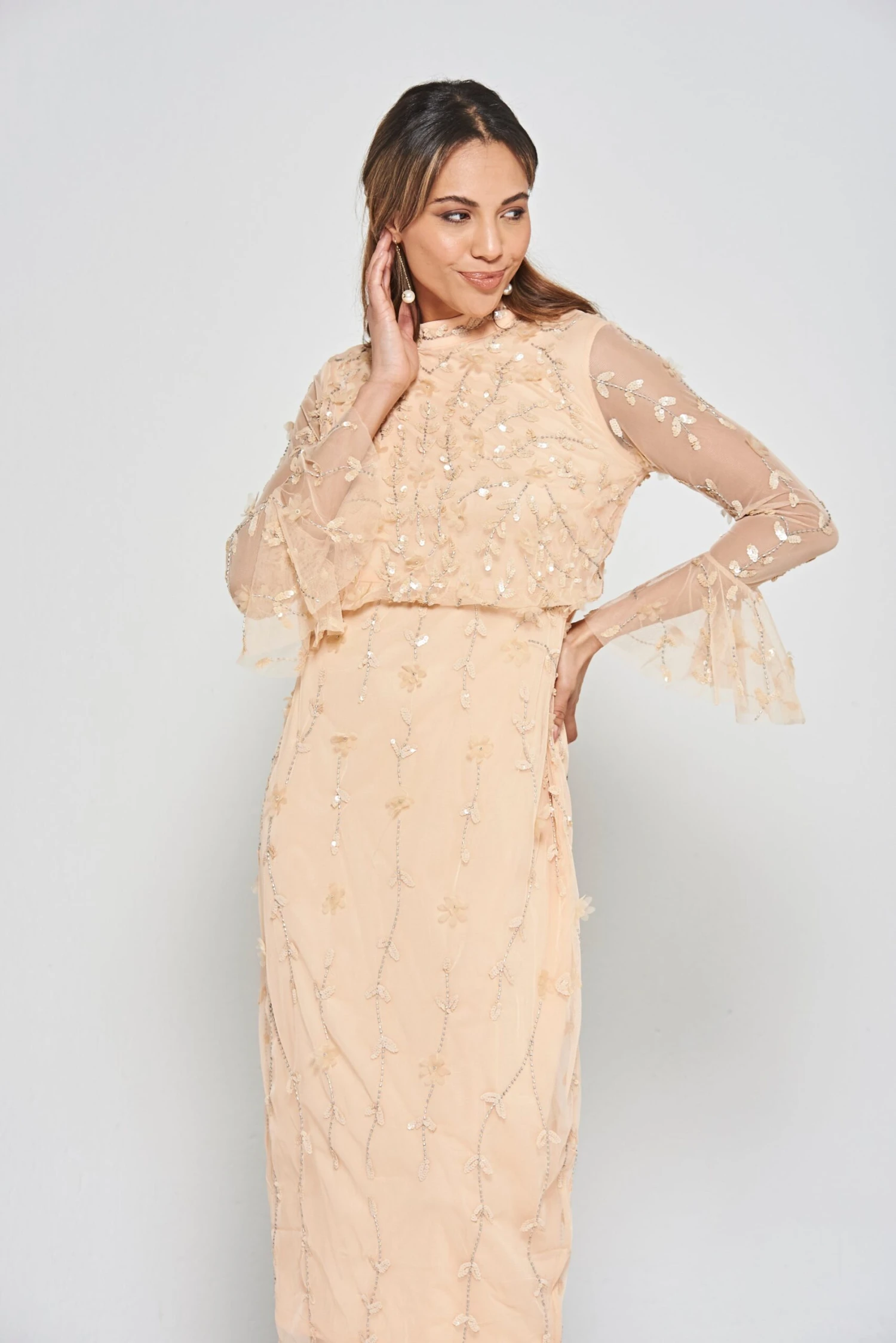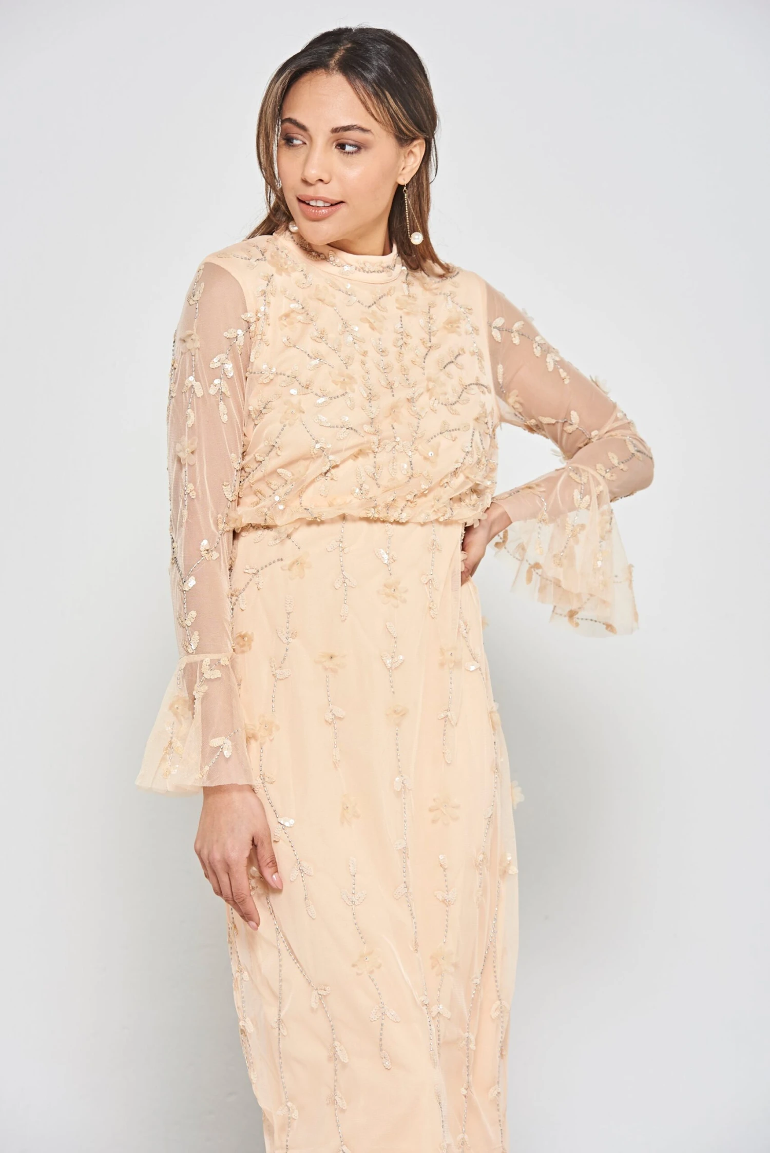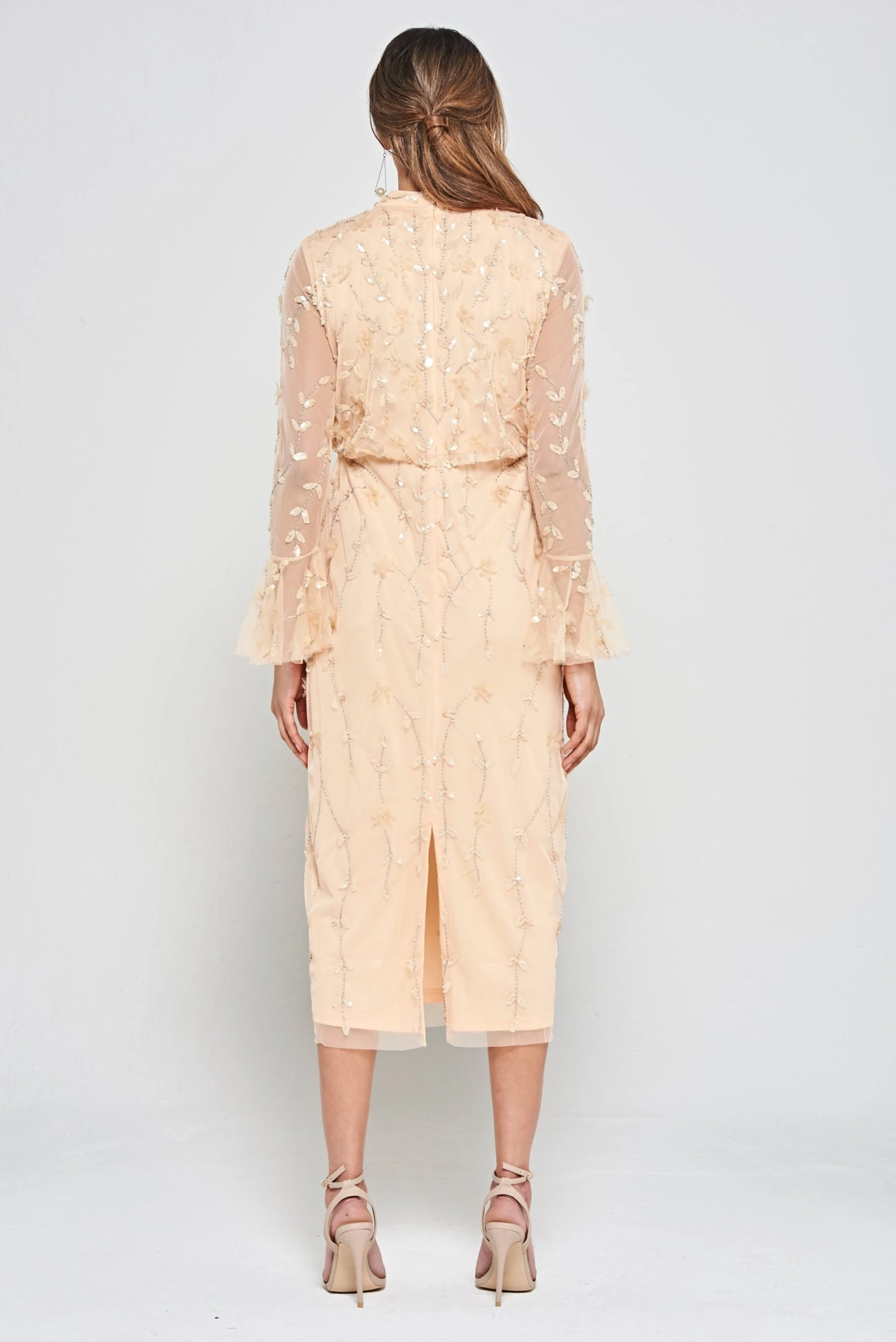 Ava Almond Sequin Midi Dress With Flared Sleeves
