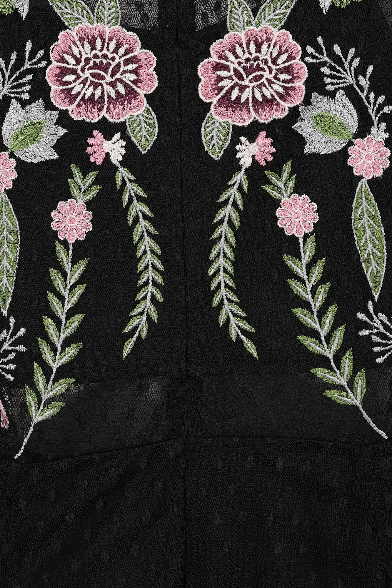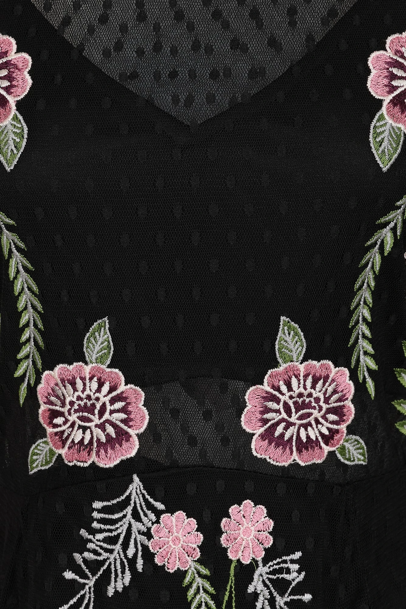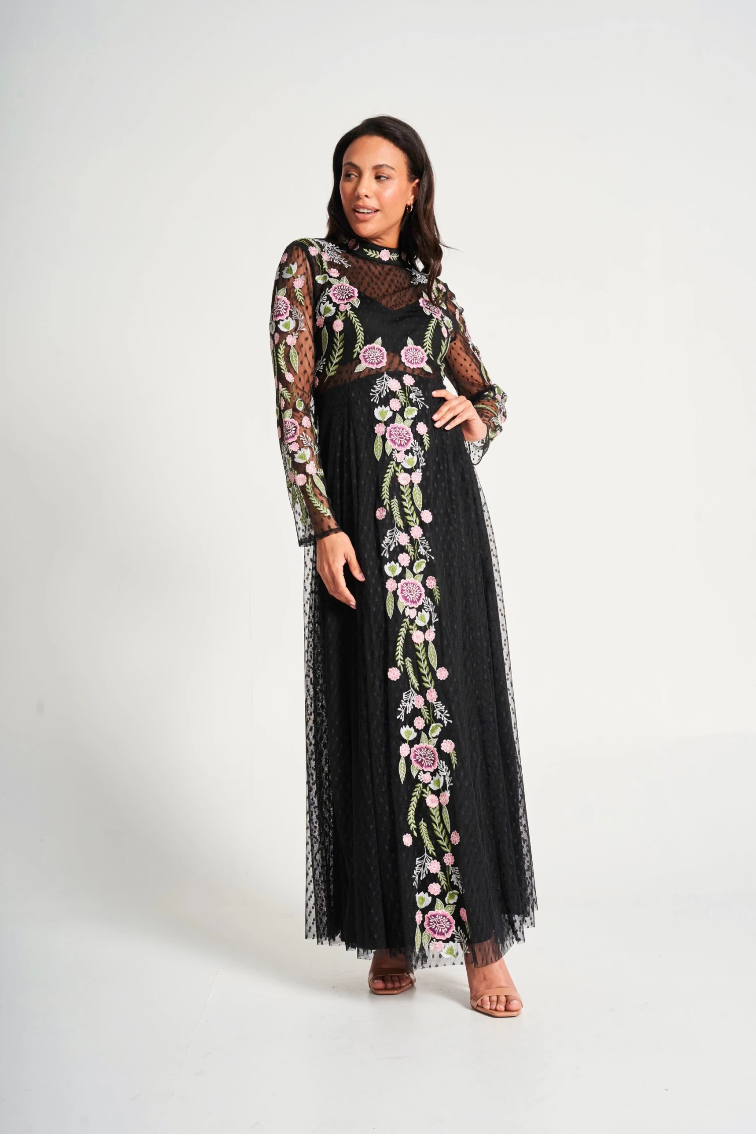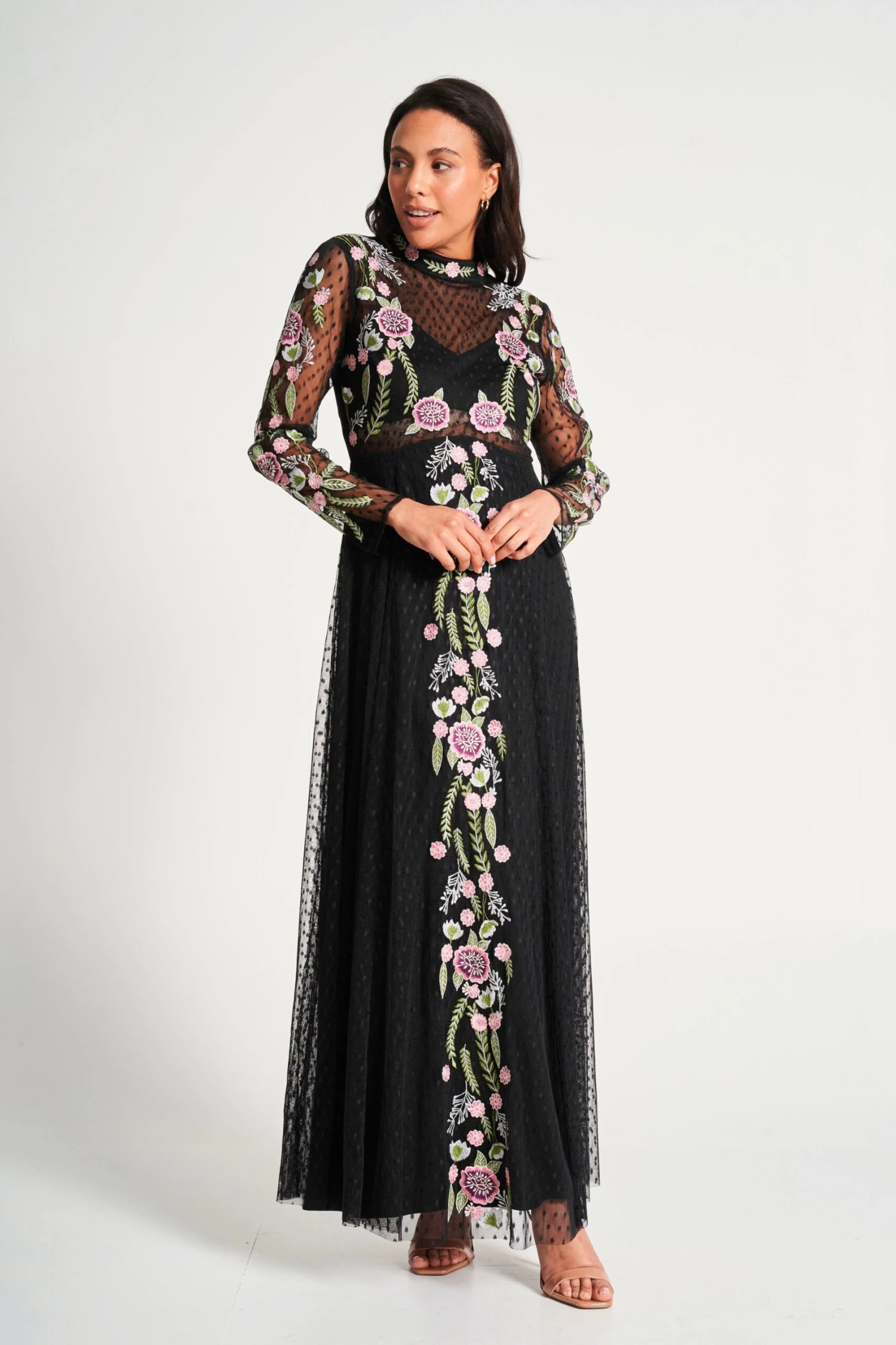 Realised in a polka dot dobby mesh, this long sleeved maxi dress boasts statement floral embroidery that trails across the sleeves and down the centre of the floor skimming skirt. Partially lined to showcase the waist, Azalea is complete with a high neckline and a concealed zip at back.