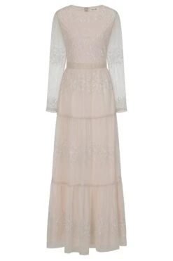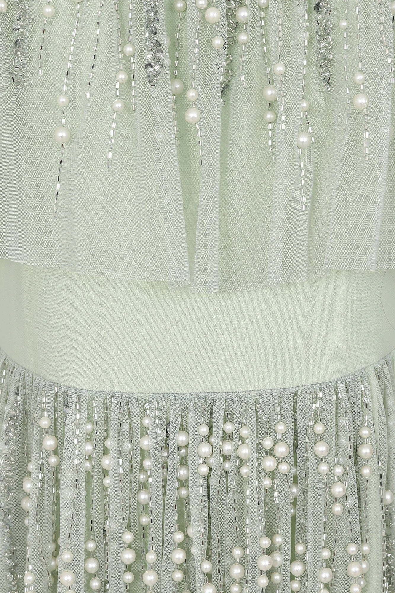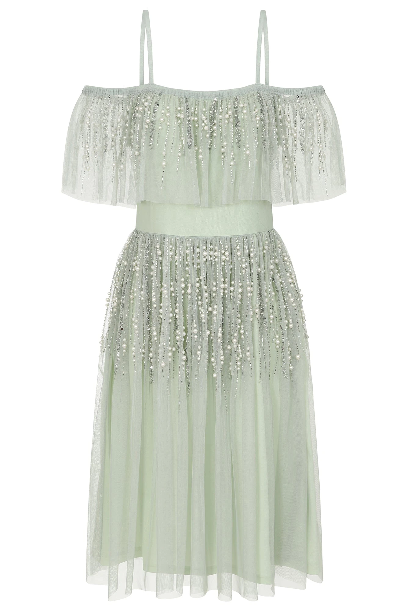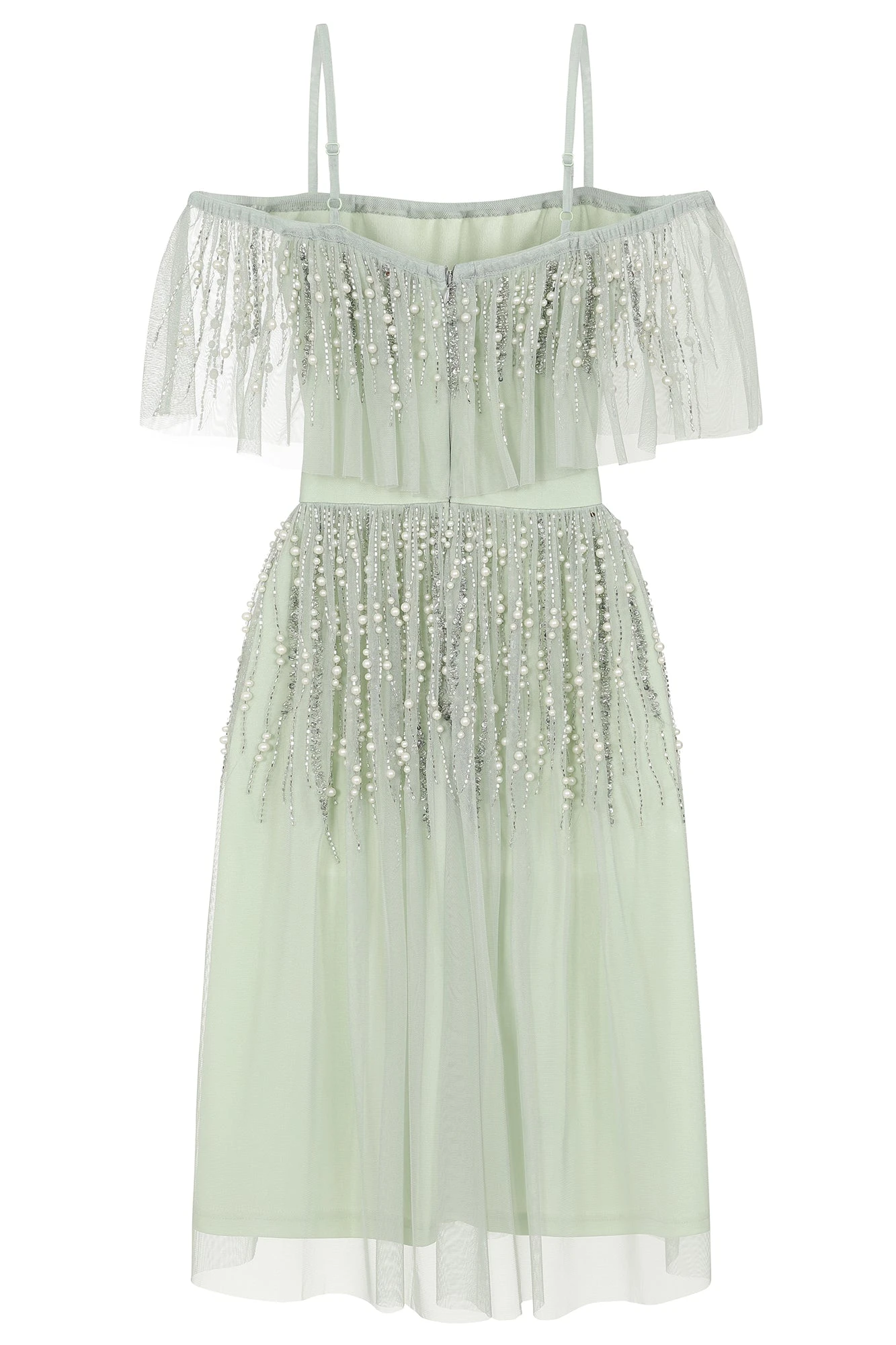 Gorgeous in seafoam green, our super sweet Betty is overlaid with gauzy mesh and decorated with shimmering strands of sequin and pearl embellishment. Designed with a Bardot style neckline, this off the shoulder midi is supported with adjustable cami straps.