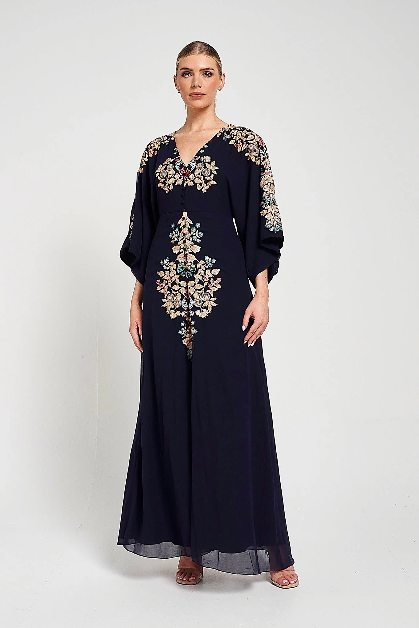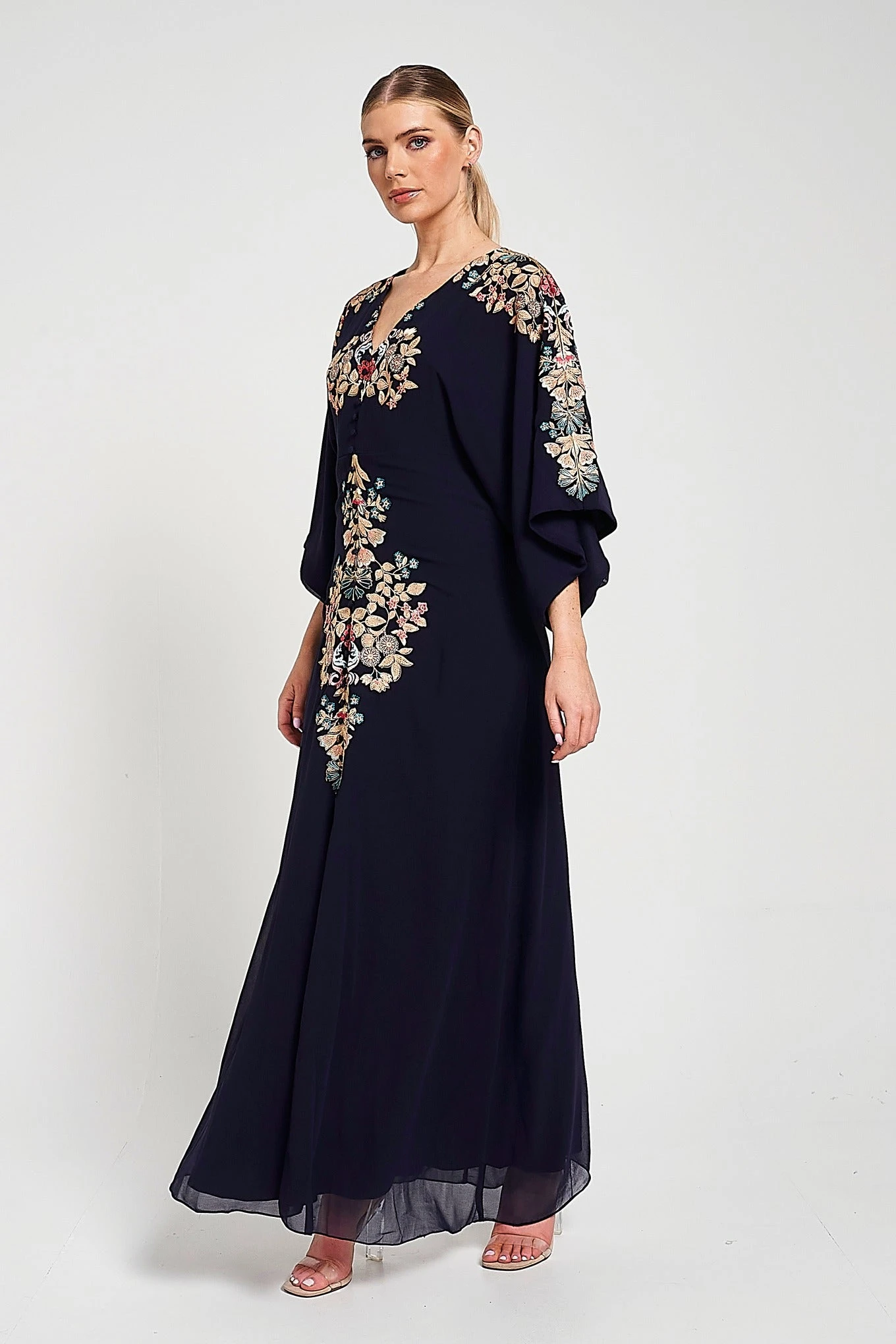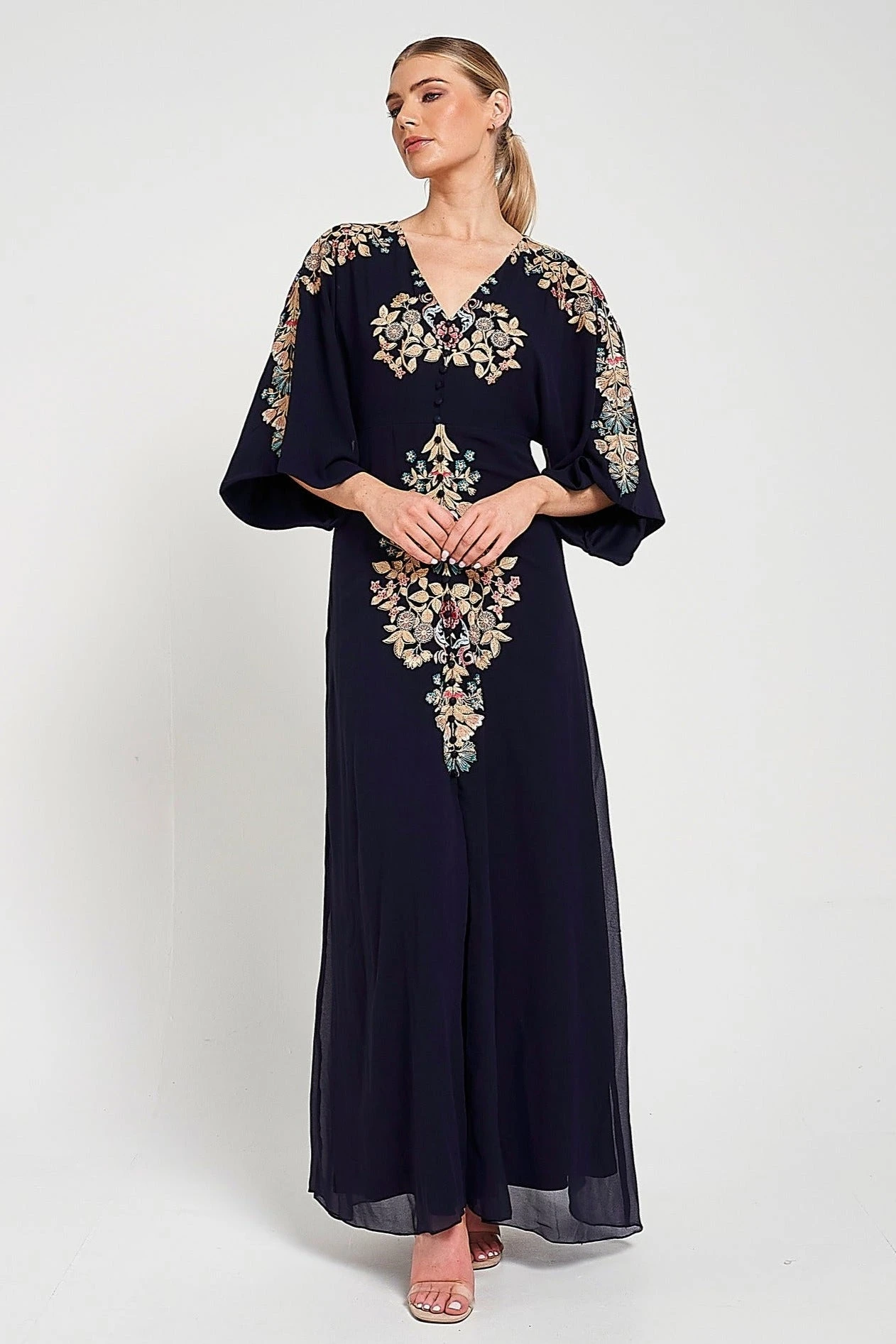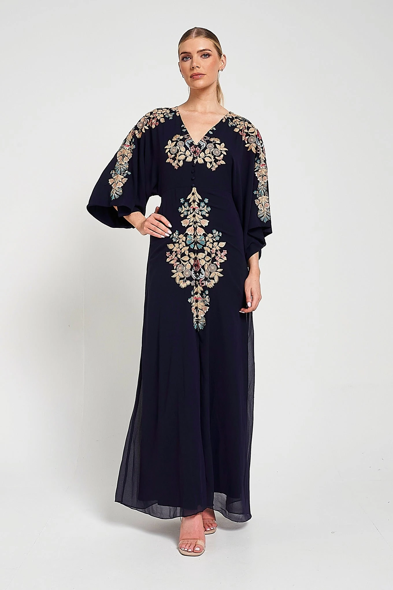 Briony Navy Embroidered Maxi Dress With Batwing Sleeves