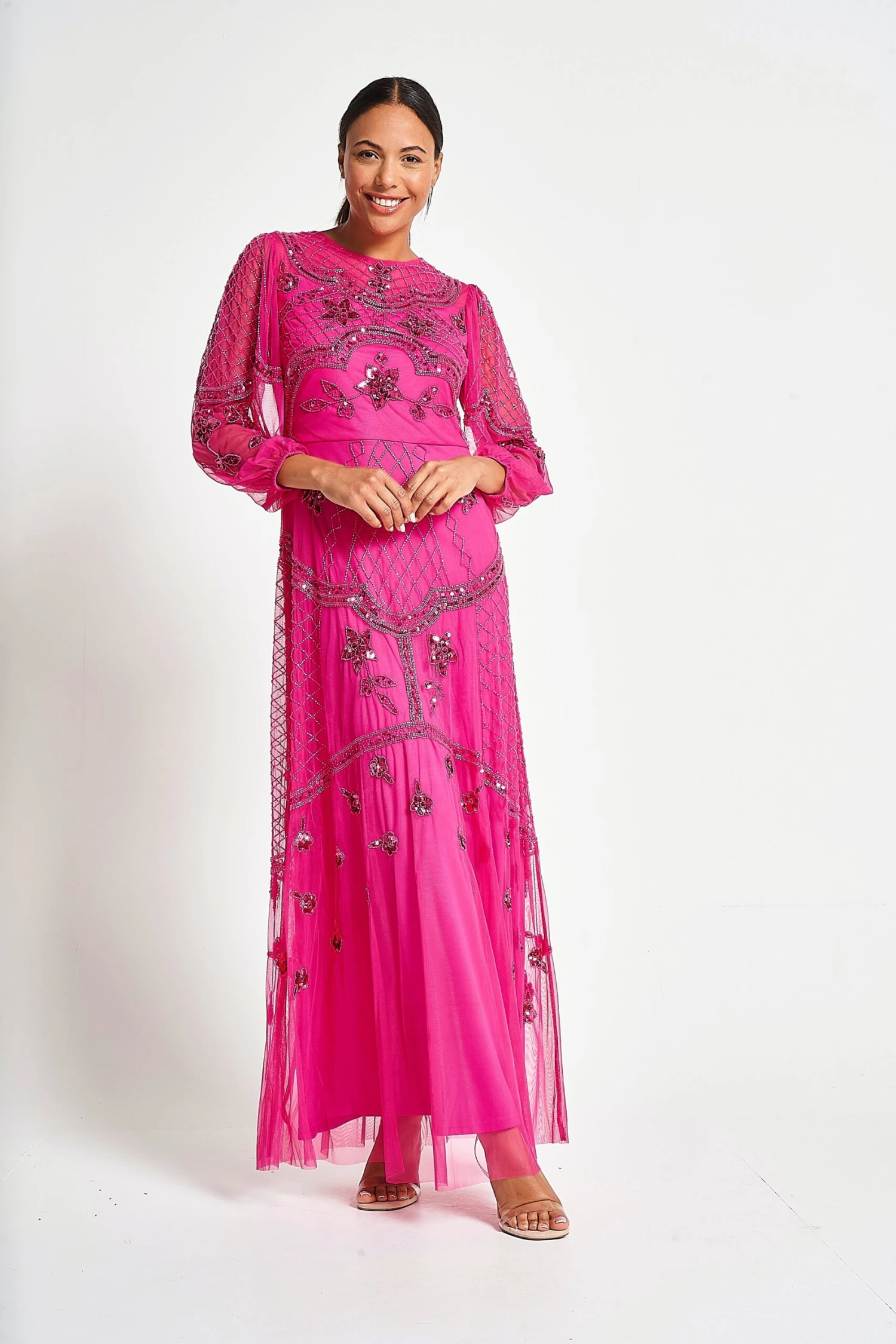 Fabulous in vibrant fuchsia red, Calanthe is simply show stopping. Embellished throughout with tonal bead work, this gorgeous gown is complete with sheer sleeves and a full length lining.