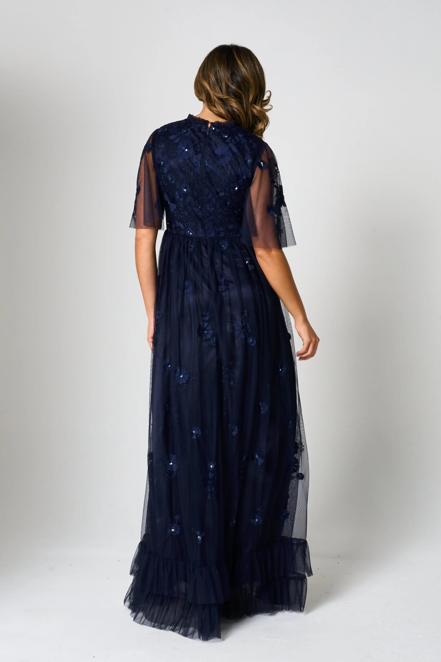 Introducing Callie: A classic navy maxi dress, imbued throughout with romantic detailing. Designed with a fitted bodice and flowing, full length skirt, this piece is complete with flared sleeves, floral embroidery and delicate ruffled trims.