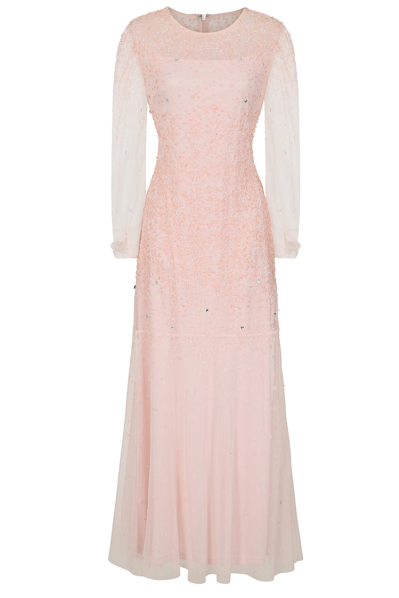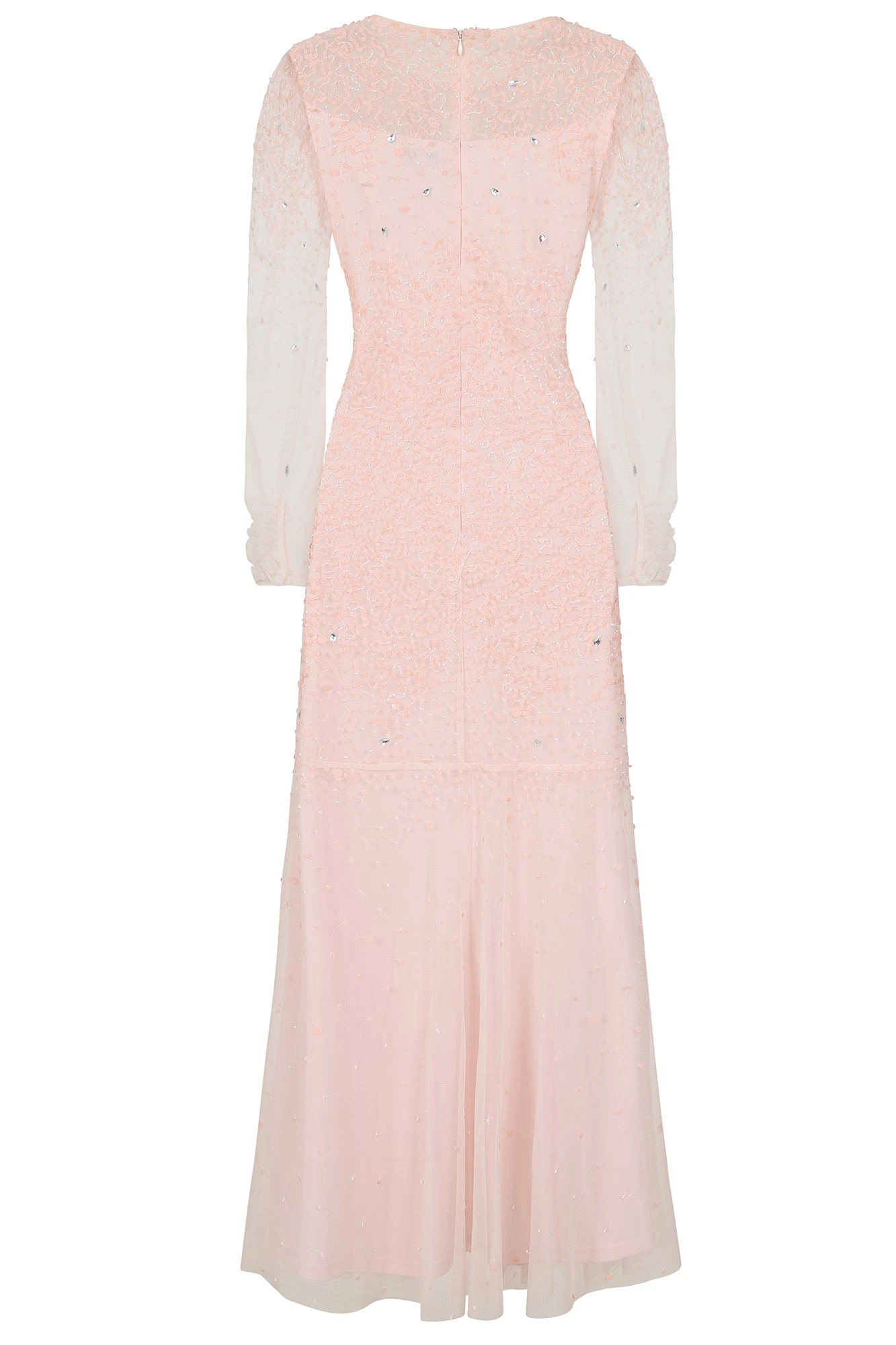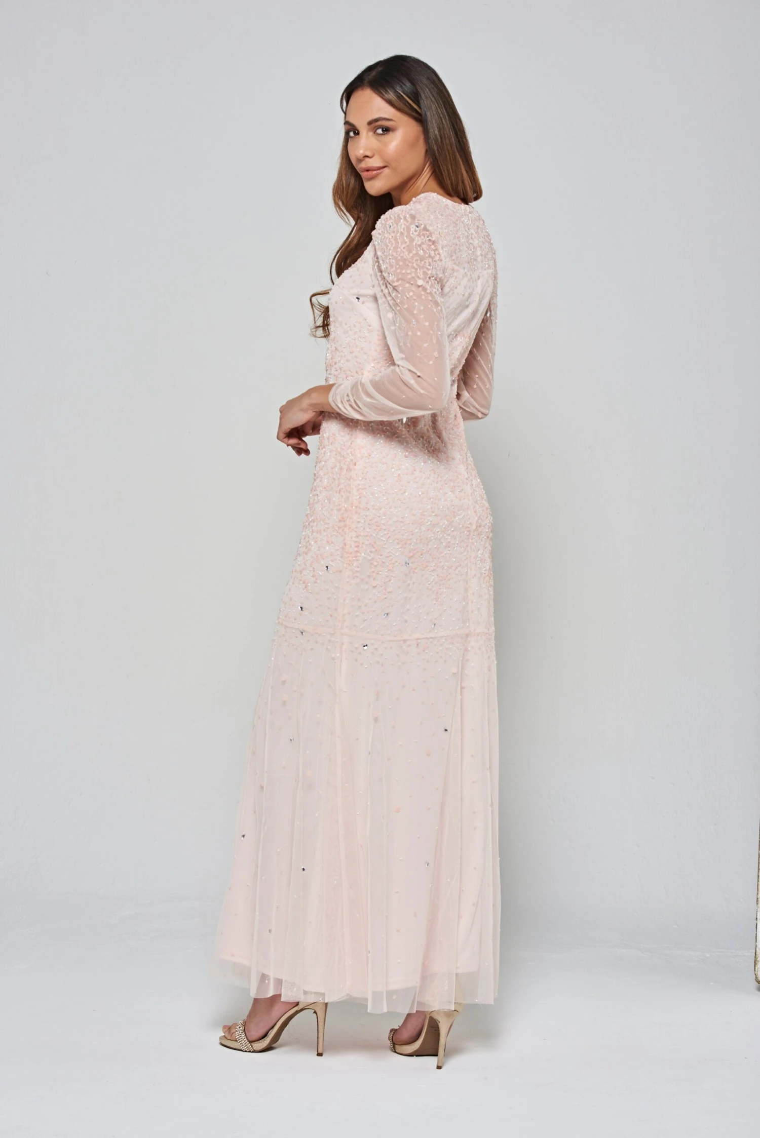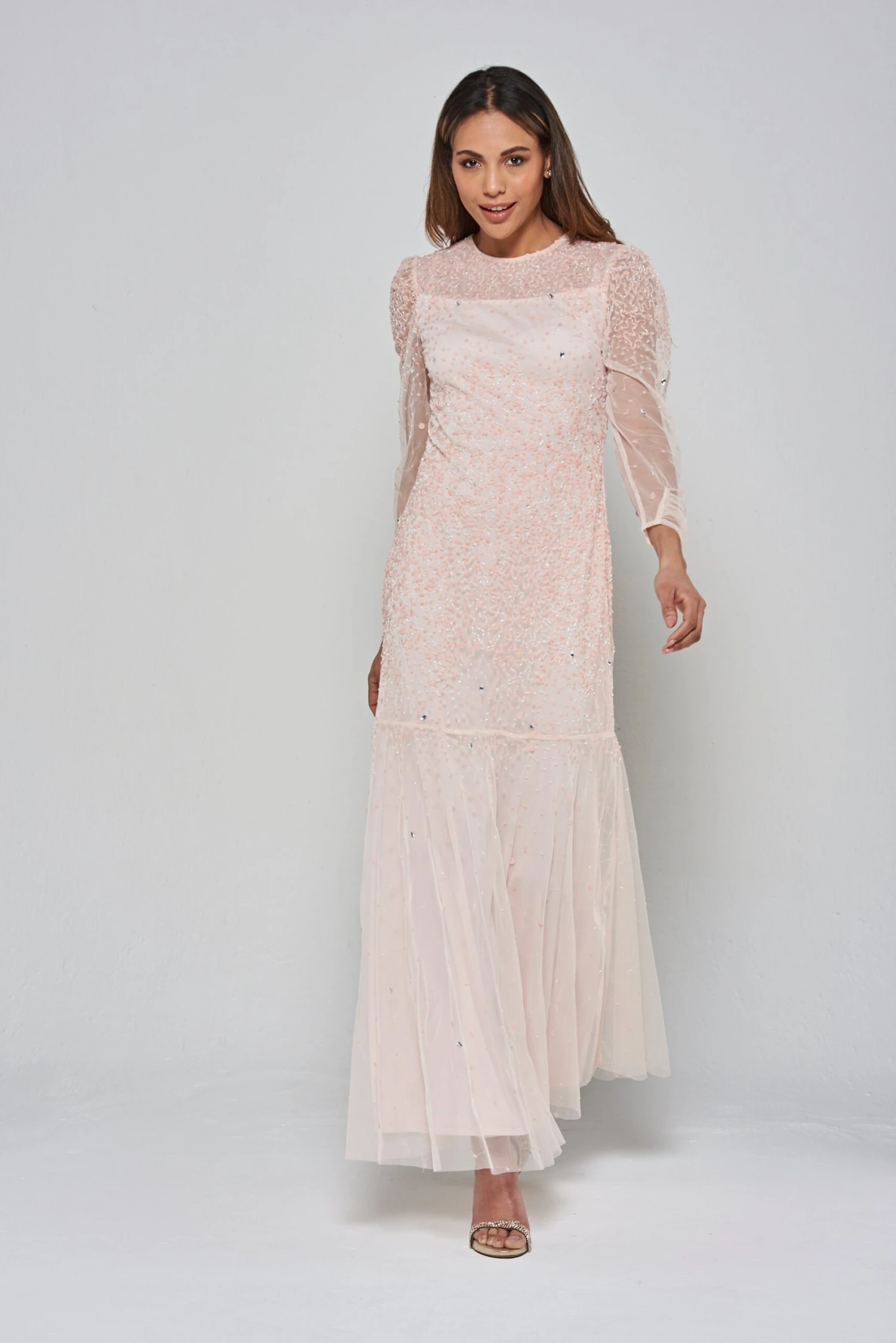 Look and feel your best this wedding season in the gorgeous Carolyn! Crafted in a lightweight, blush-mauve hued fabric, this maxi length gown shimmers with light-catching sequin embellishment. Flaring gently from the waist, Carolyn’s floor skimming skirt provides just enough volume for a dramatic entrance and all-night dancing! This long sleeved dress is complete with a concealed zip and ruched cuffs.