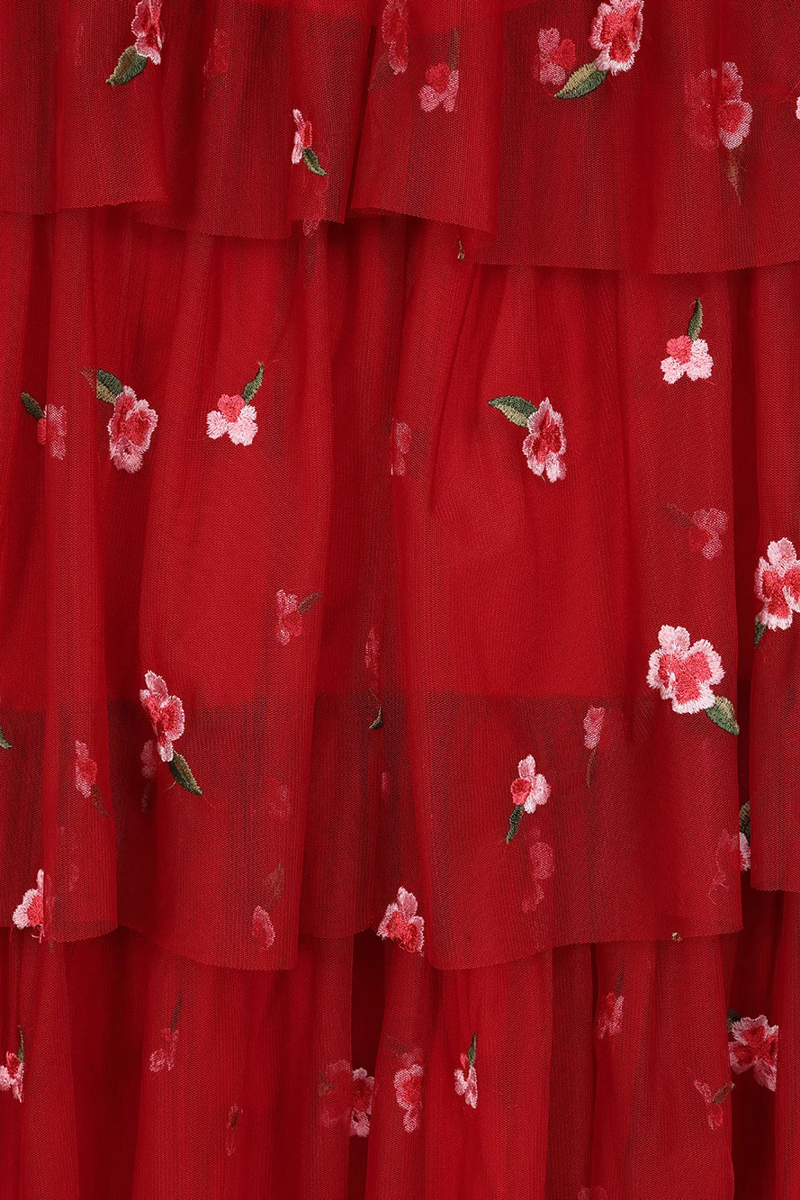 Turn heads in red with Carys. Populated throughout with pretty floral embroidery, this mid length dress is complete with a twirl-worthy tiered skirt and button detailing at the cuffs.