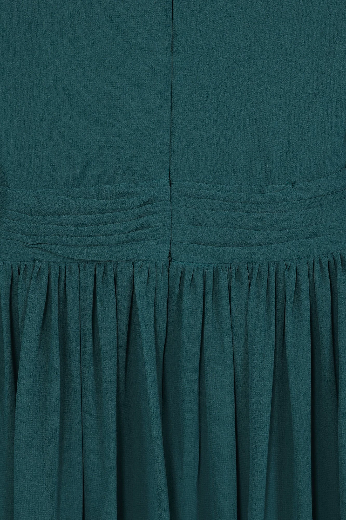 Ethereal elegance in emerald green. Designed with lightly voluminous sleeves and a gently flowing, full length skirt, gathered detail draws the eye to the waist whilst an embellished bodice adds a touch of sparkle.