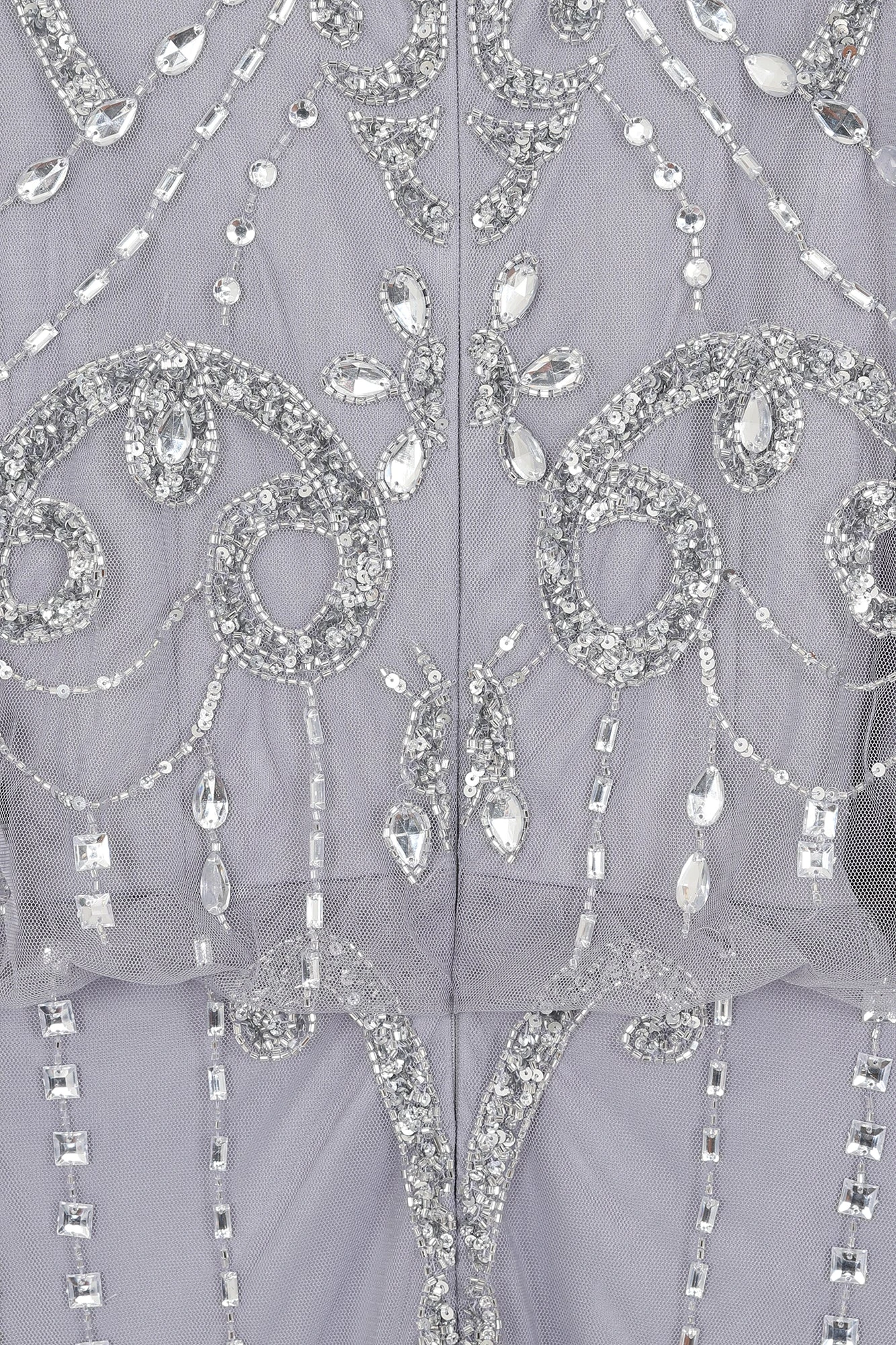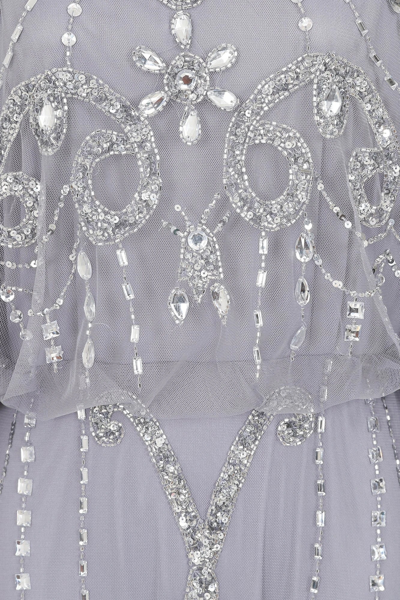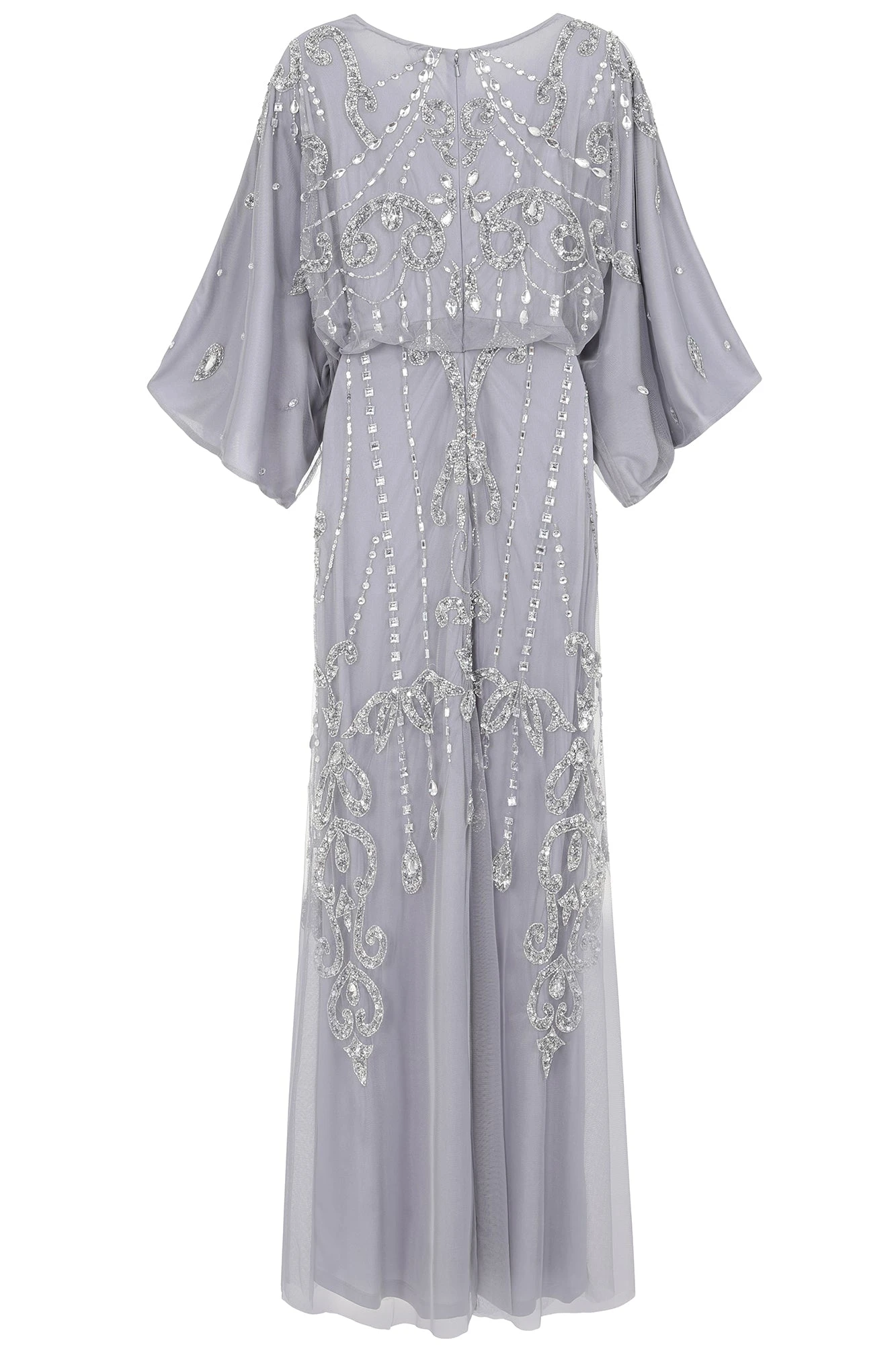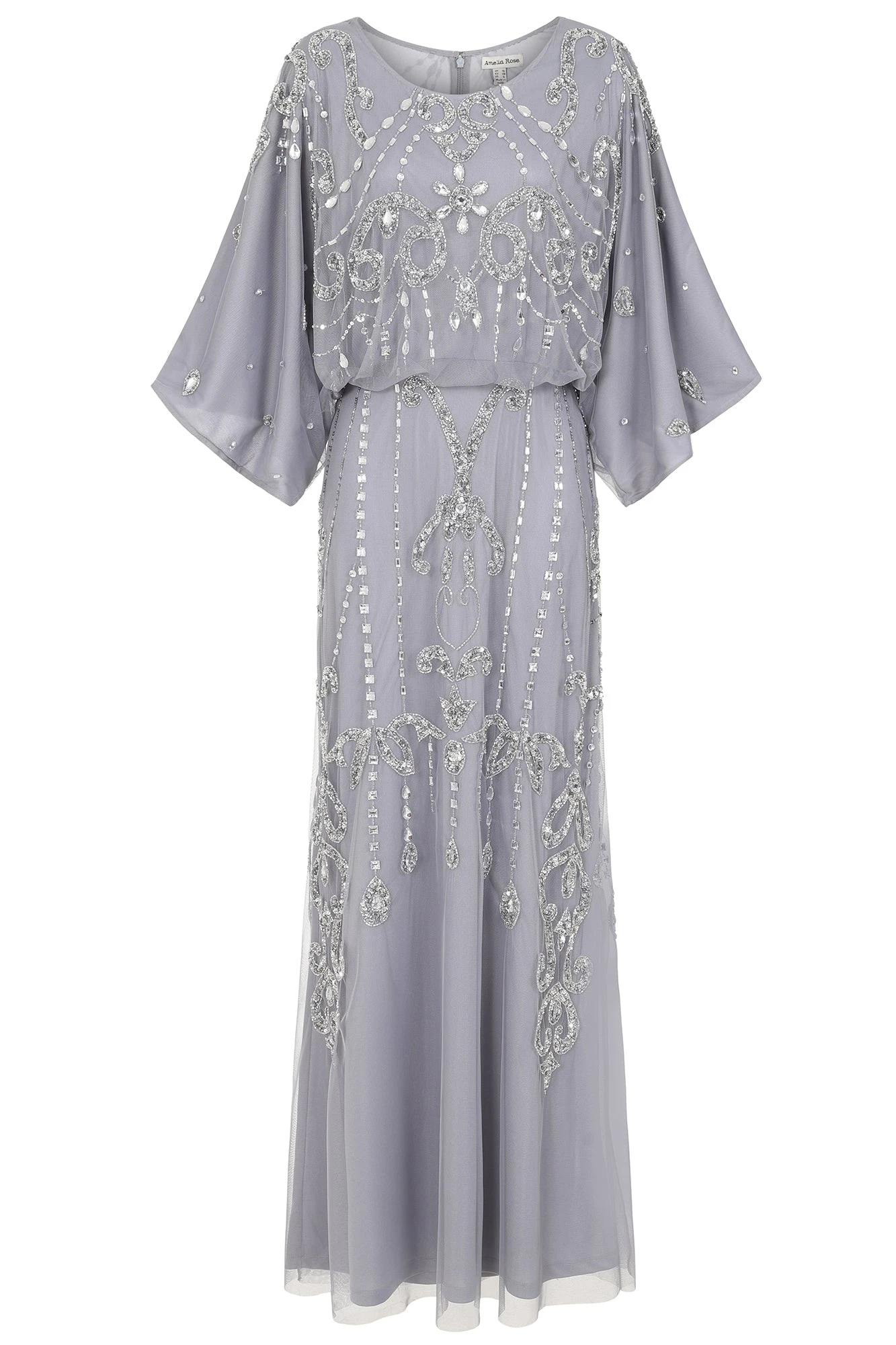 Now available in a delicate pale grey, our Christine dress sparkles with intricate silver beadwork, arranged in a vintage inspired motif. Cut in a relaxed silhouette, this elegant maxi boasts dramatic batwing sleeves and a flowing, full length skirt.