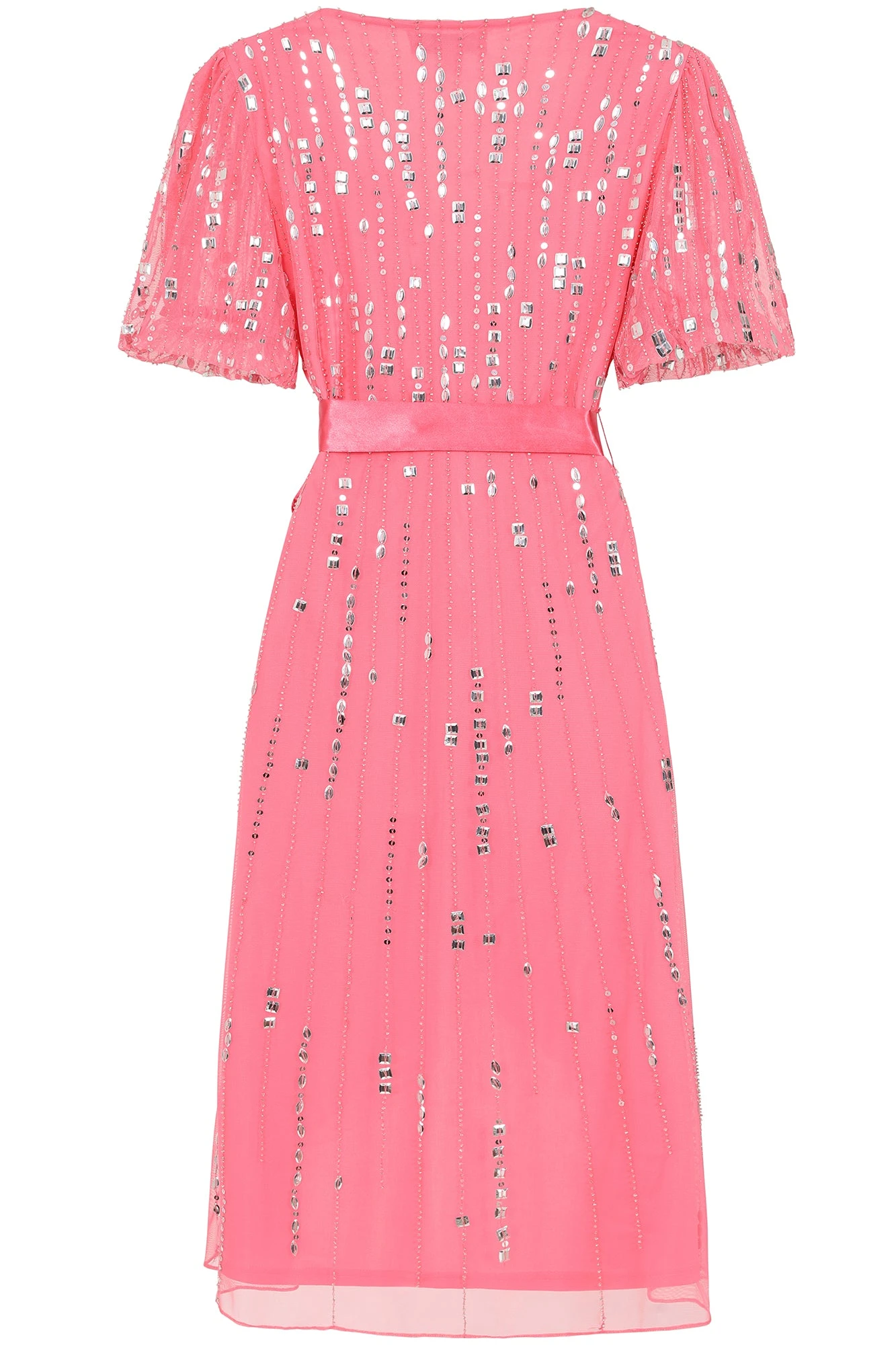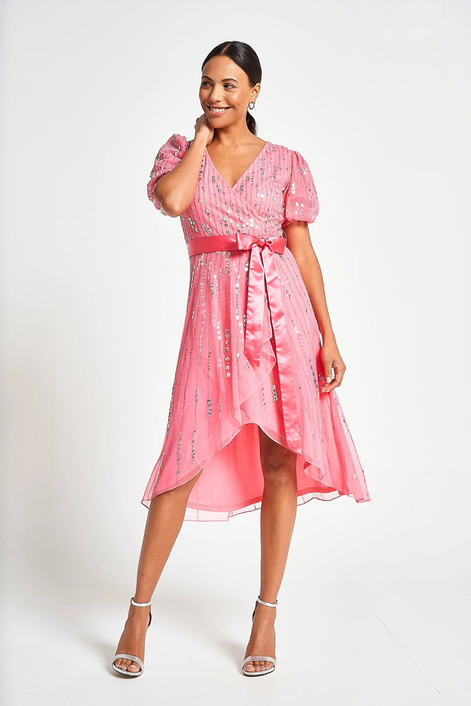 Bring a touch of joy to any special summer occasion with the strawberry pink Cleo. Designed in a faux wrap silhouette, this darling style features a dip hem, v neckline and sparkling silver embellishment. This knee length piece is cinched at the waist with a self tie satin bow.