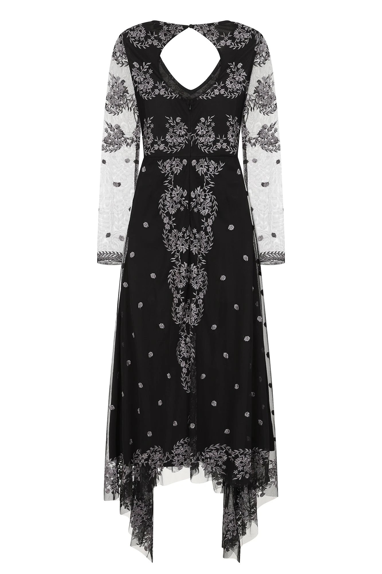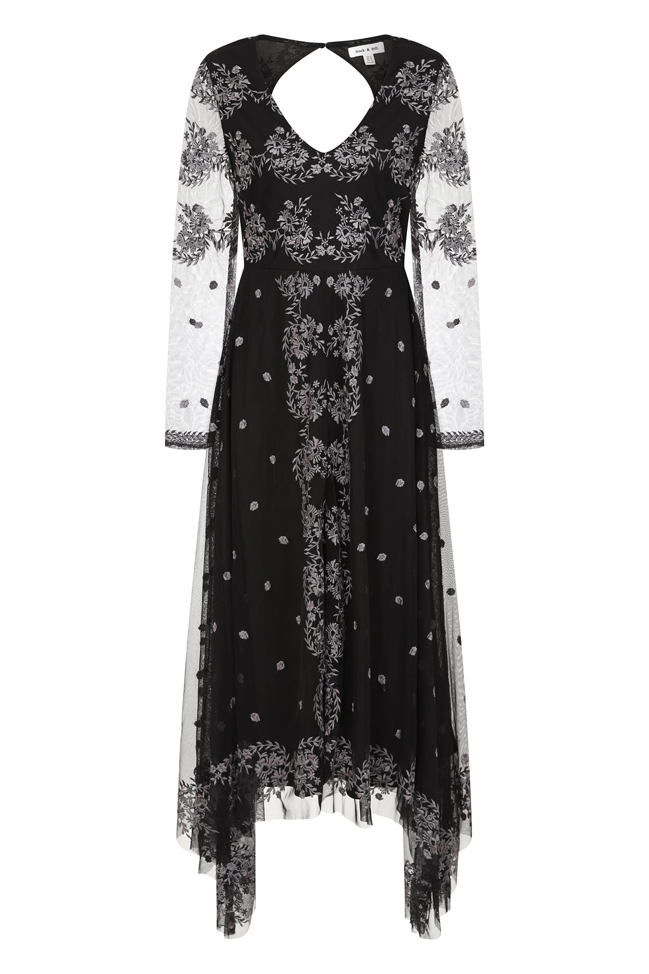 A dress that is all about the details, Colden is stitched throughout with soft grey embroidery, rendered in a vintage inspired floral motif. Designed with a laid back silhouette, Colden contrasts a fitted v neck bodice with a gently flaring skirt that falls to a midaxi length hanky style hemline. Colden is complete with long, sheer sleeves and a cut out detail at back.