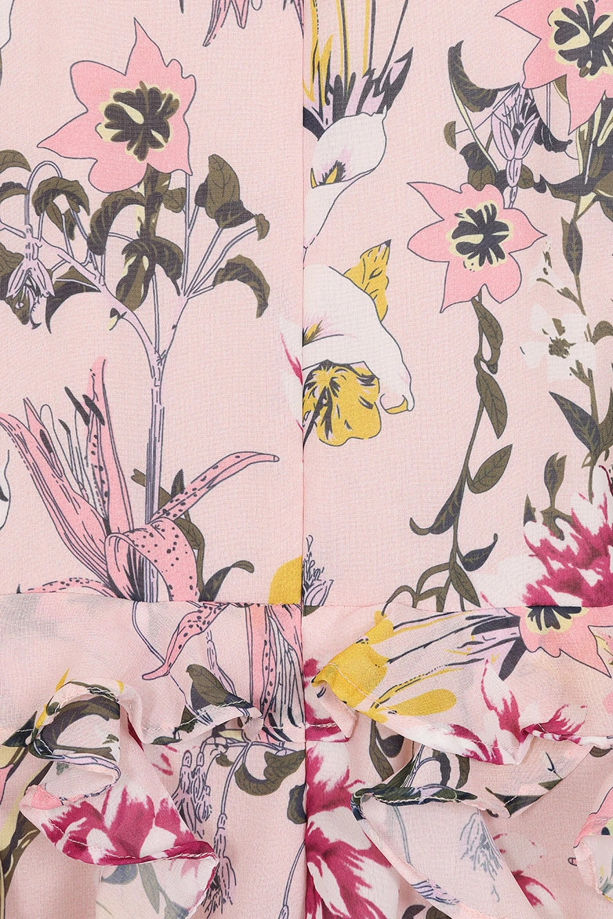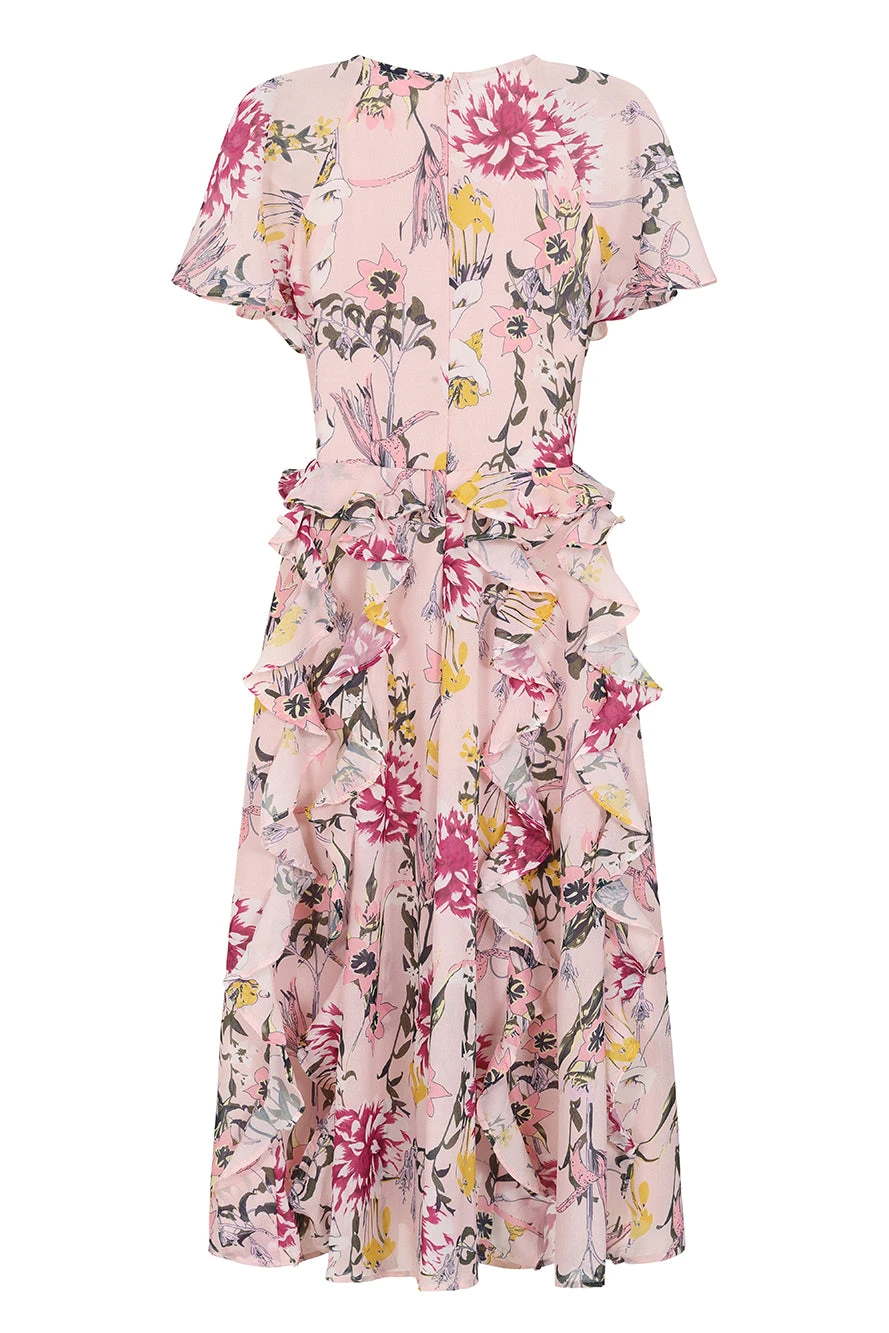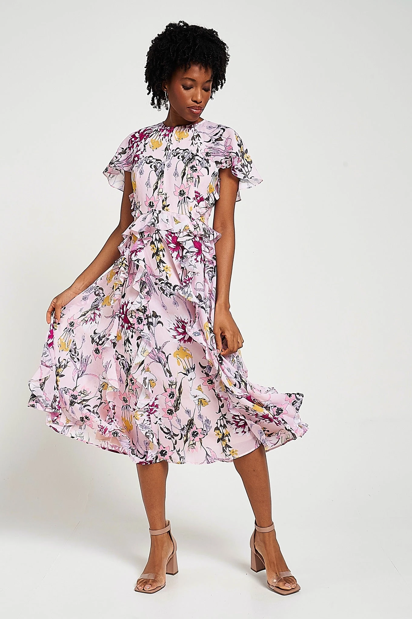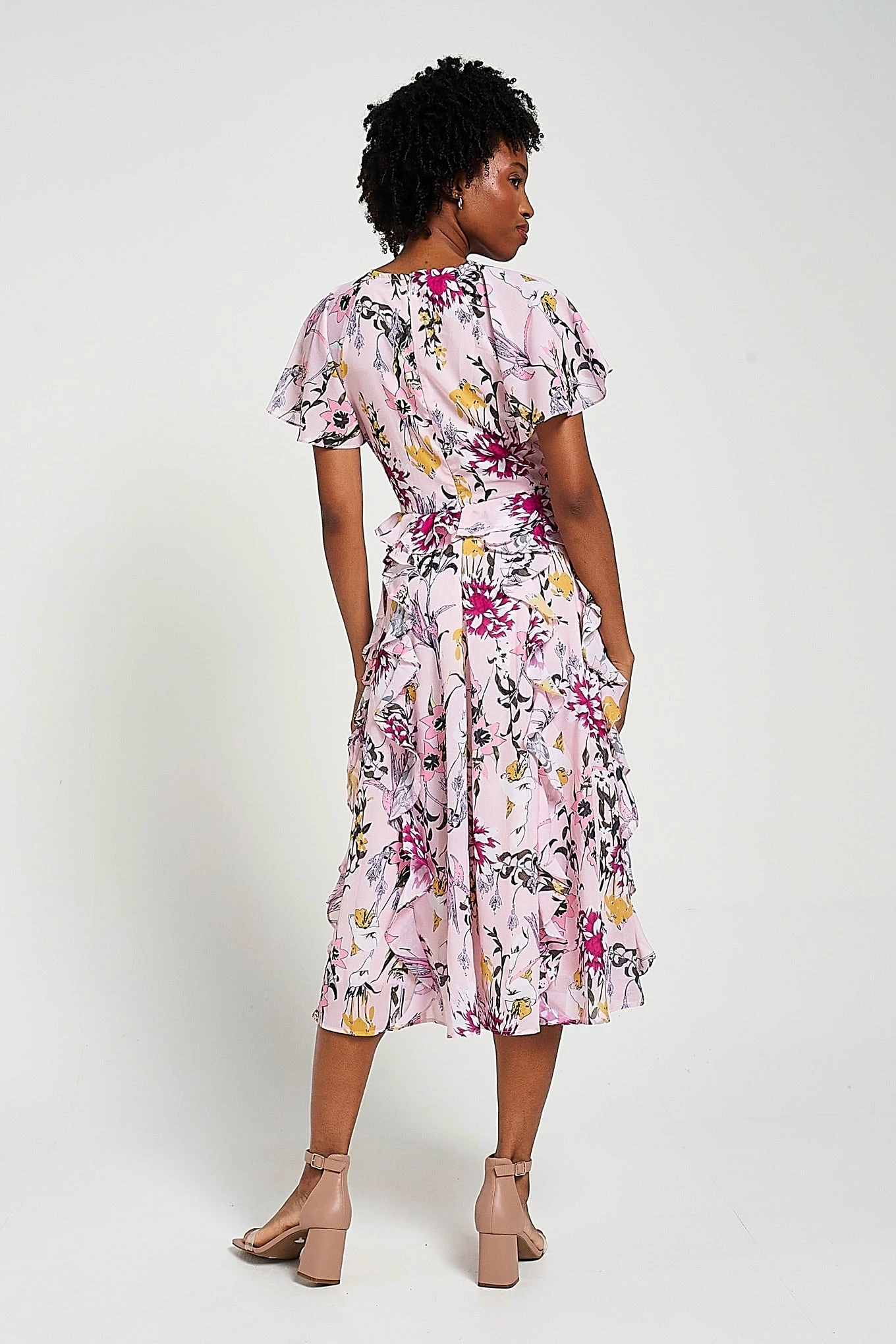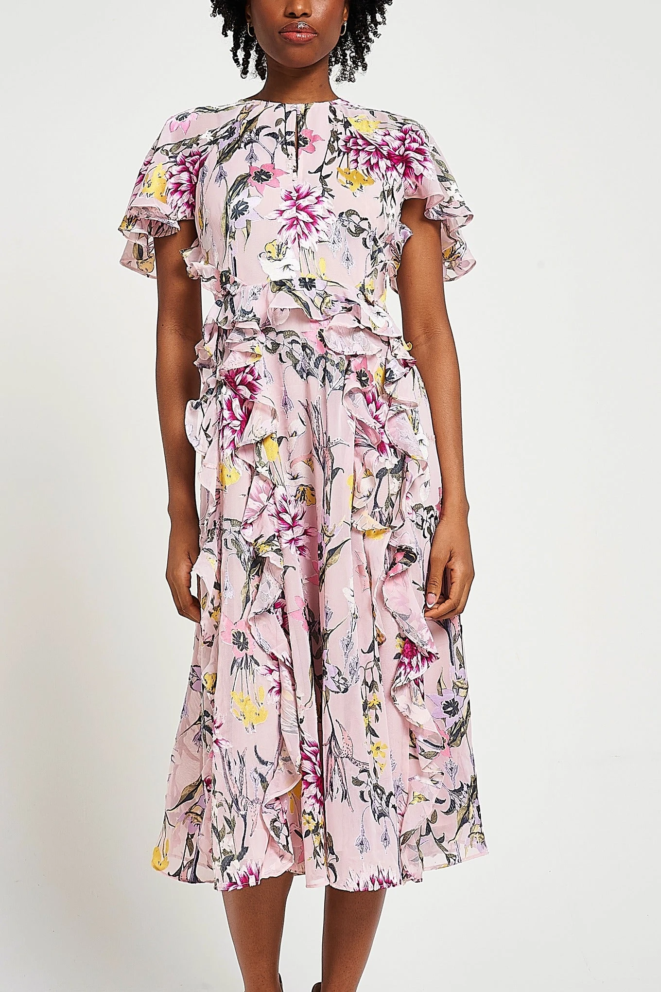Embrace full on romance for special spring days with Corinna. Crafted in a charming pink floral print, this feminine style is complete with ruffled detail that flows through the voluminous midi length skirt.