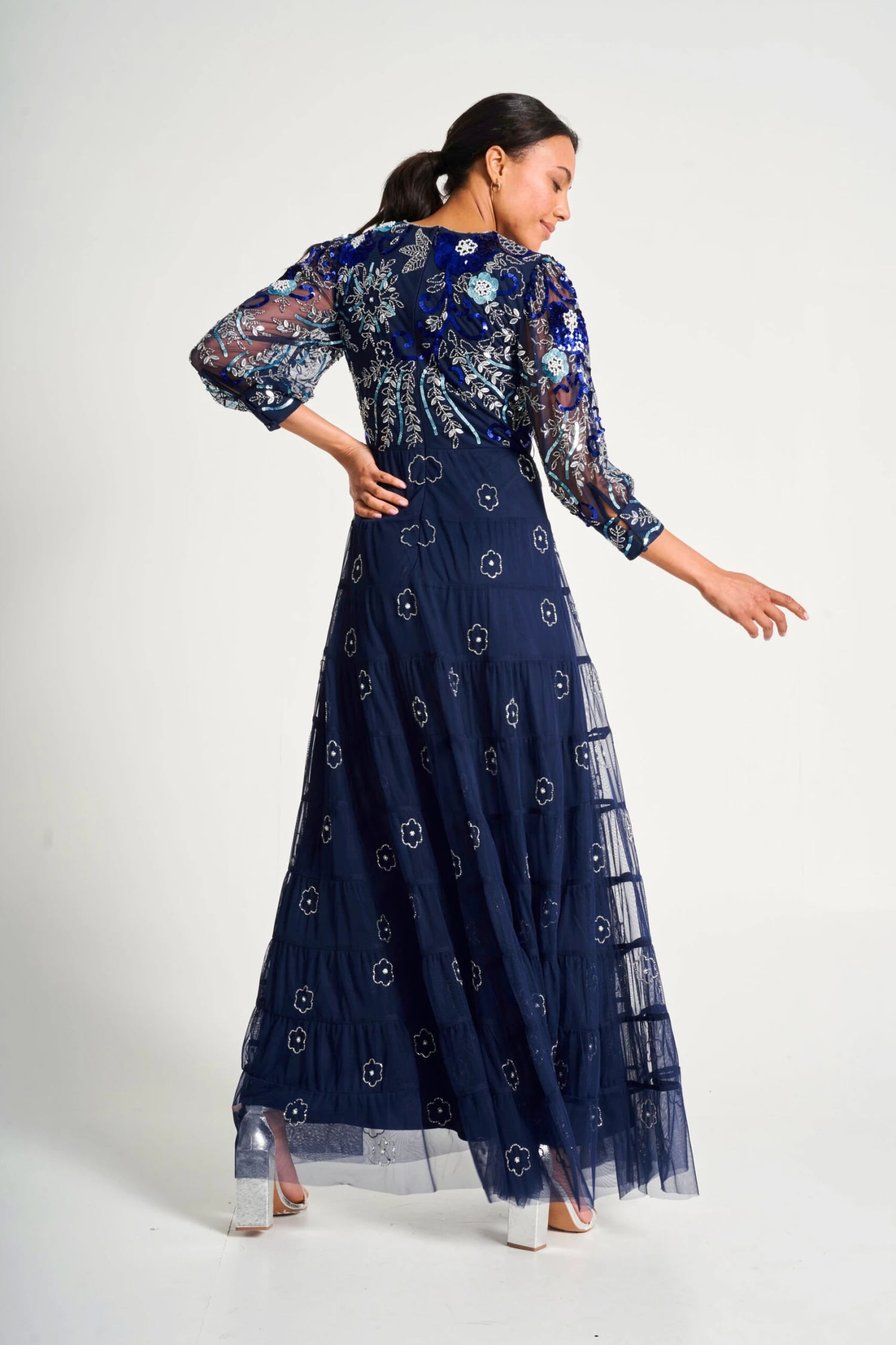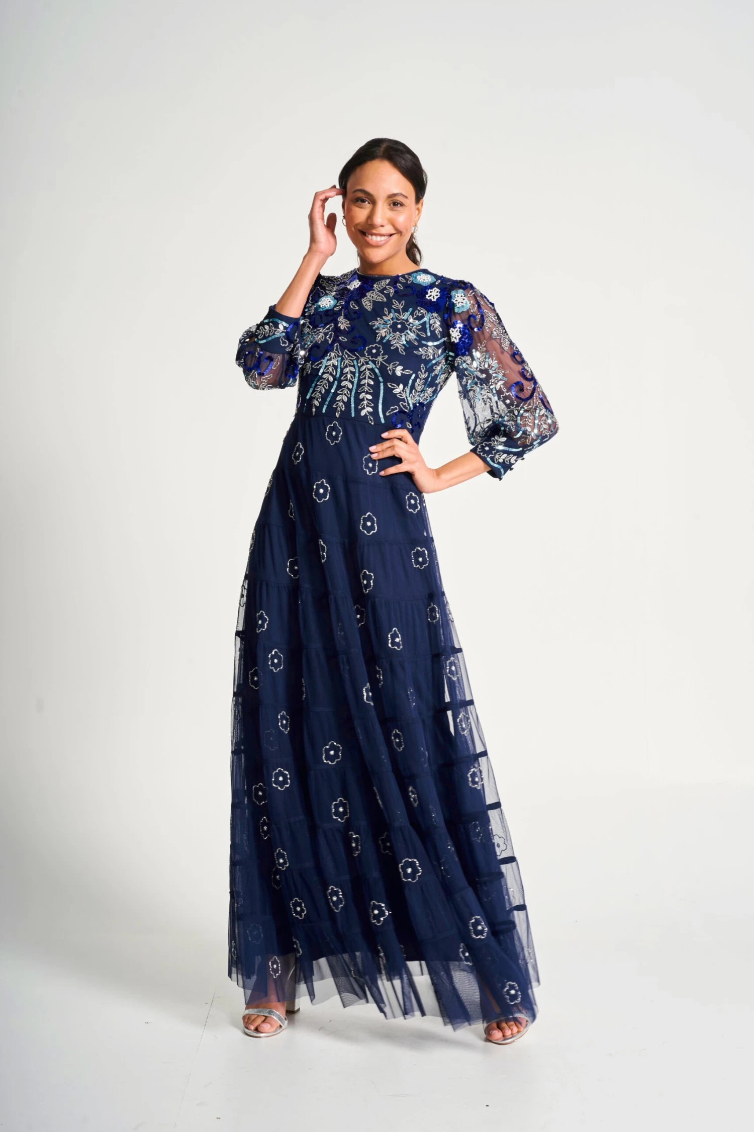 Boasting a bodice brimming with intricate, floral inspired embellishment, this long navy gown is guaranteed to be a special occasion showstopper. Maxi in length, the charming Dahlia is complete with 3/4 length sleeves and a tiered skirt.