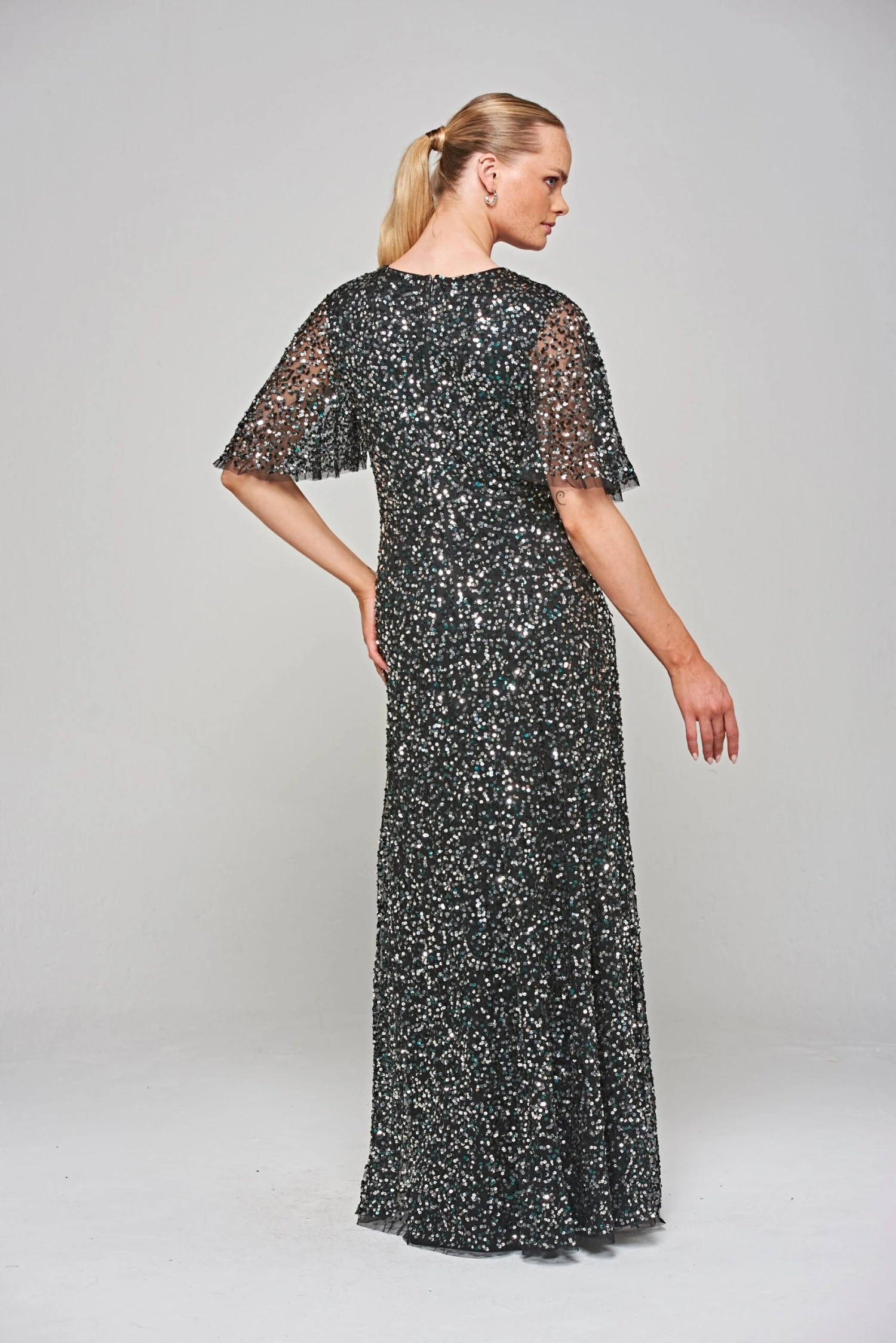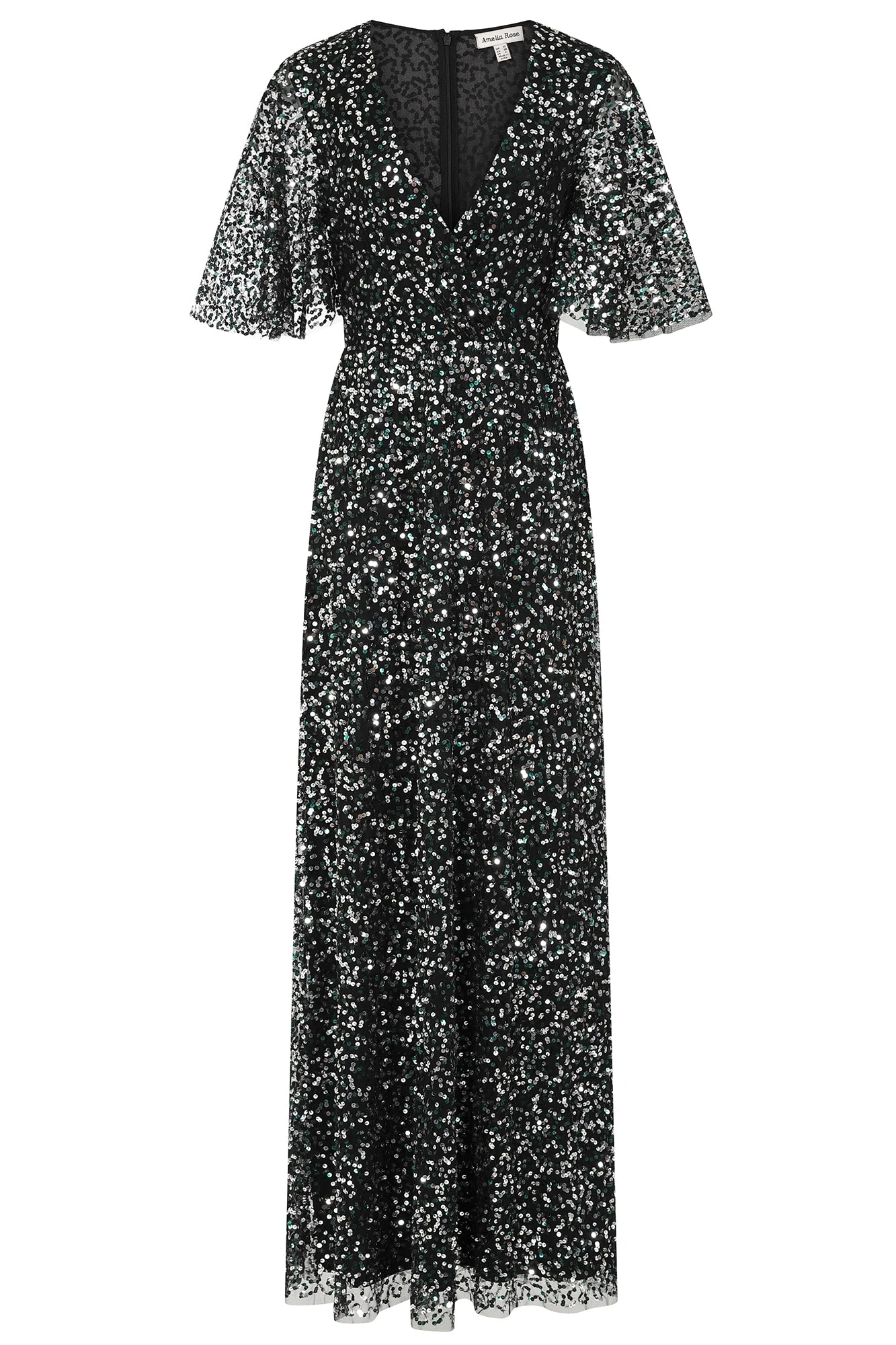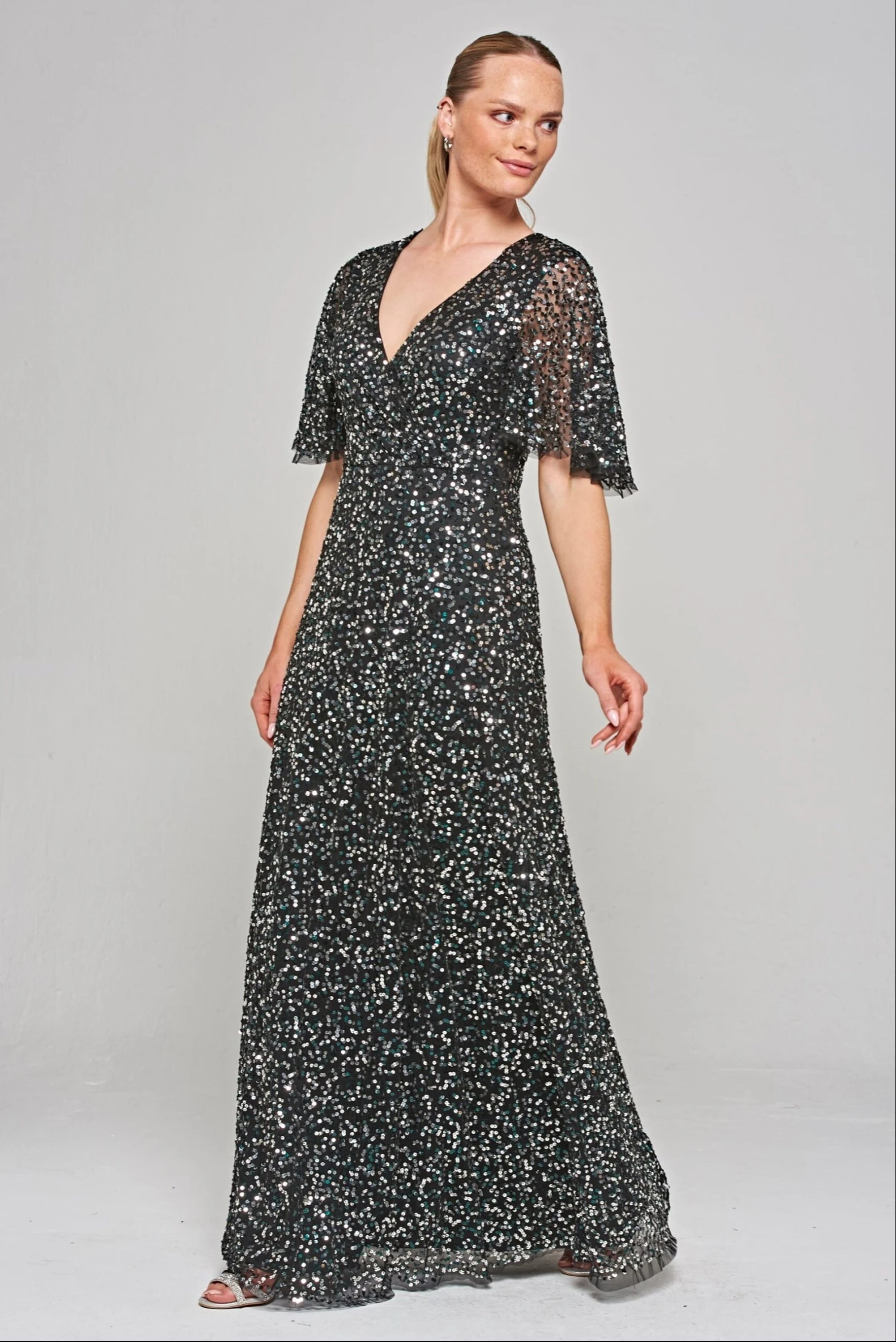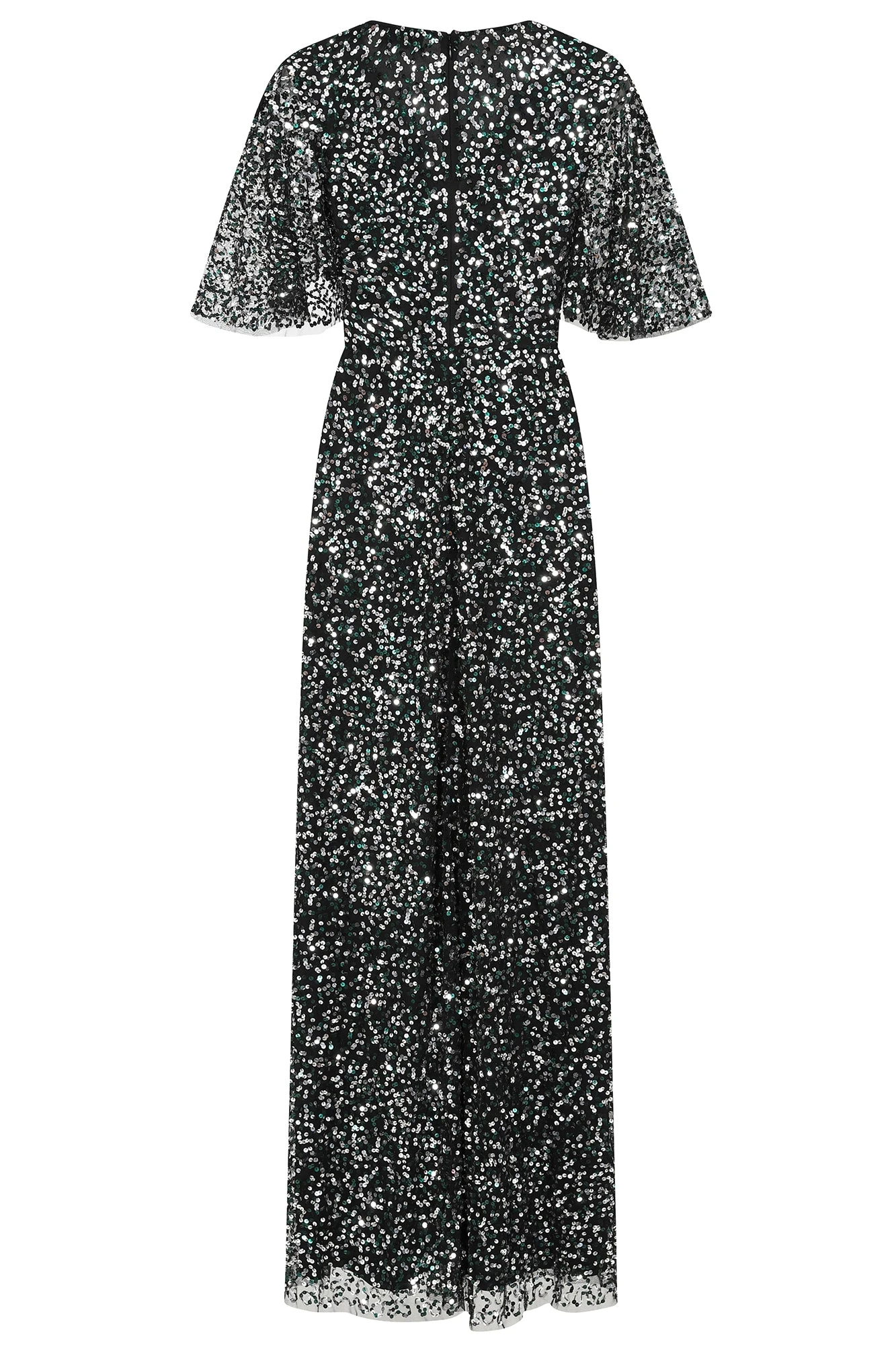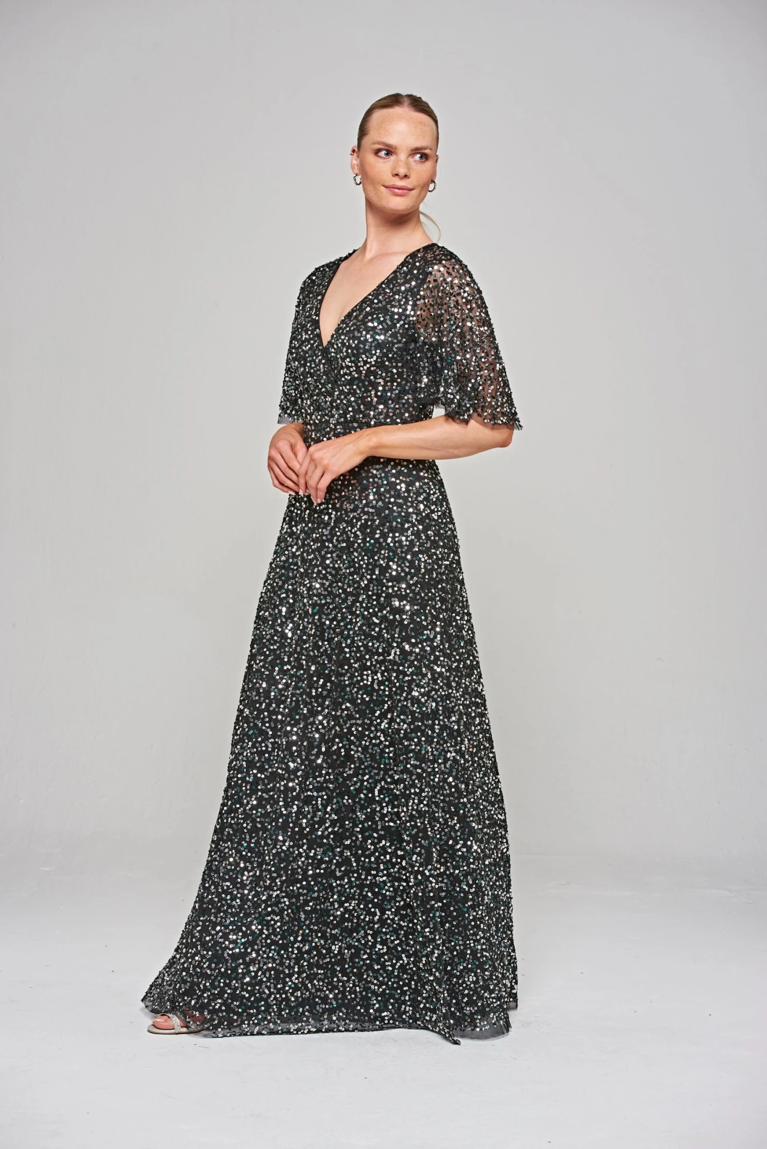 Shine bright this party season in the Dana maxi dress! Embellished throughout with thousands of green and silver sequins, this bewitching black maxi is complete with flared sleeves and a plunging v neckline. Pair Dana with sparkling silver accessories for instant special occasion glamour!