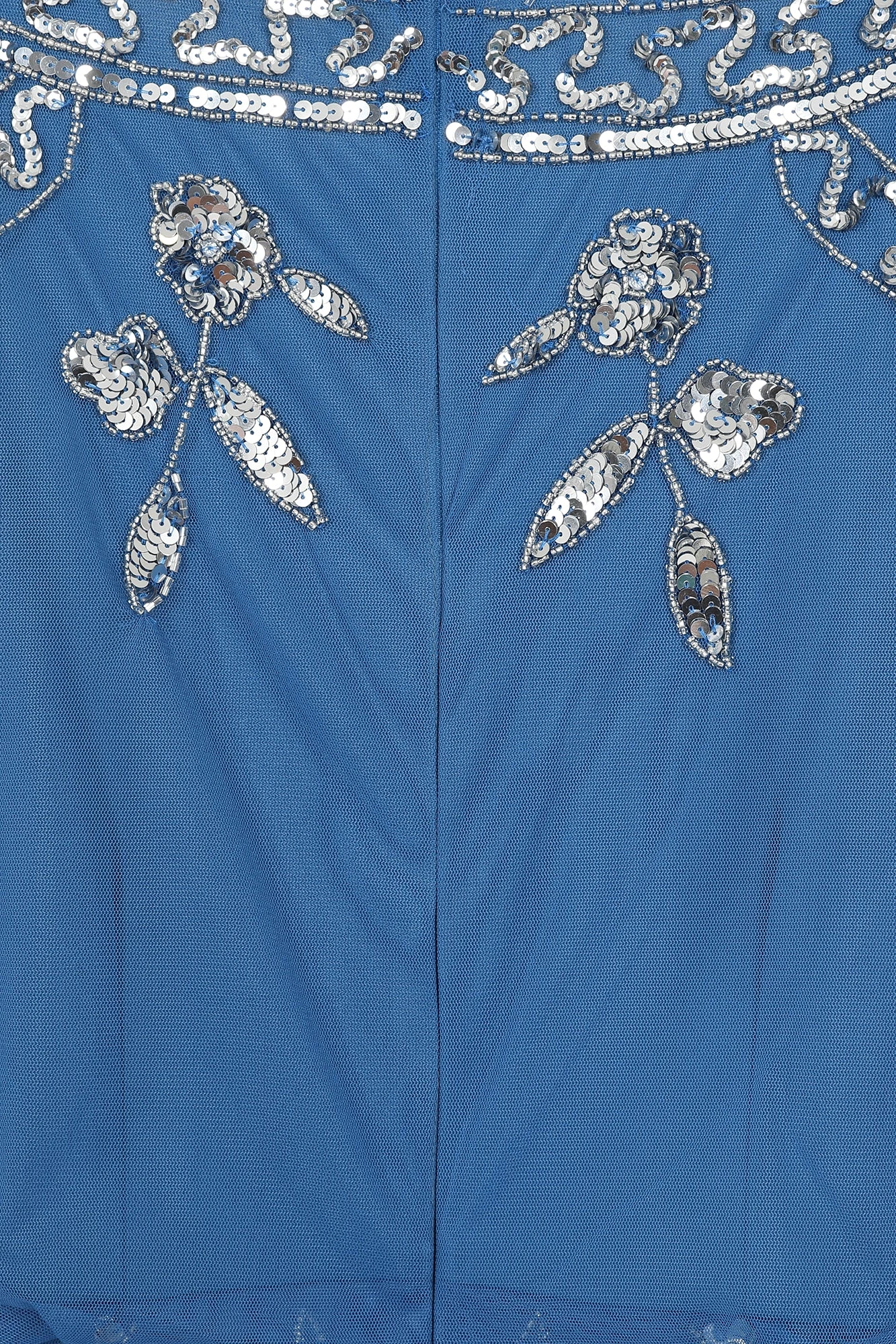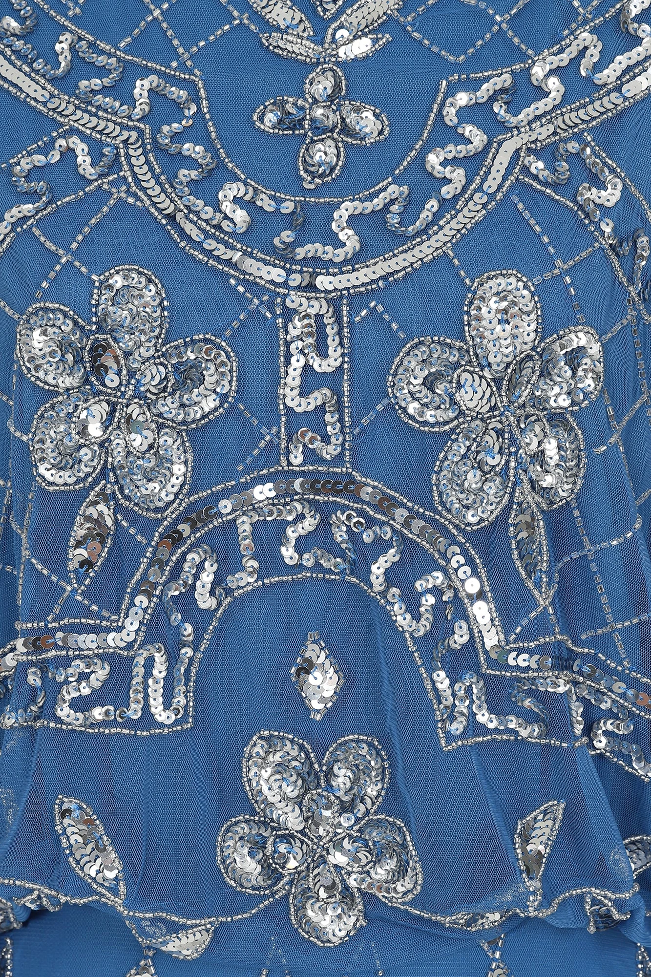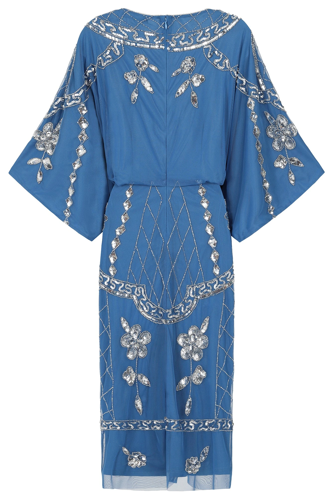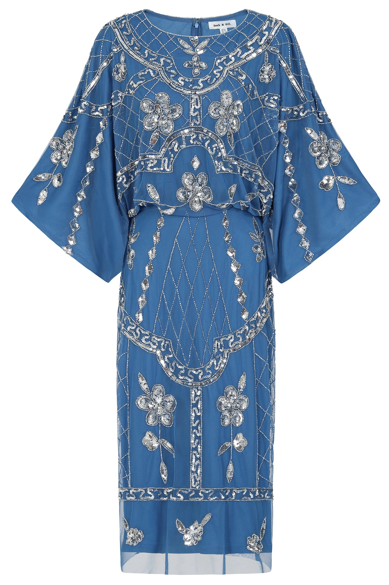 Realised in classic blue and embellished throughout with silver beadwork, Danica is the perfect plus-one for wedding season. Showcasing oversized, batwing sleeves, this eye-catching feature is contrasted with a nipped in waist and body skimming mid length skirt. Style with silver accessories.