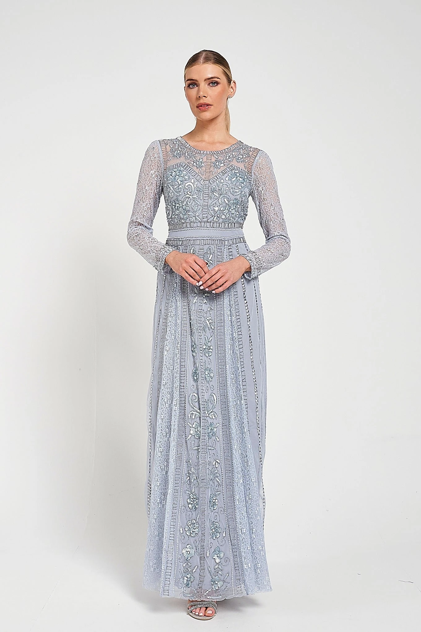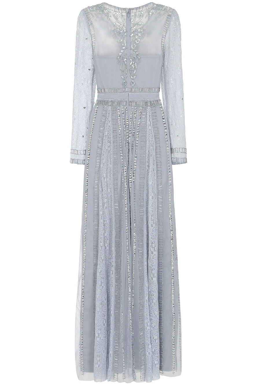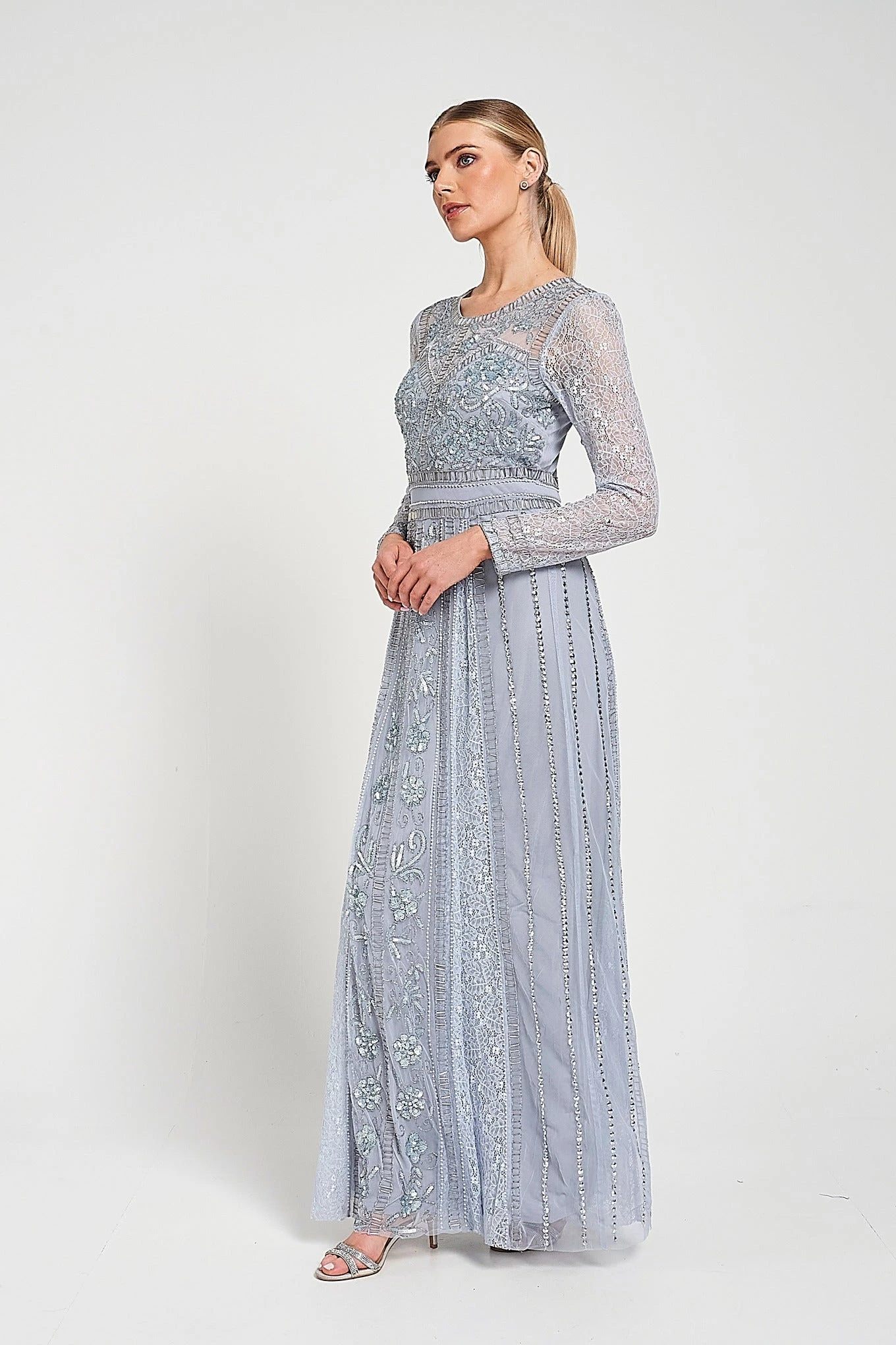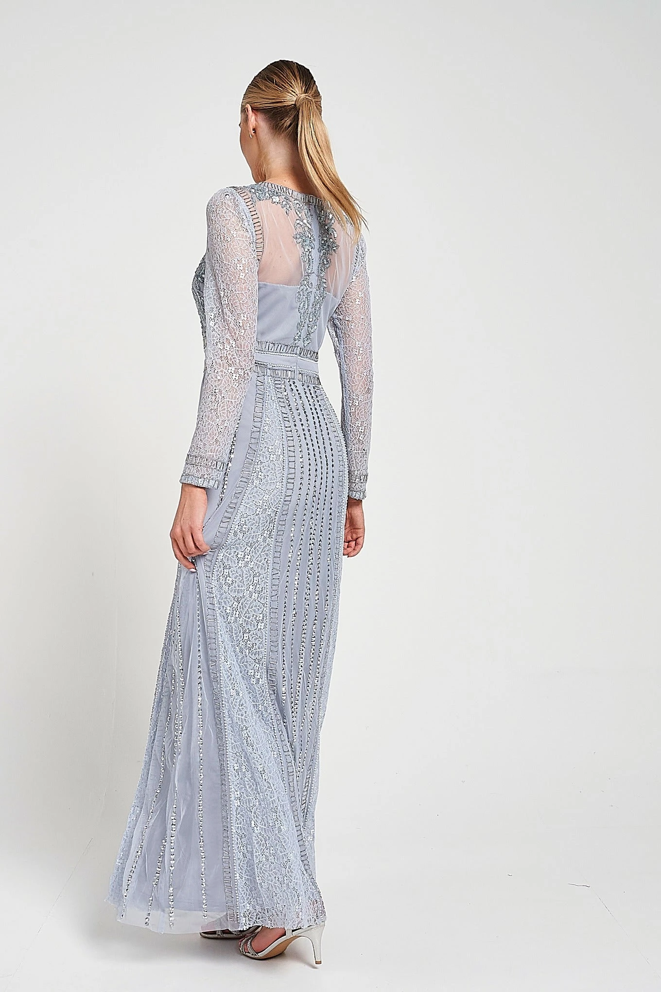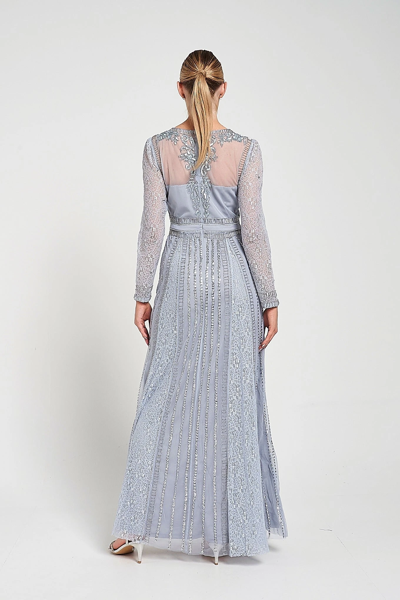 Effortless elegance in a blue-grey hue. The long and flowing Daphne features intricate tonal beadwork and lace panelling that adds volume to the full length skirt. Pair with silver accessories for an enchanting special occasion outfit.