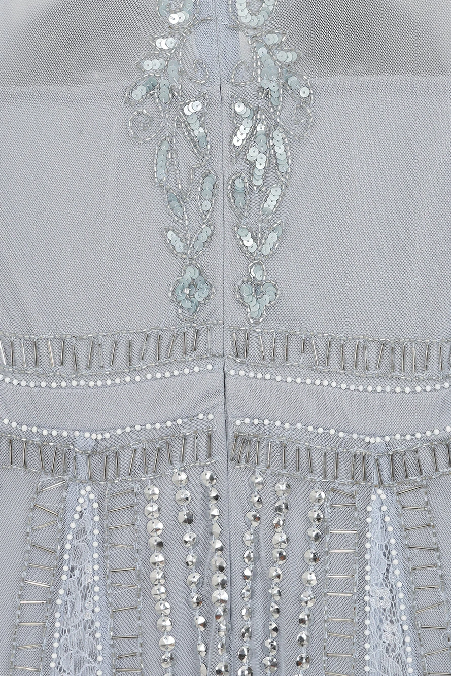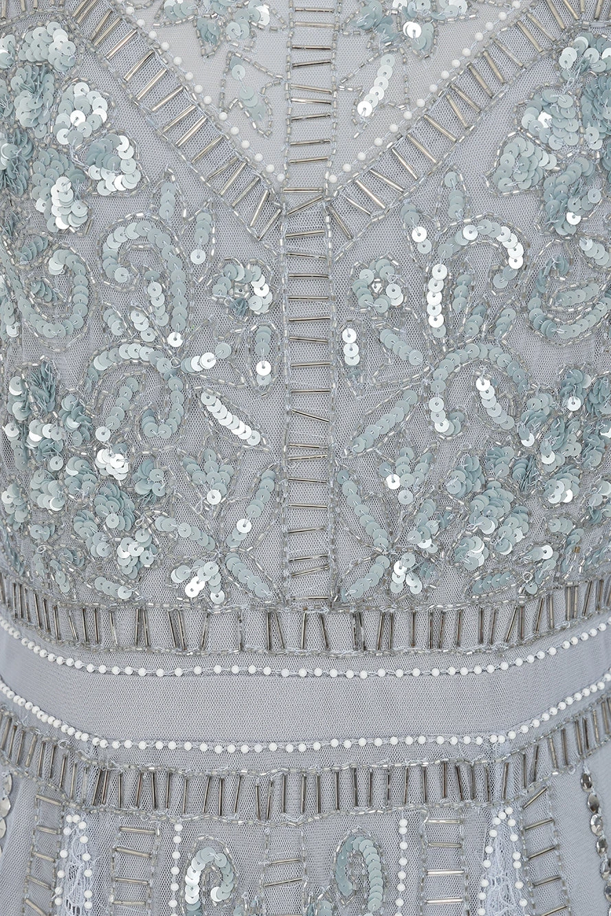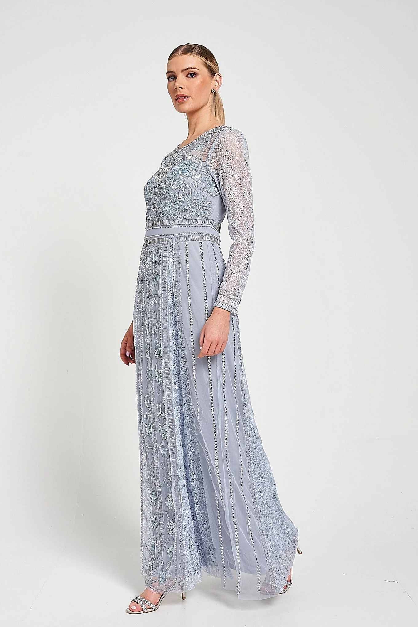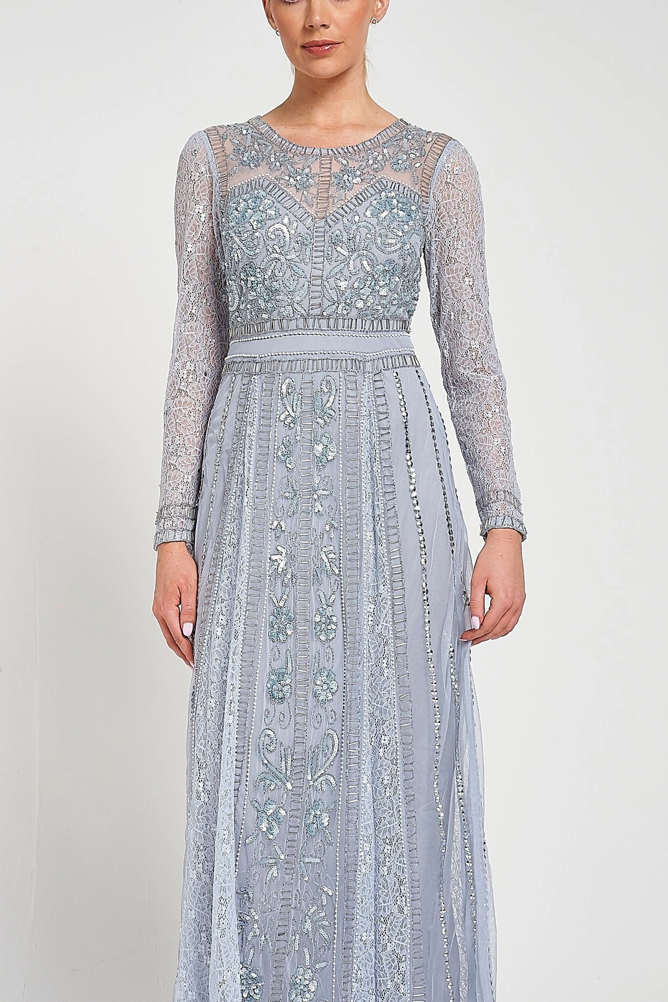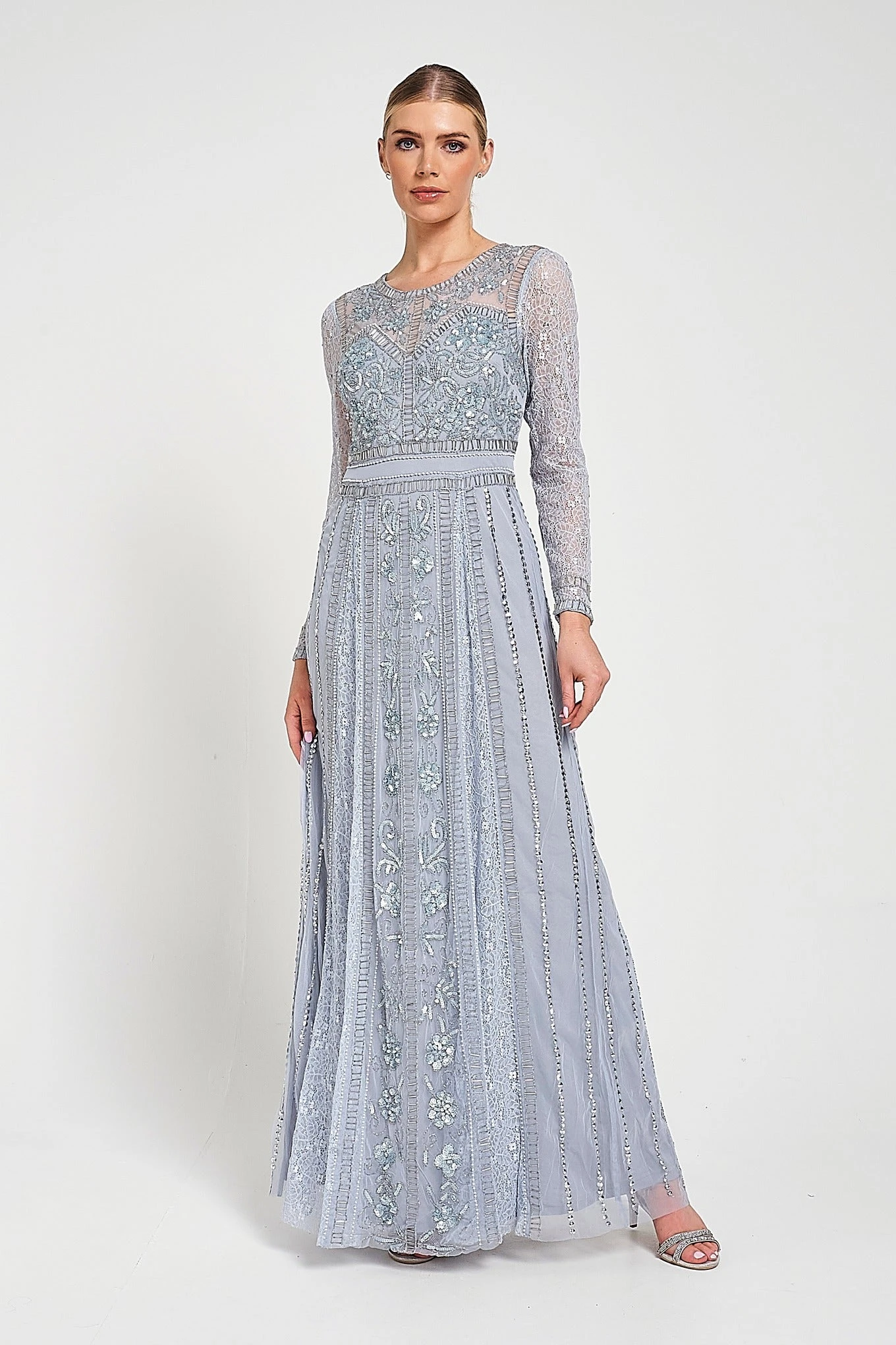 Effortless elegance in a blue-grey hue. The long and flowing Daphne features intricate tonal beadwork and lace panelling that adds volume to the full length skirt. Pair with silver accessories for an enchanting special occasion outfit.