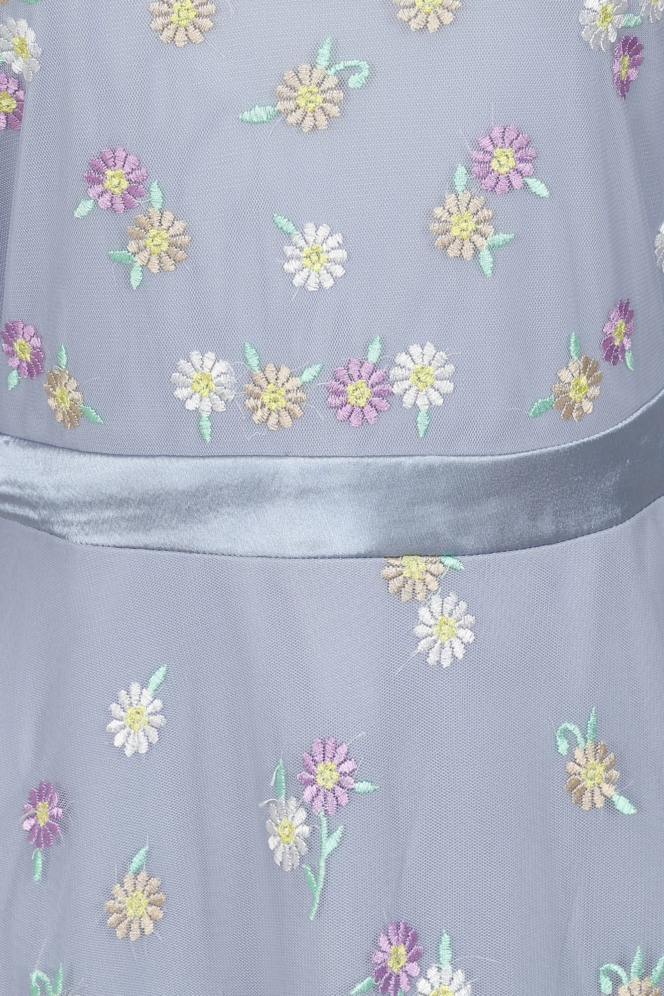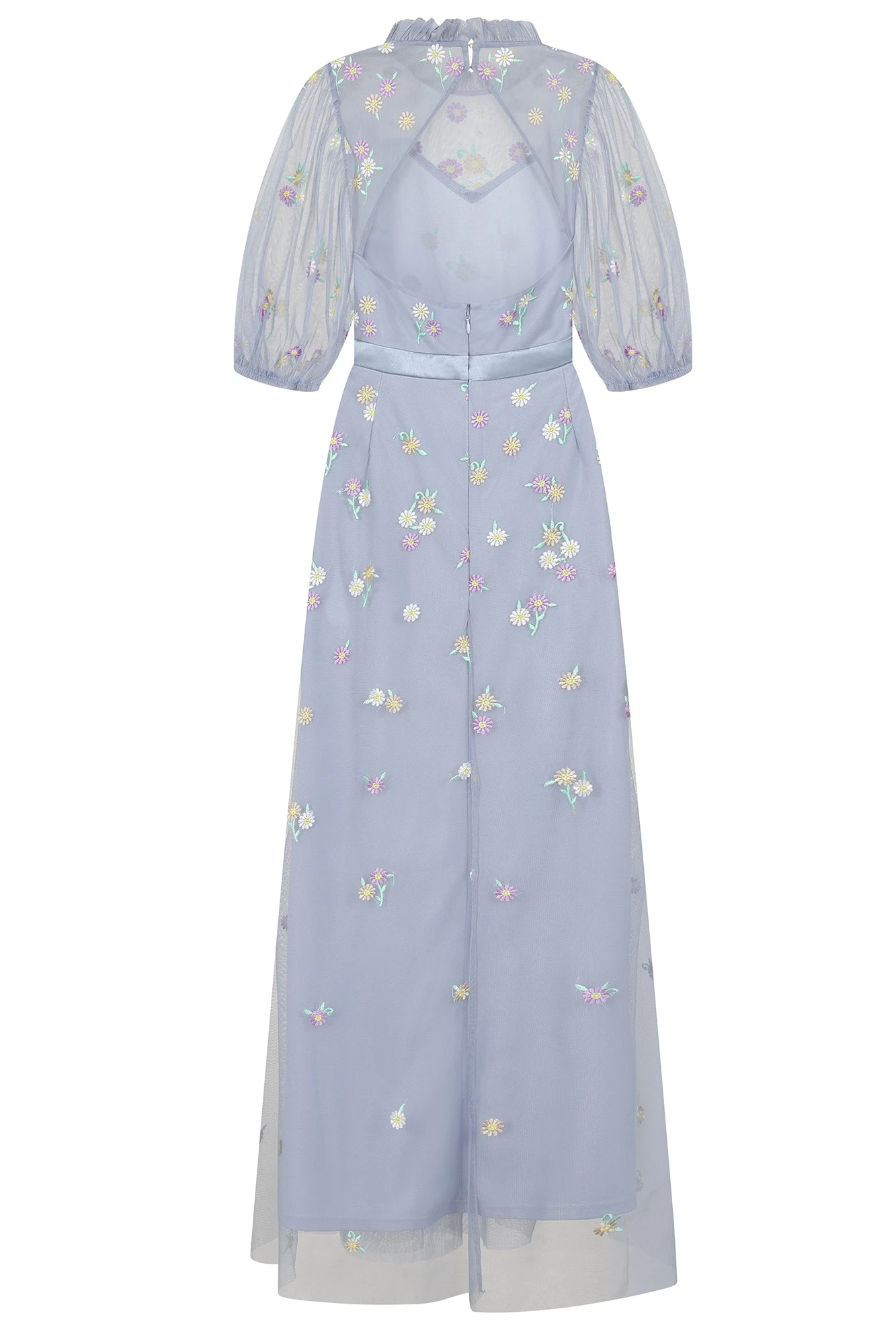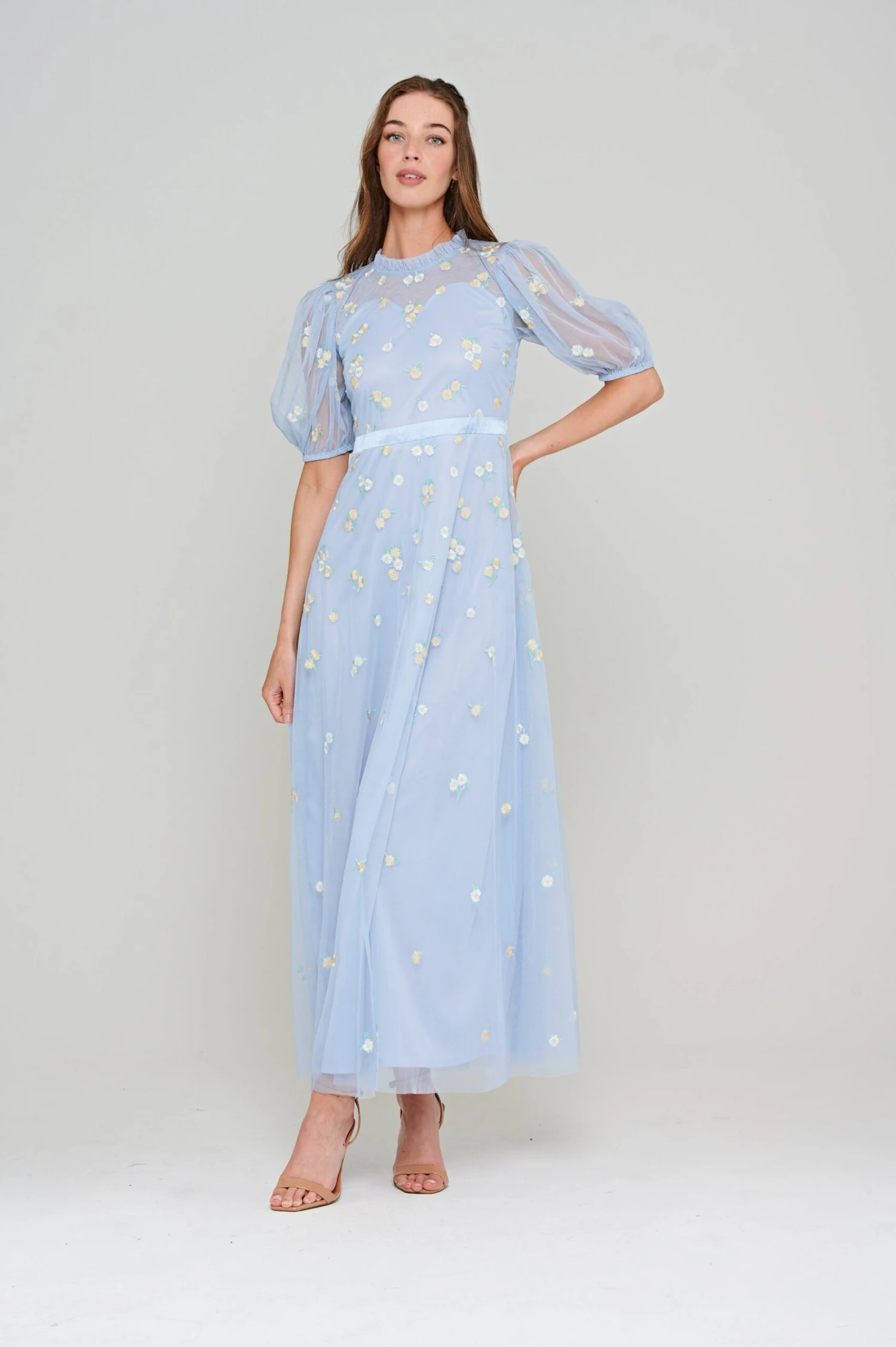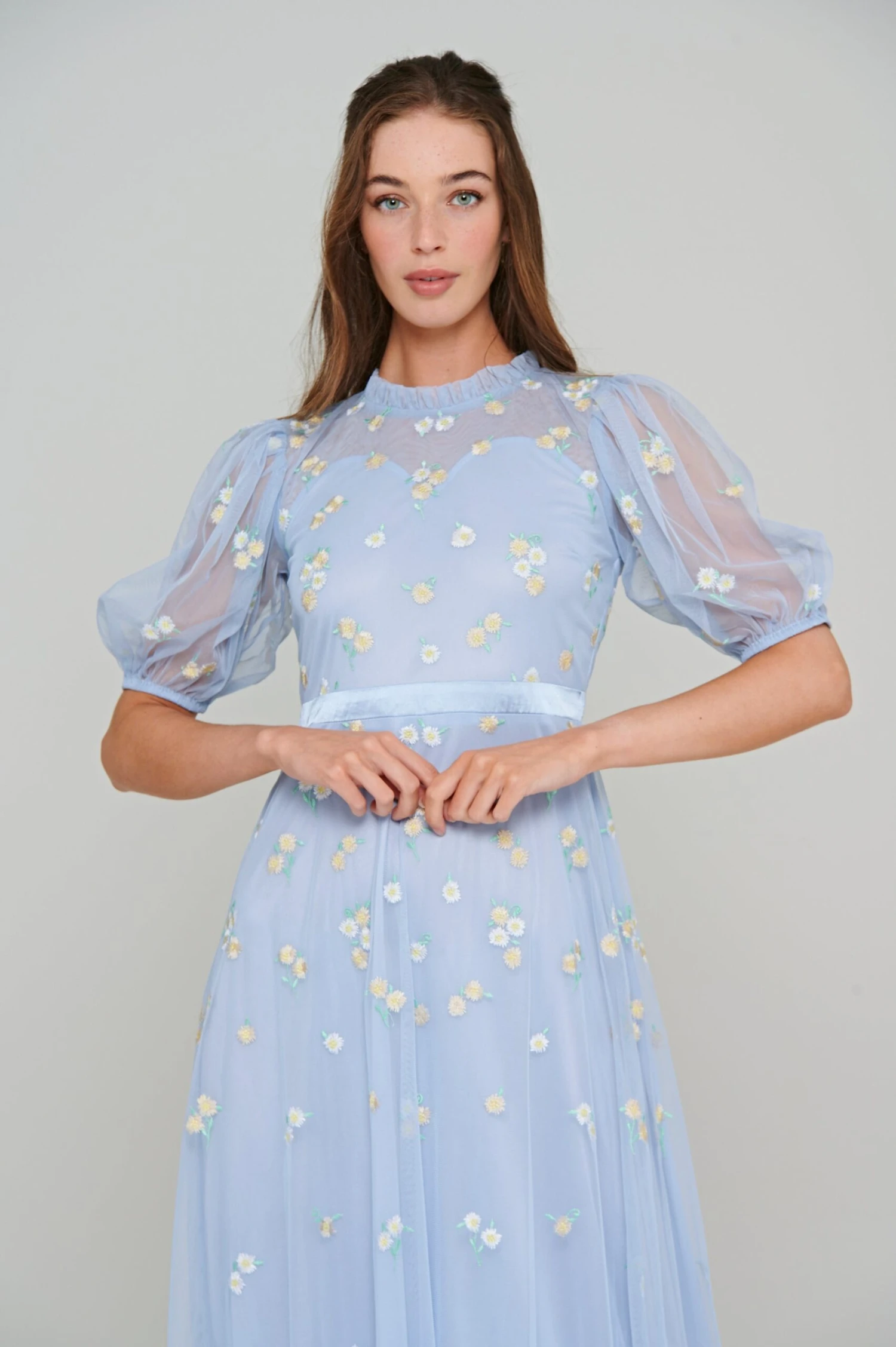 Realised in a delicate, powder blue hue, our darling Deryn dress is the perfect addition to your spring wardrobe. Overlaid with semi-sheer mesh, this full length style is scattered with dainty embroidered daisies. Deryn is complete with puffed sleeves and a satin belt around the waist.