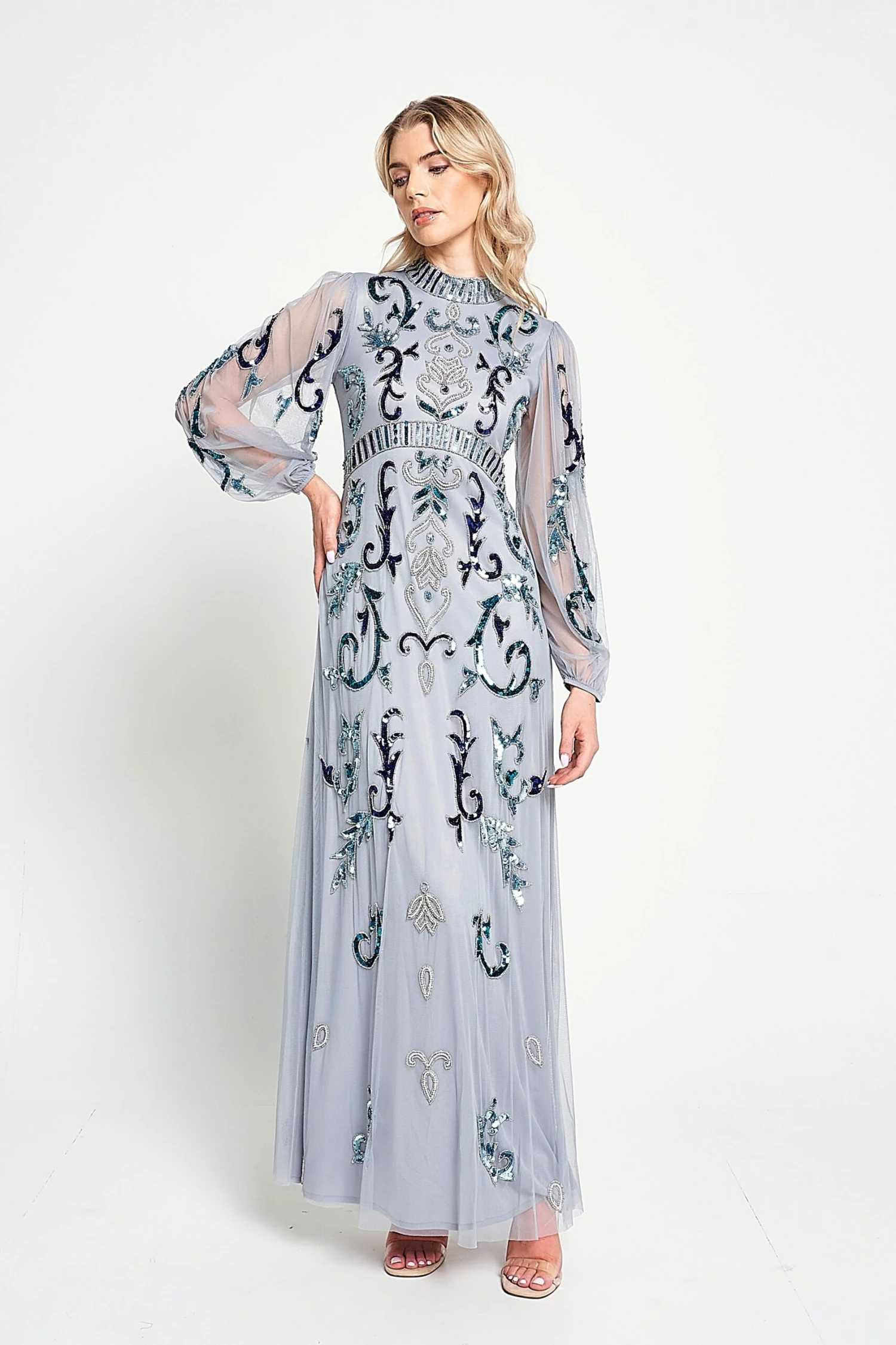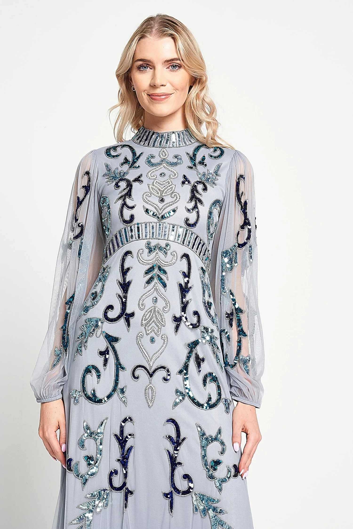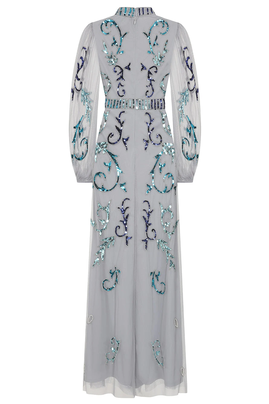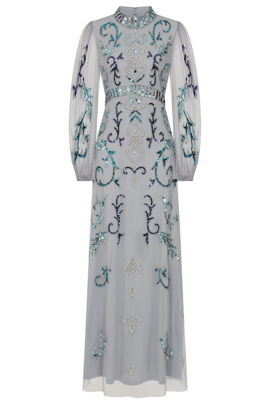 Defined by swirling turquoise and navy embellishment that cascades across the piece, this long grey dress is a guaranteed showstopper. Designed in a figure skimming silhouette, Eiden is complete with voluminous sleeves and a high neckline.