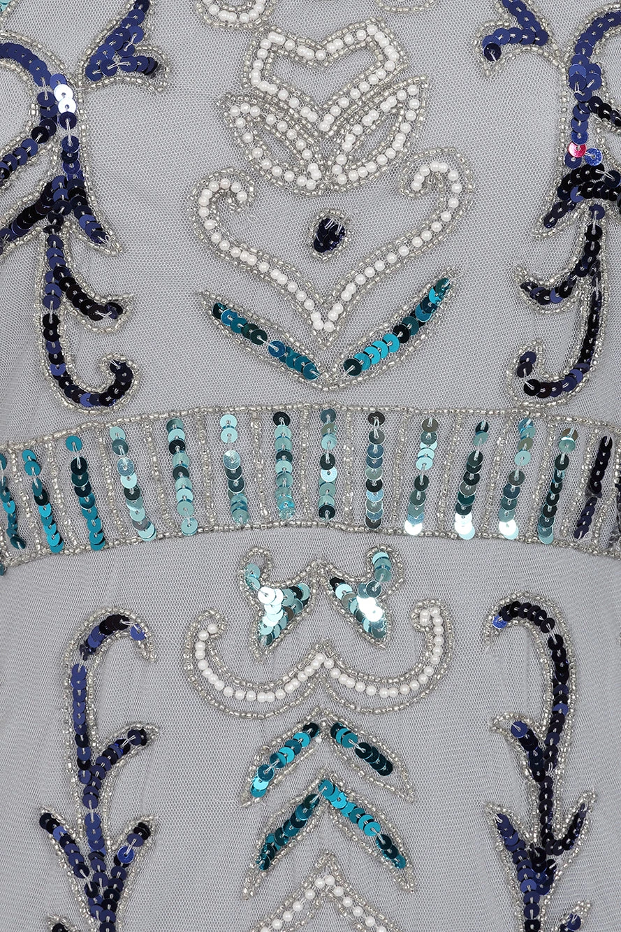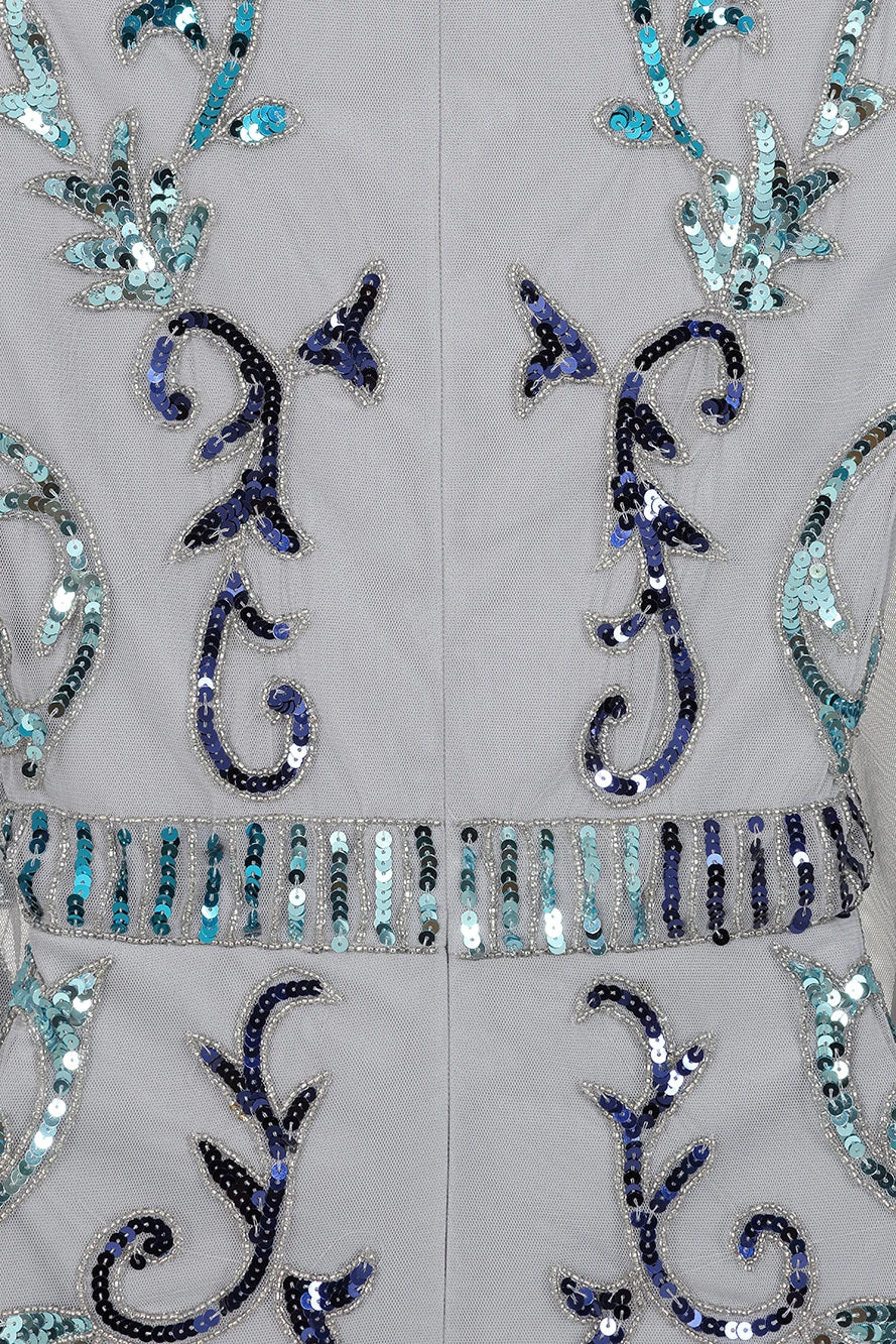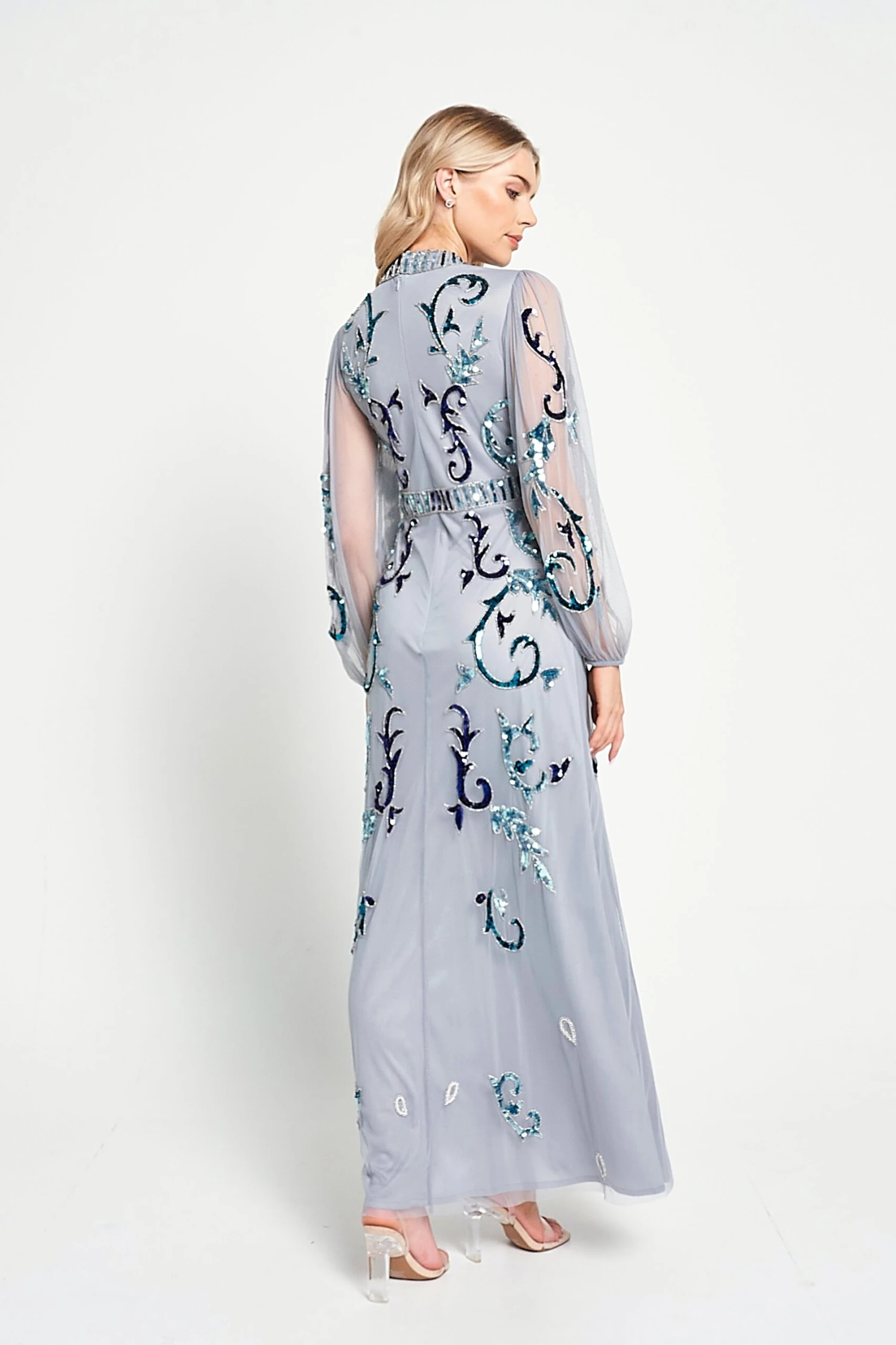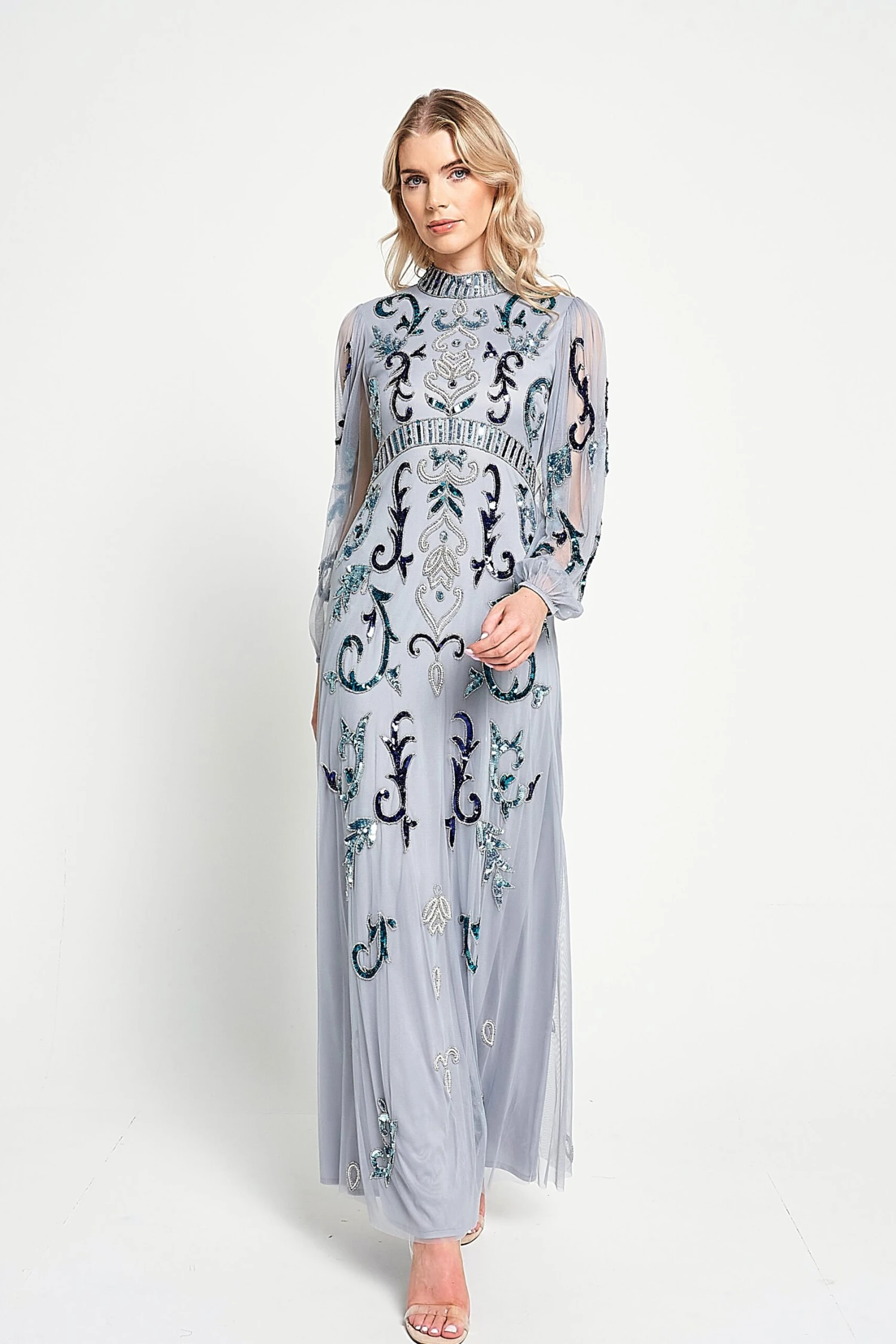 Defined by swirling turquoise and navy embellishment that cascades across the piece, this long grey dress is a guaranteed showstopper. Designed in a figure skimming silhouette, Eiden is complete with voluminous sleeves and a high neckline.