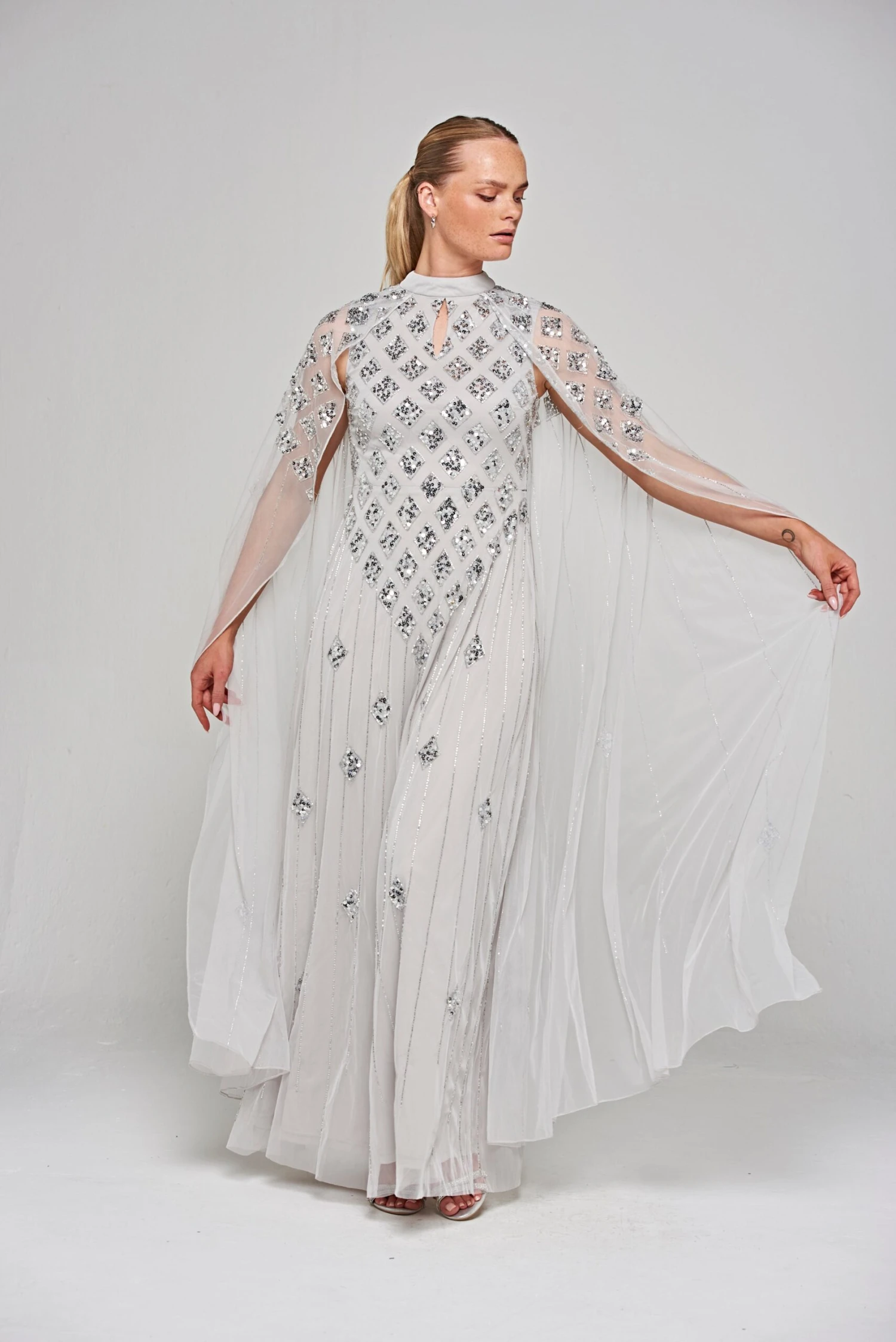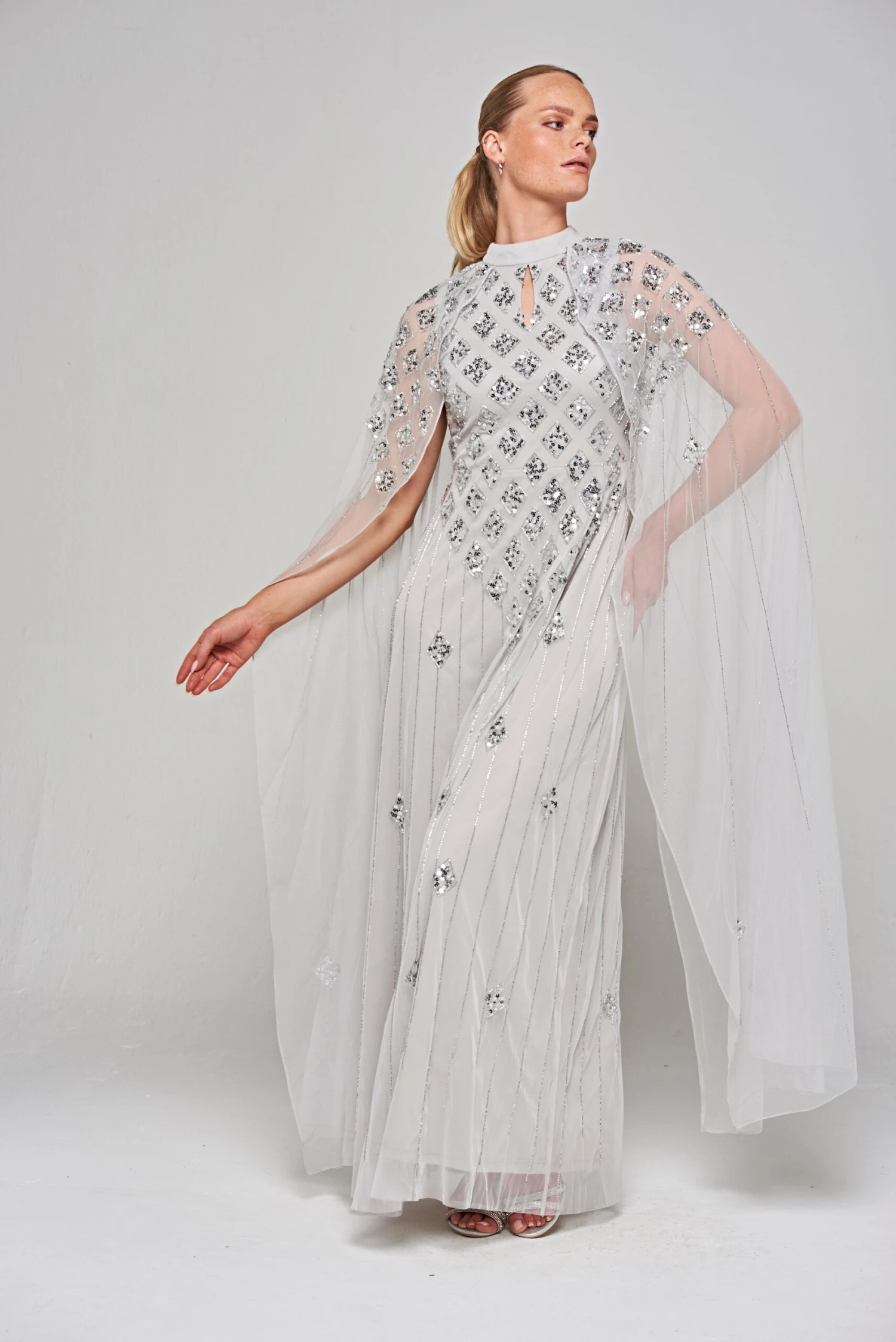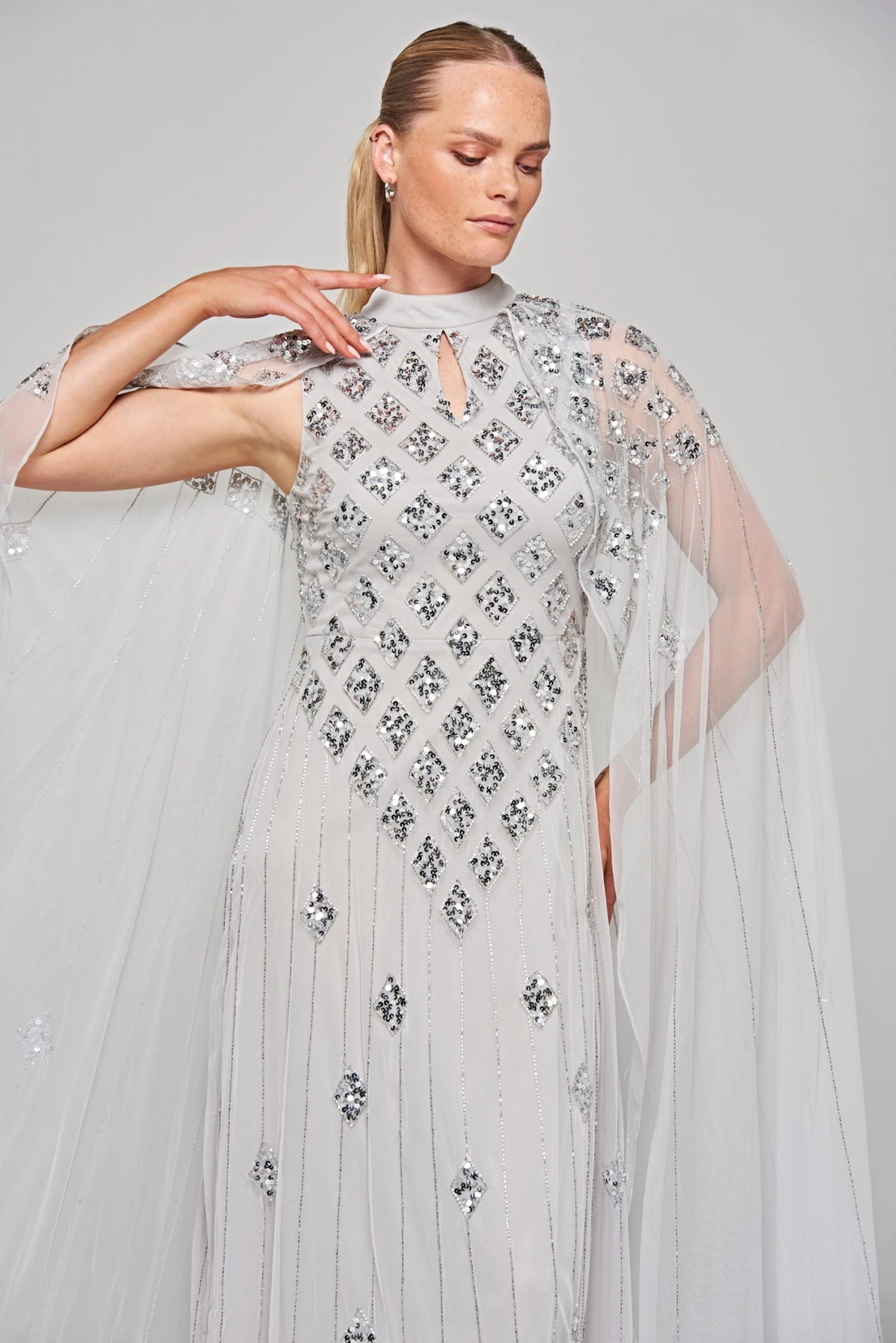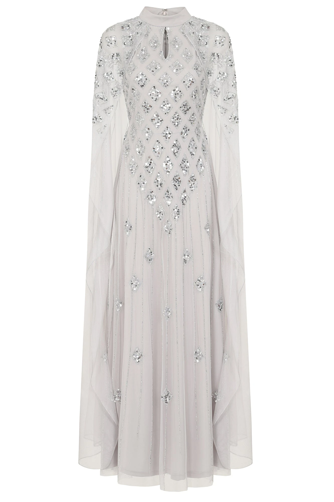 Long and sweeping, our Eileen maxi dress in pale grey is sure to wow any crowd! Shimmering with tonal silver embellishment, arranged in a minimal diamond motif, this full length gown is complete with dramatic cape sleeves and a keyhole cut out at front.