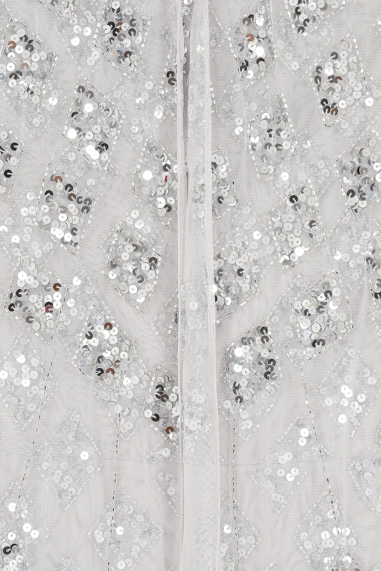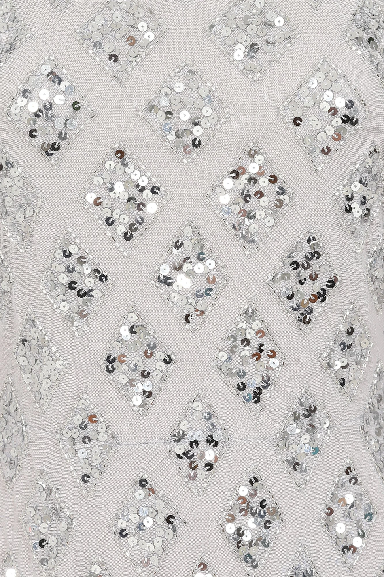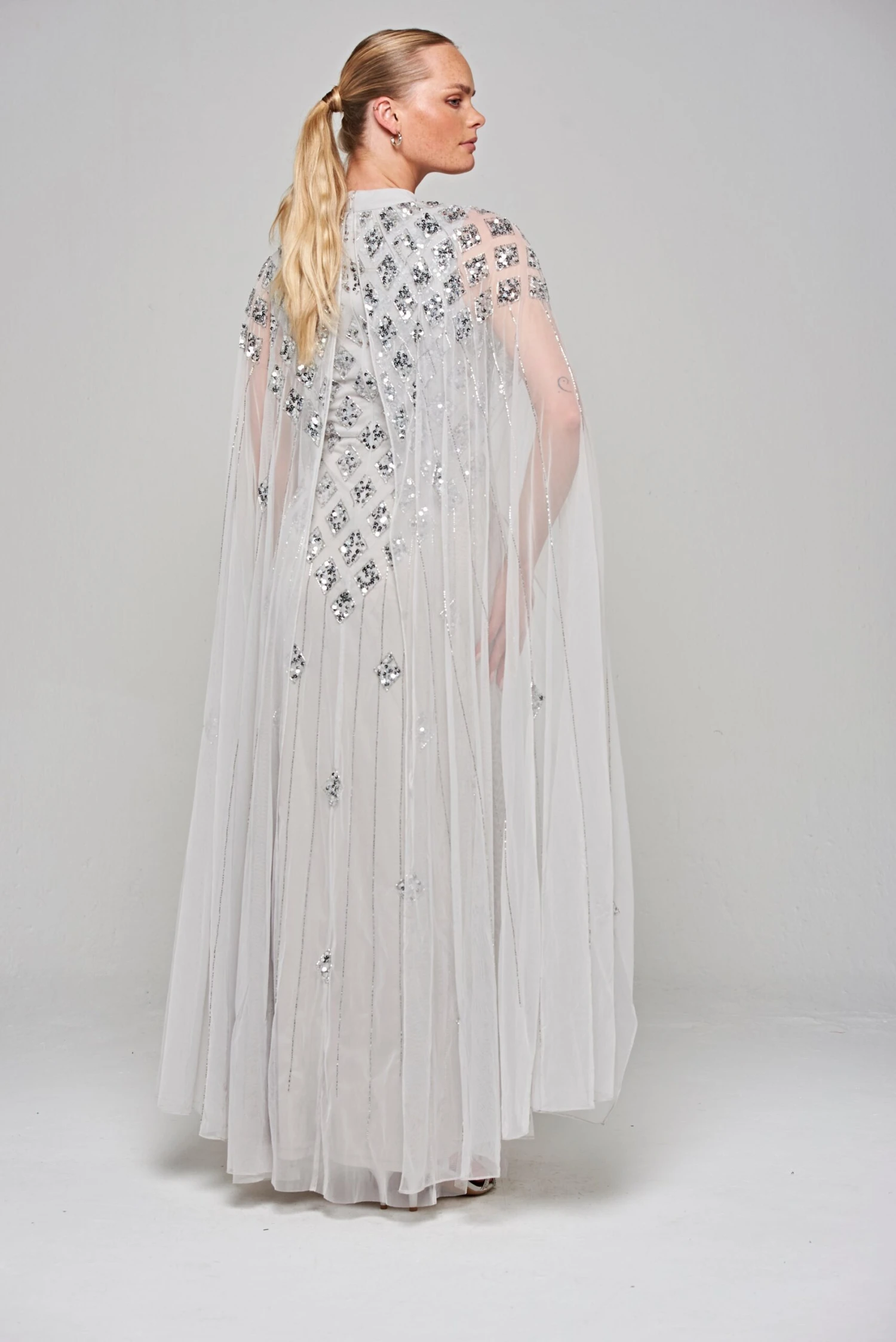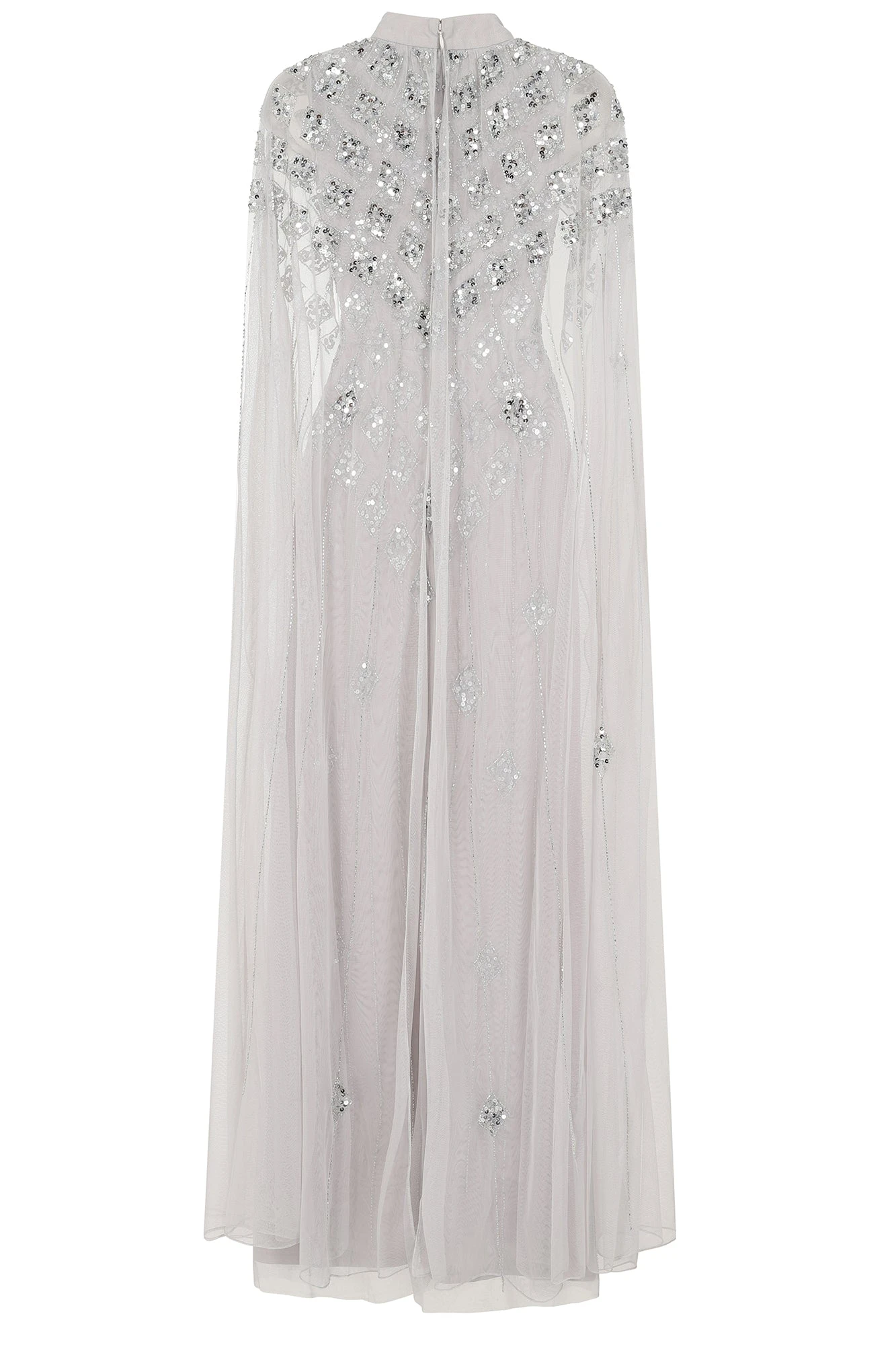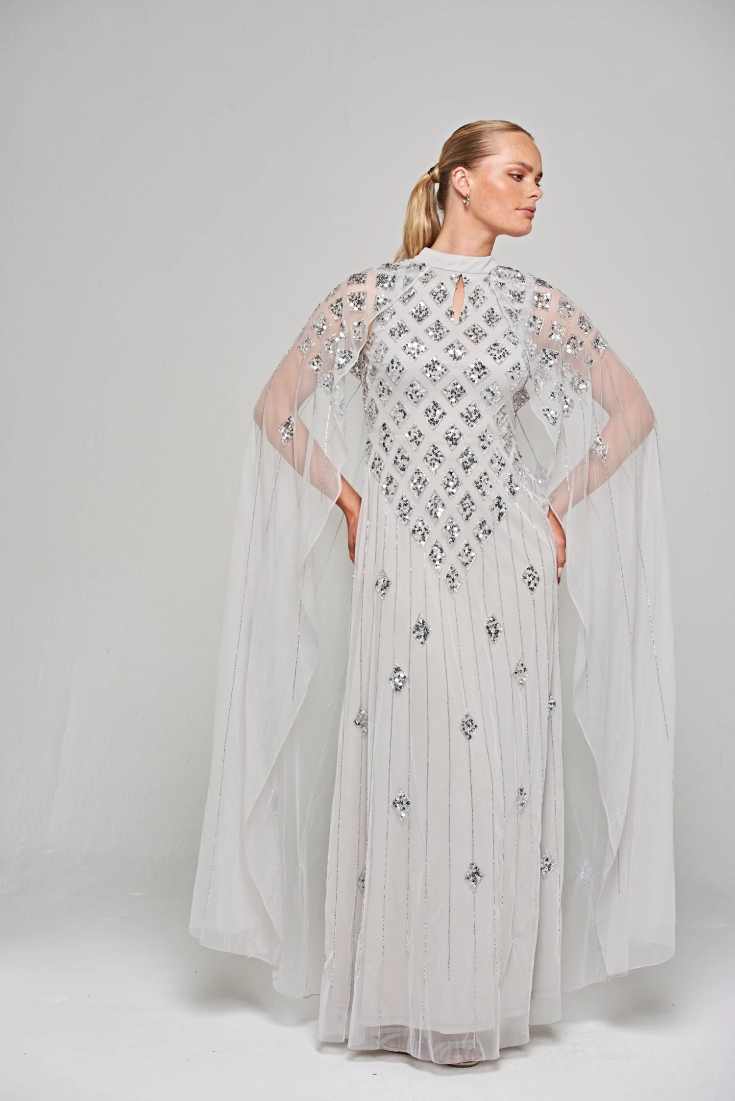 Long and sweeping, our Eileen maxi dress in pale grey is sure to wow any crowd! Shimmering with tonal silver embellishment, arranged in a minimal diamond motif, this full length gown is complete with dramatic cape sleeves and a keyhole cut out at front.