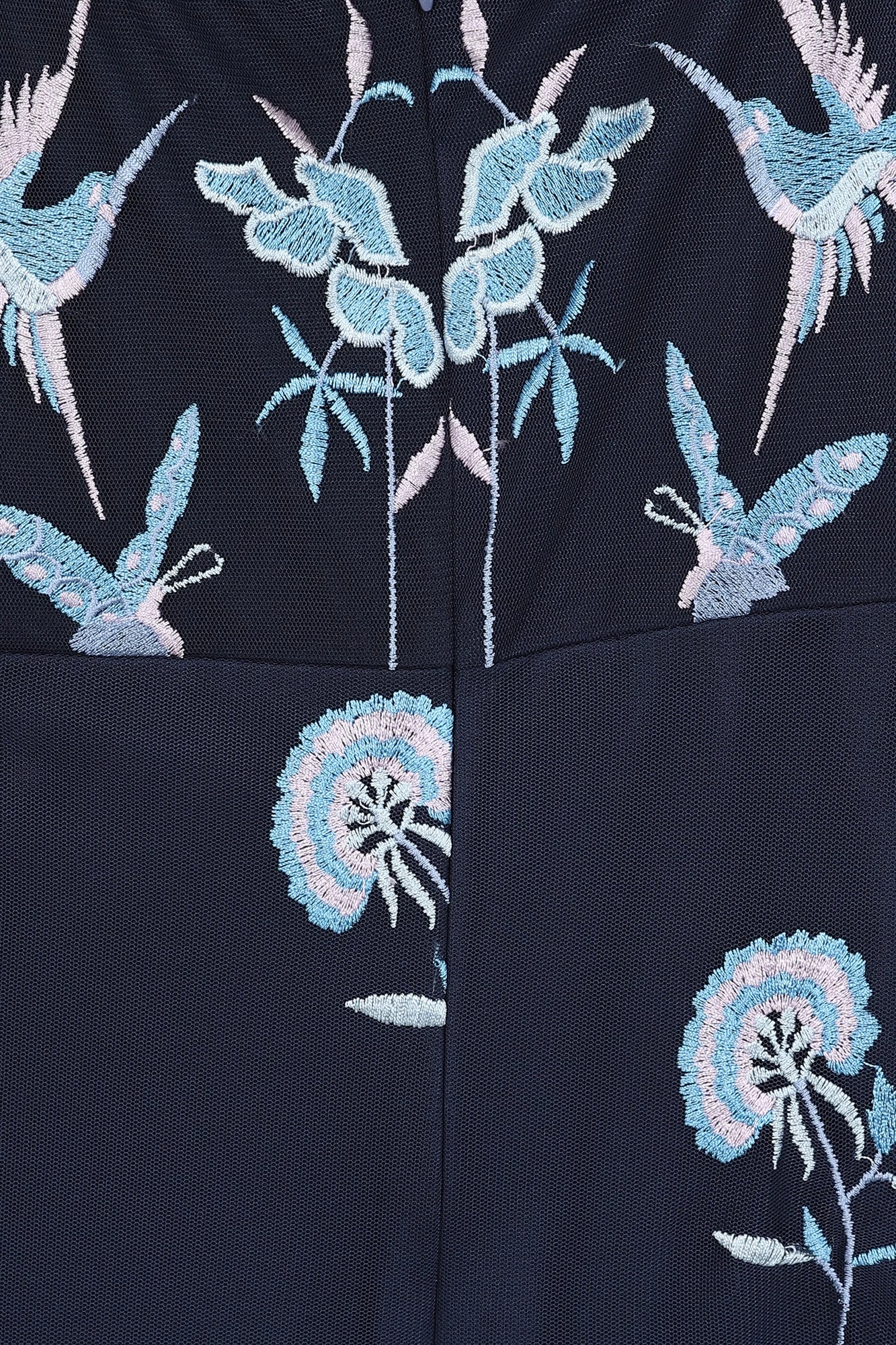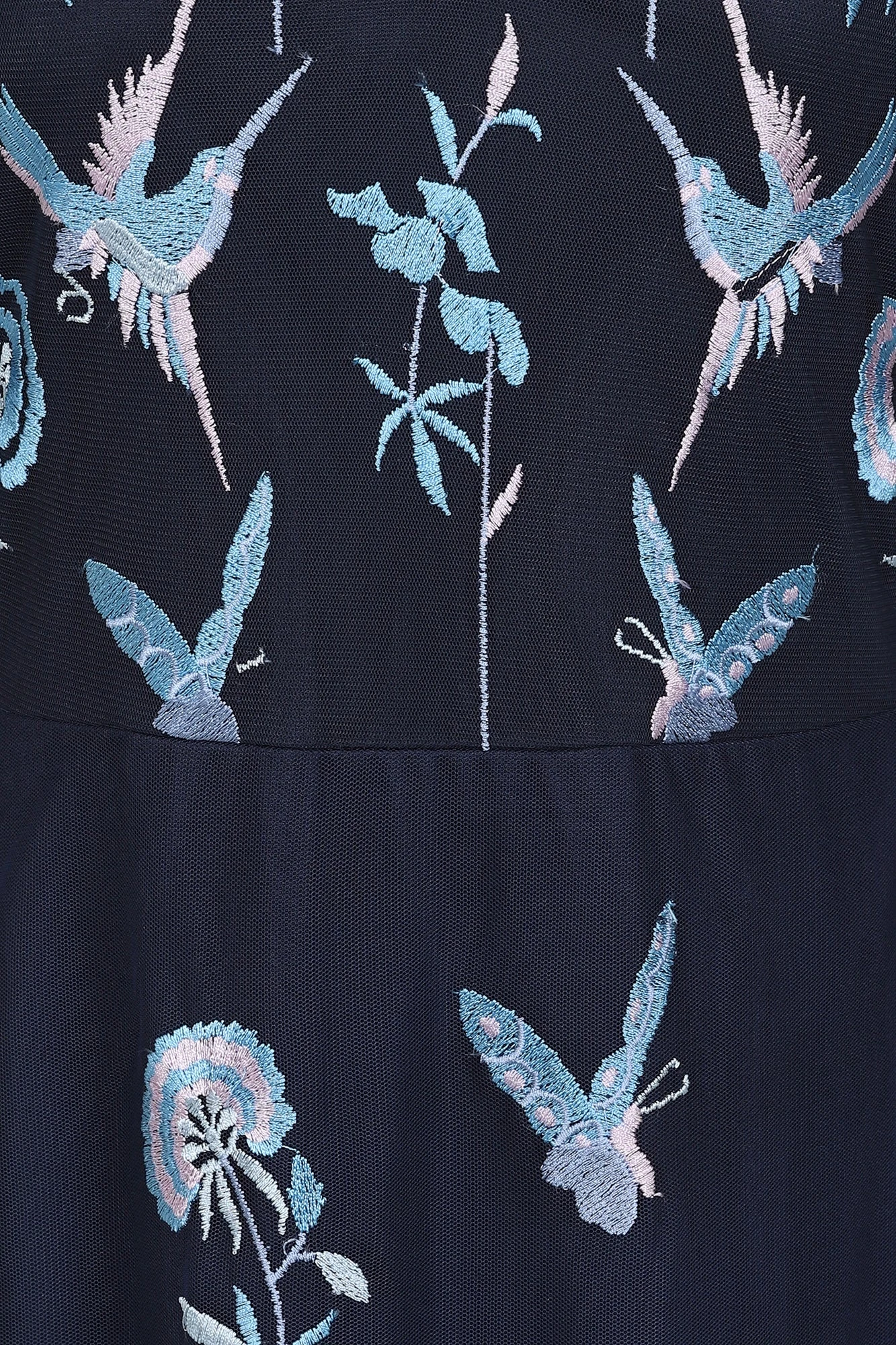 Introducing Einin! This striking navy dress is decorated throughout with beautiful embroidery of flowers and birds, stitched in tonal shades of blue and lilac. Maxi in length, Einin is complete with a v neckline, sheer mesh sleeves and an eye-catching cut out at back.