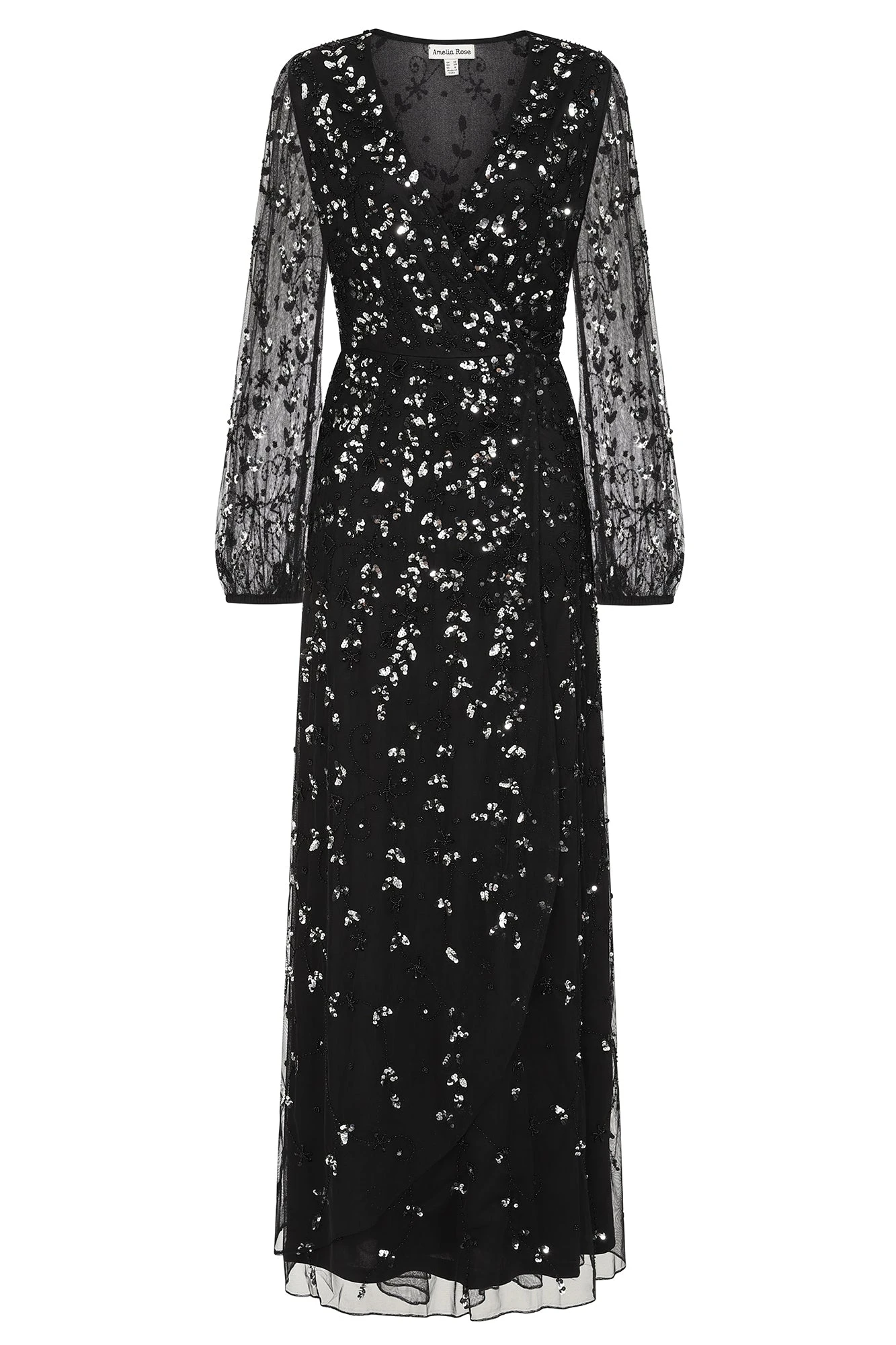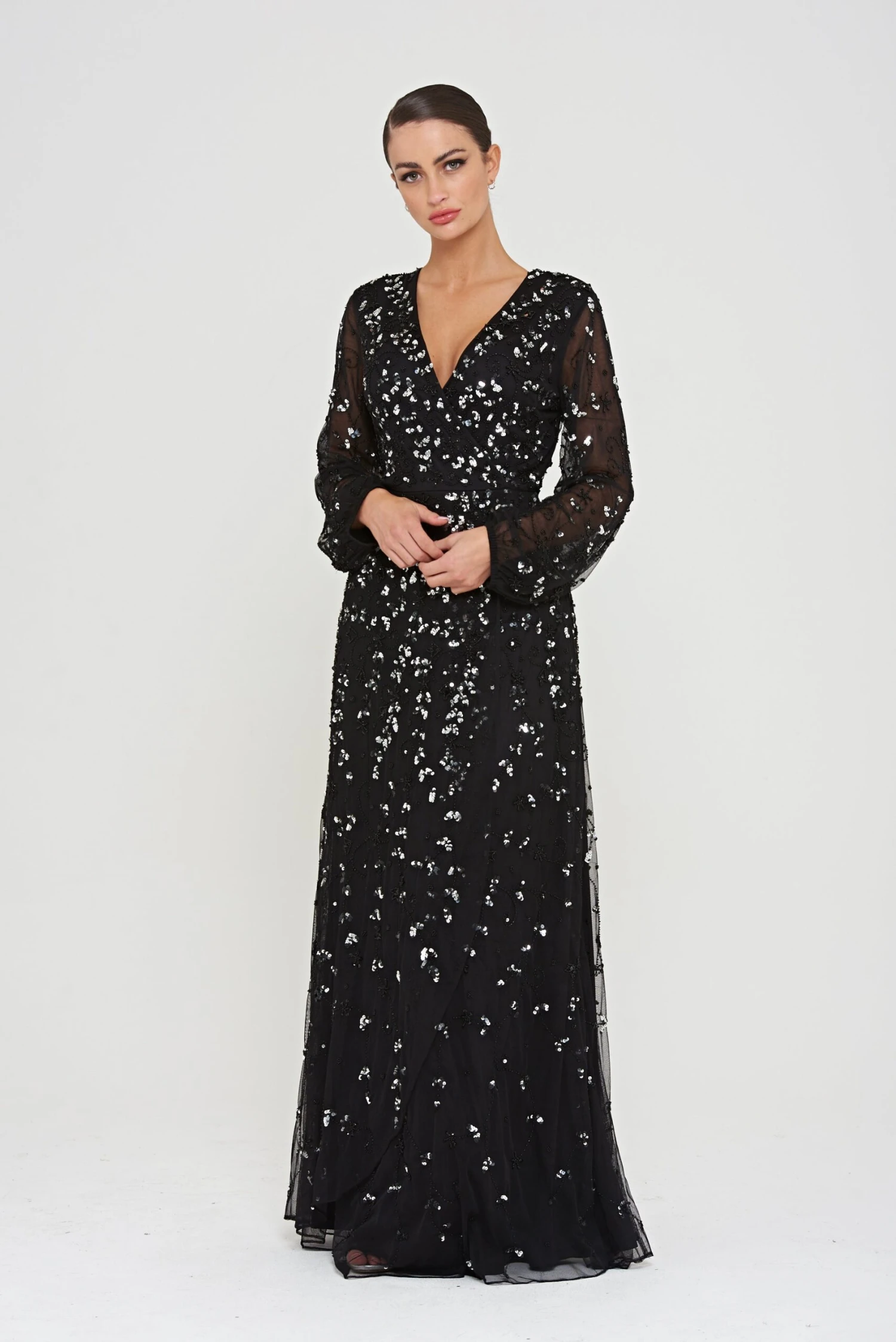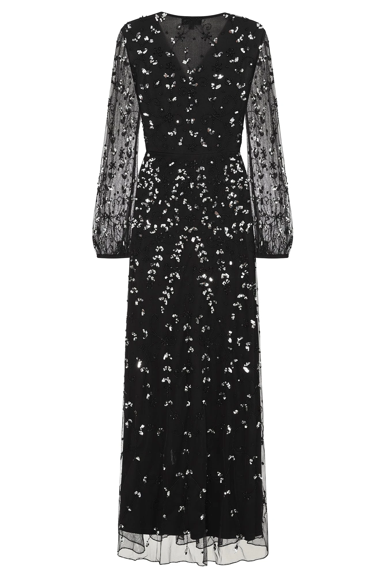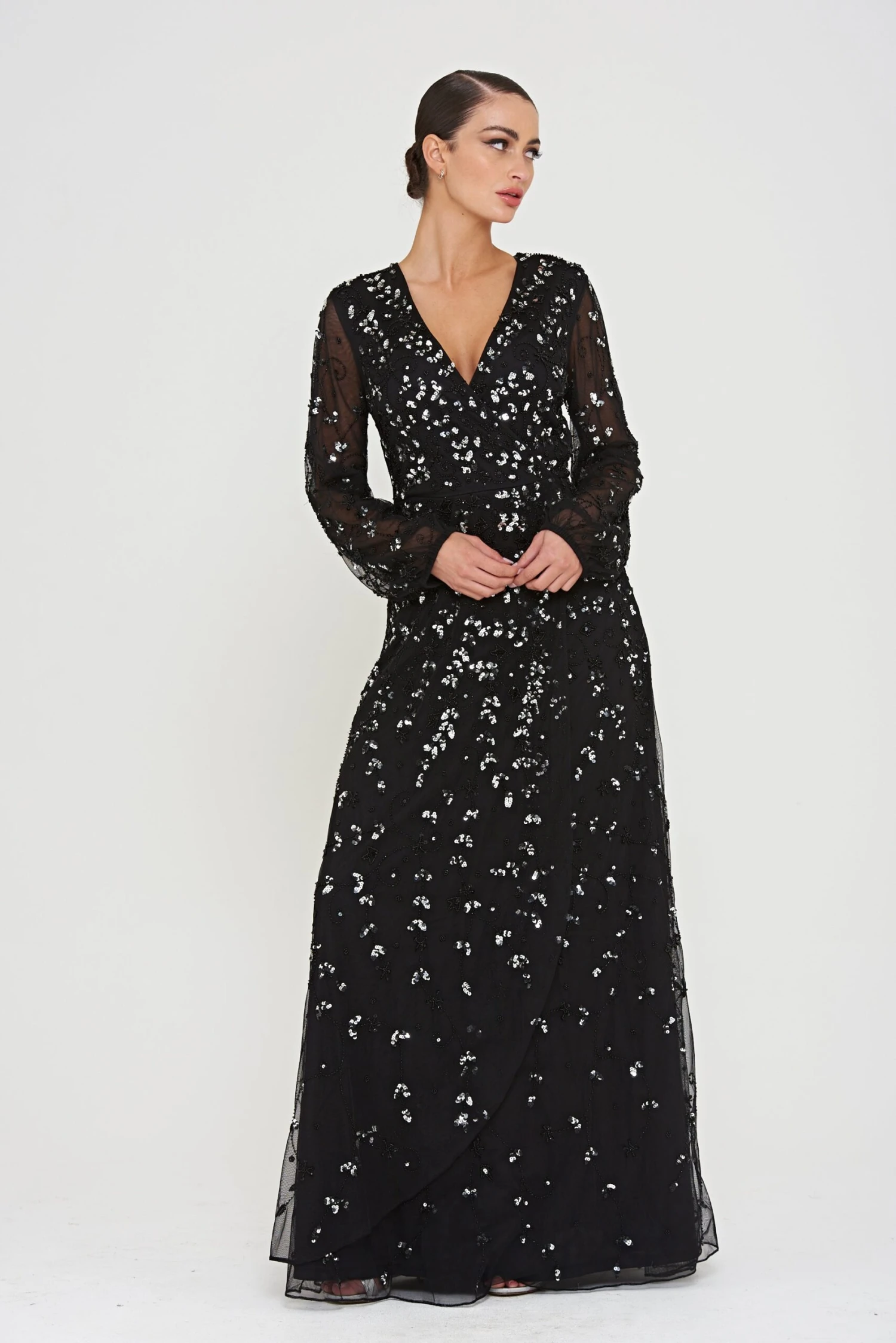 A future favourite for formal occasions, strands of sparkling embellishment twist across the length of the bewitching Eleanor maxi dress. Cut in a flattering, faux wrap design, Eleanor is complete with long gauzy sleeves. Style this v neck gown with a simple silver pendant necklace.