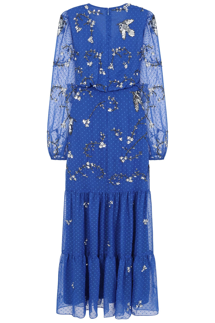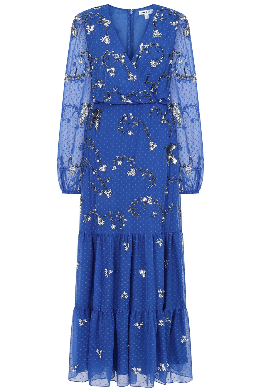 Float effortlessly into any special occasion with Elena. Cut in a faux wrap silhouette, this cerulean blue maxi dress is overlaid with dobby mesh and embellished with swirls of silver sequin detailing.