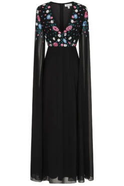 Valentina Black Floral Embroidered Maxi Dress With Pleated Cape
