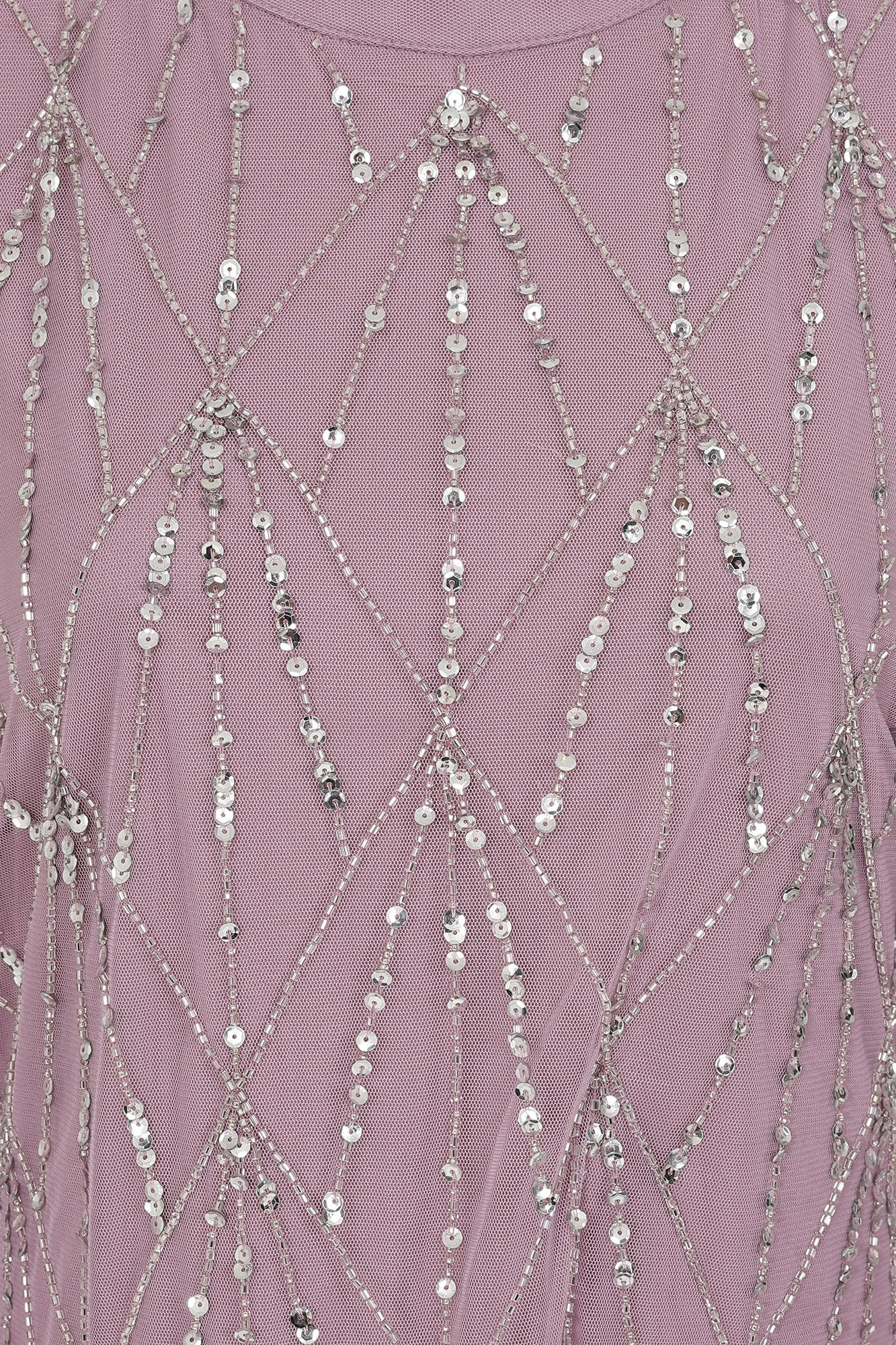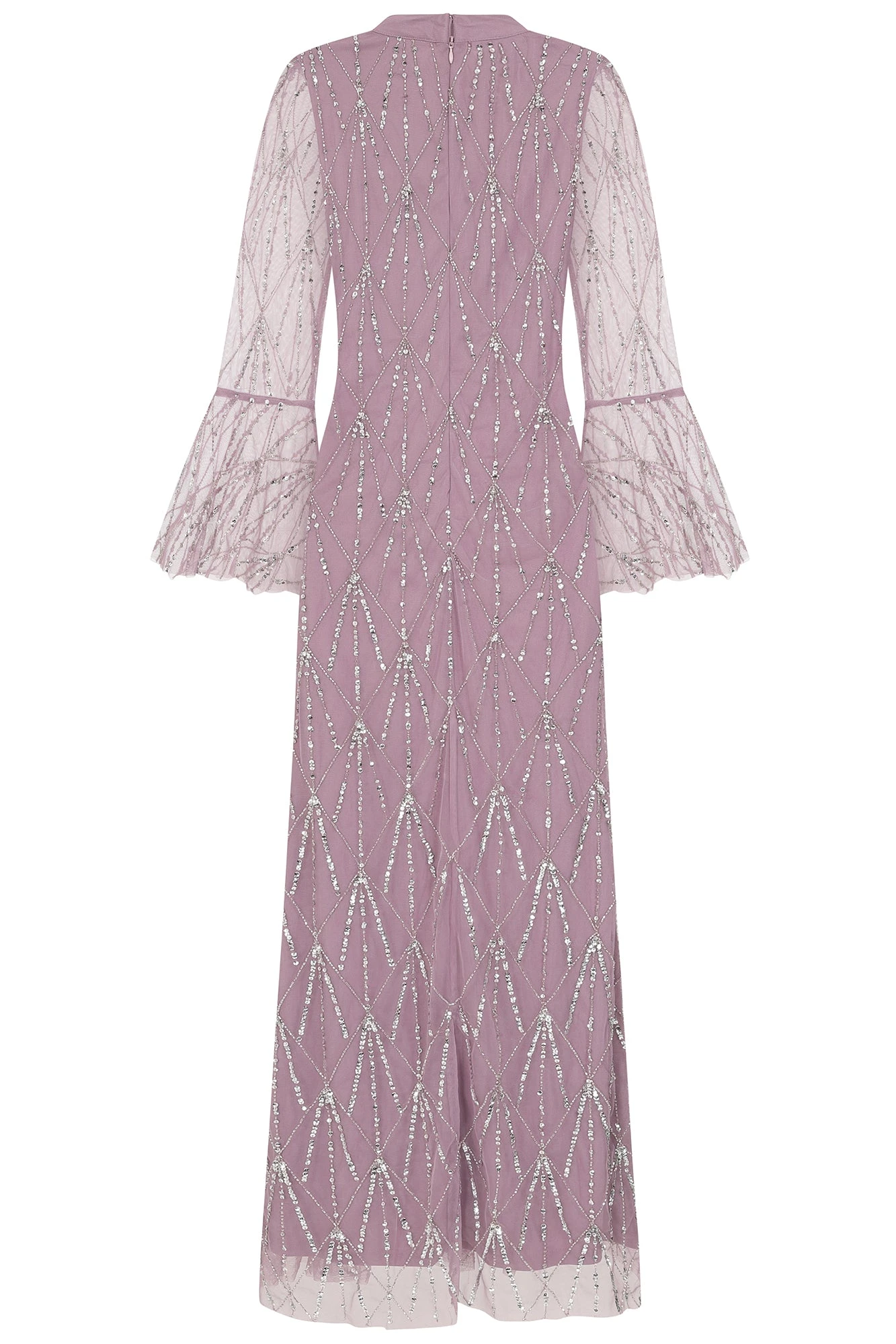 Adorned throughout with silver sequins and beads, arranged in a minimal, geometric pattern, this long sleeved maxi dress is the perfect choice for the most important dates in your diary. Realised in a dusky, keepsake lilac, Erma is complete with a high neckline and sheer fluted sleeves. Style with simple metallic accessories for instant special occasion glamour.