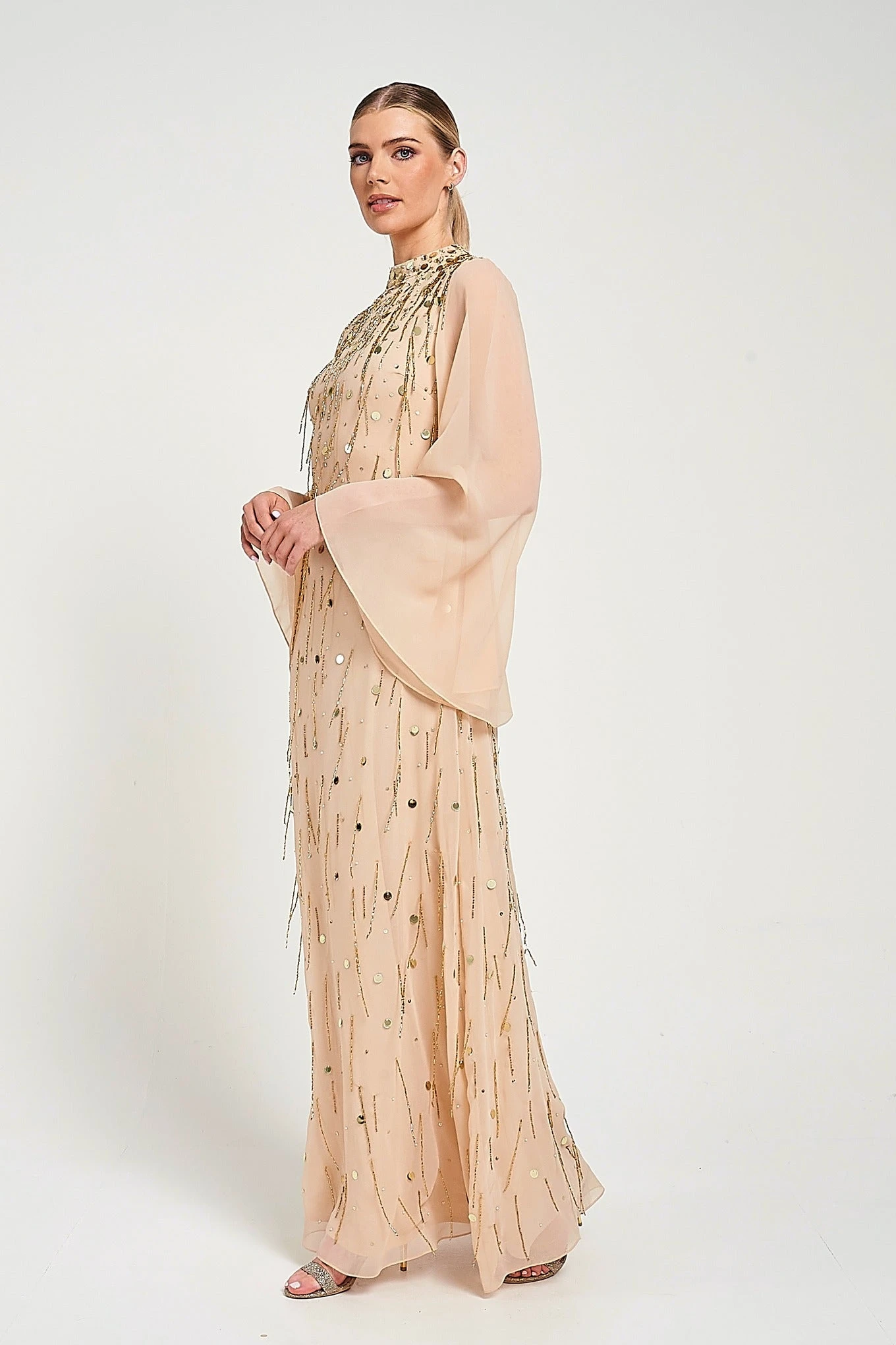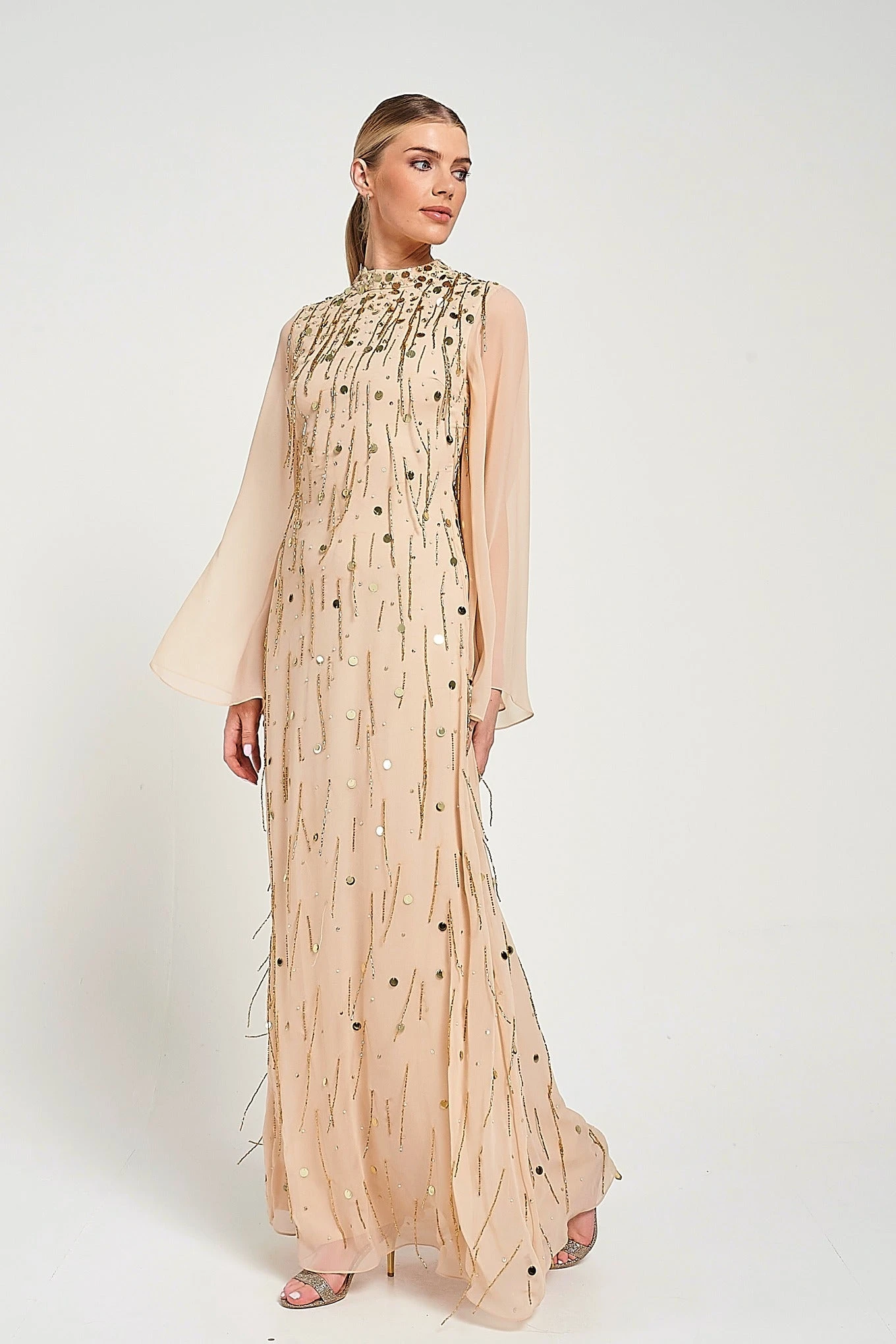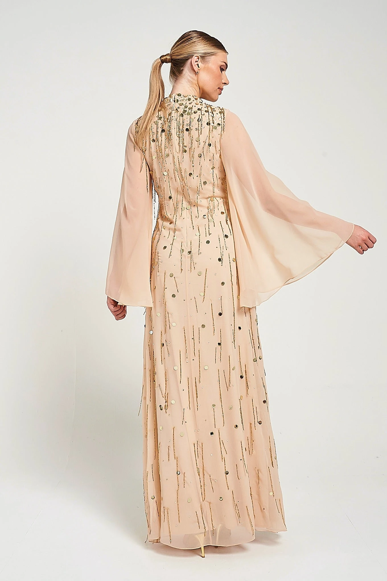 Stride effortlessly into special occasion season with Faye. Realised in a nude-gold hue, this long sleeved maxi dress is detailed with light-catching sequins and beaded tassels that swish with every step.