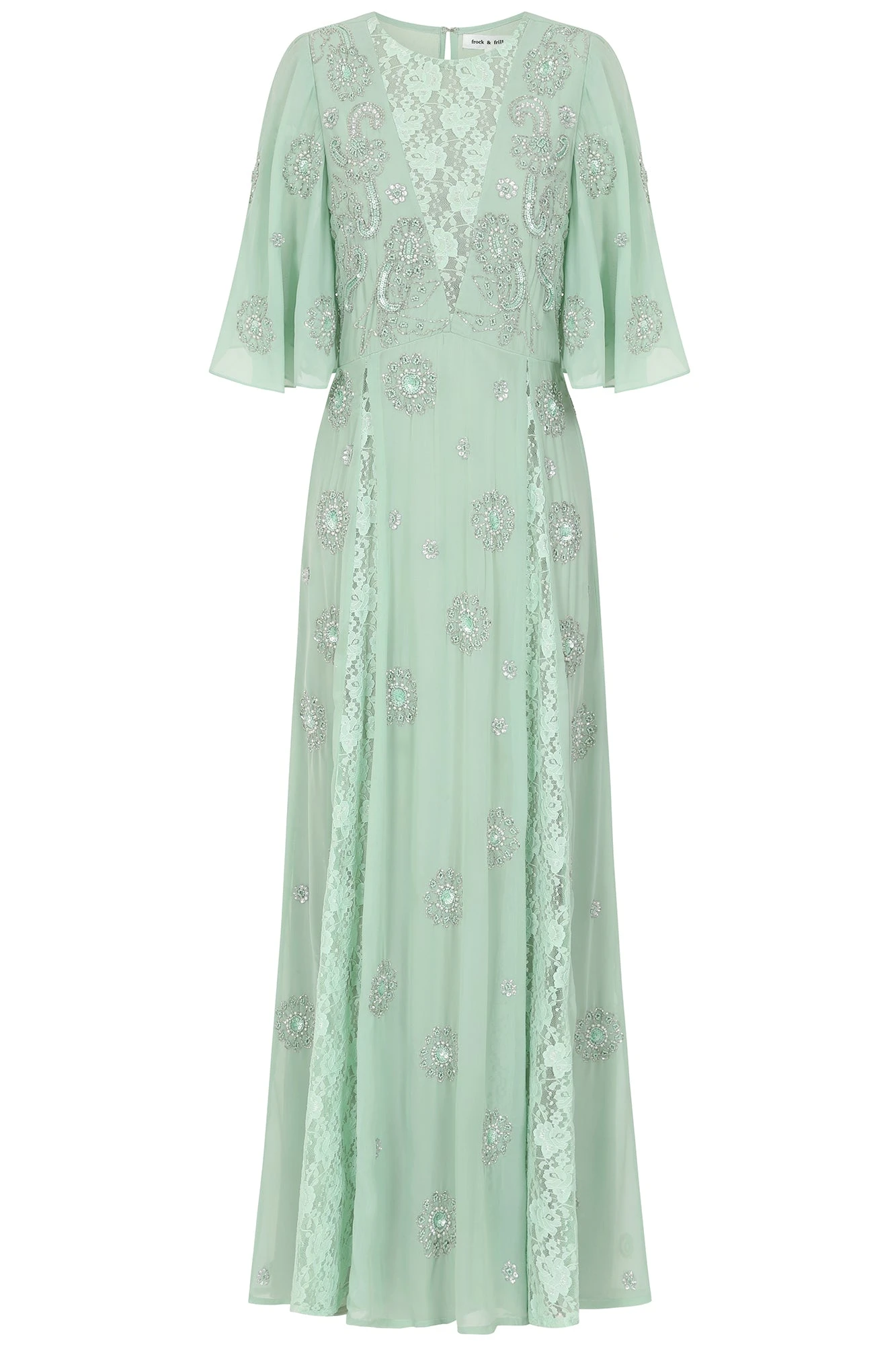 Serene in light green, Fern is decorated throughout with tonal embellishment, realised in a floral inspired motif. Designed with lace panelling that adds volume to the floor skimming skirt and sit atop a deep v neckline, this dress is complete with gently flaring sleeves.
