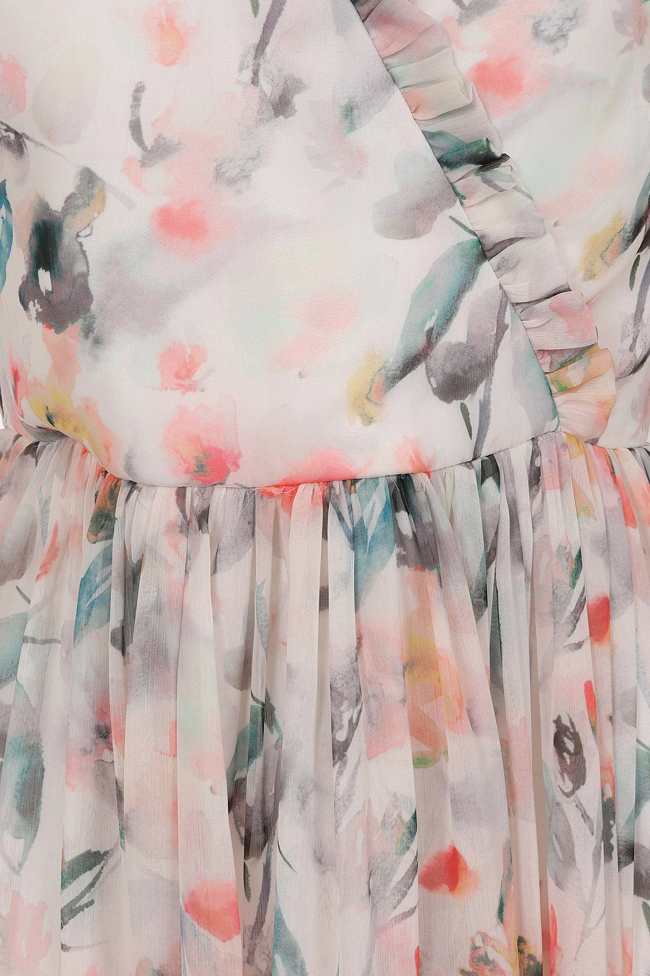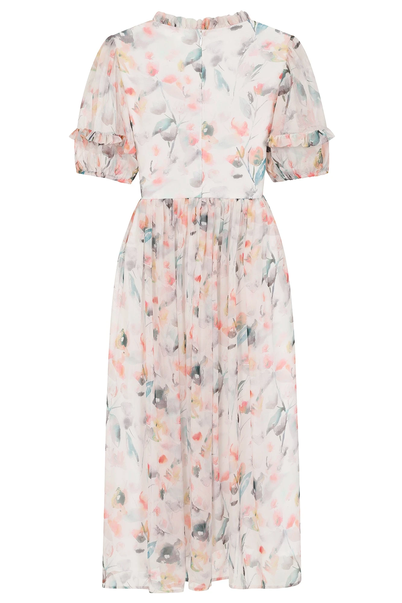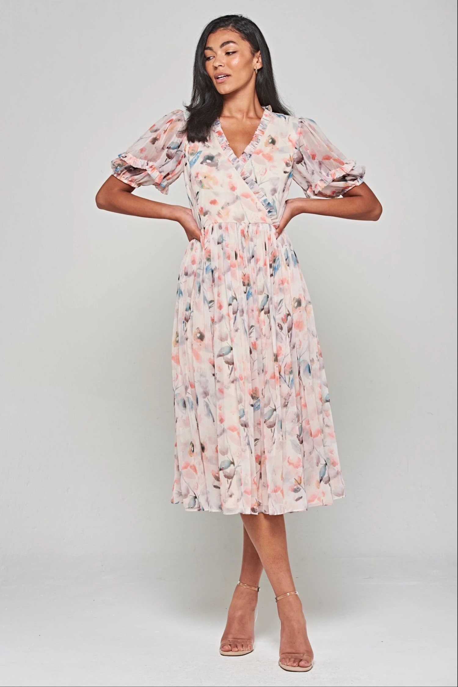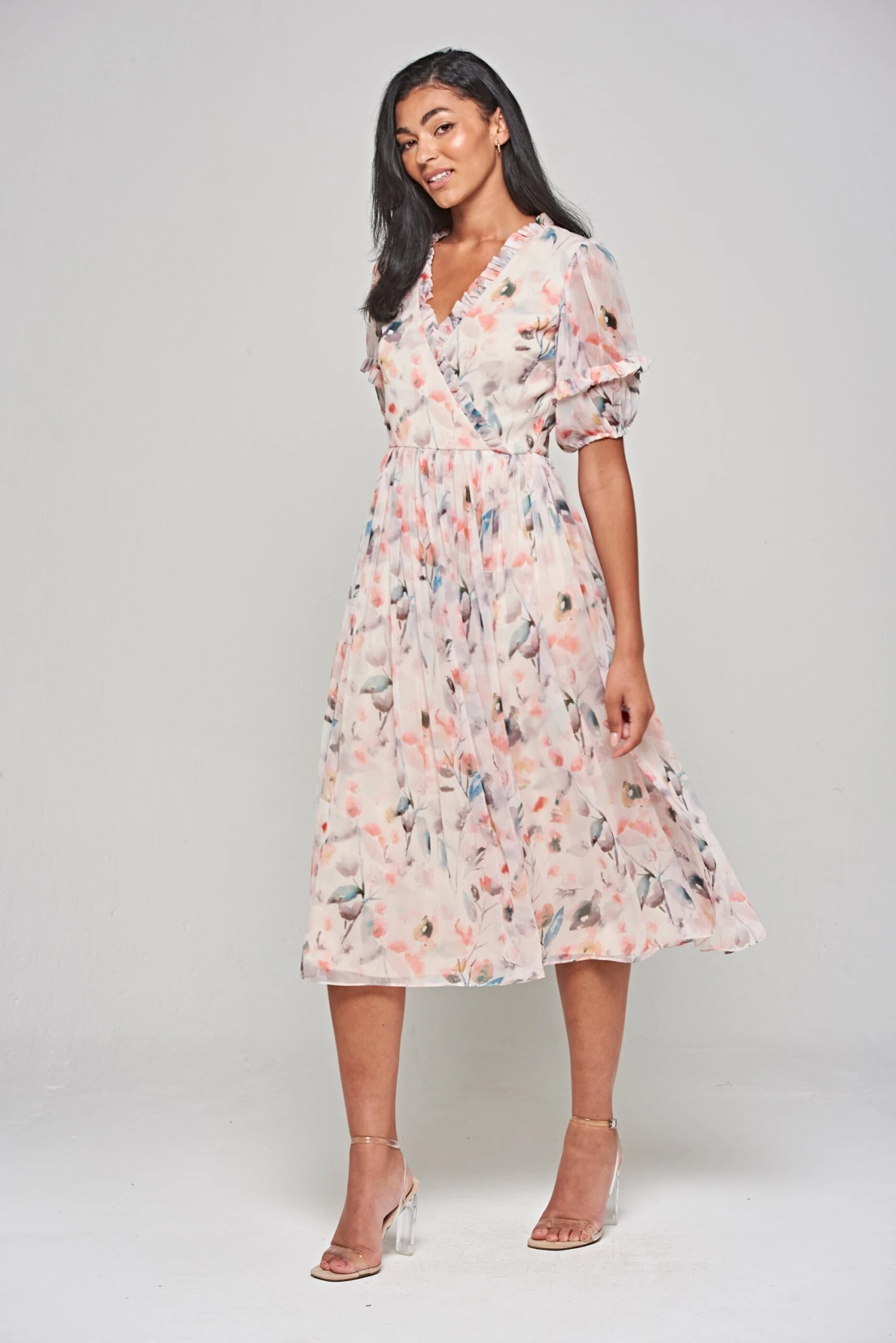 Drift effortlessly into spring with Fleur. Featuring a dreamy watercolour floral print, this thoroughly feminine midi dress is complete with a wrap style neckline and puffed sleeves. Style with silver heels for wedding guest glamour or partner with box fresh trainers for a laid back look.