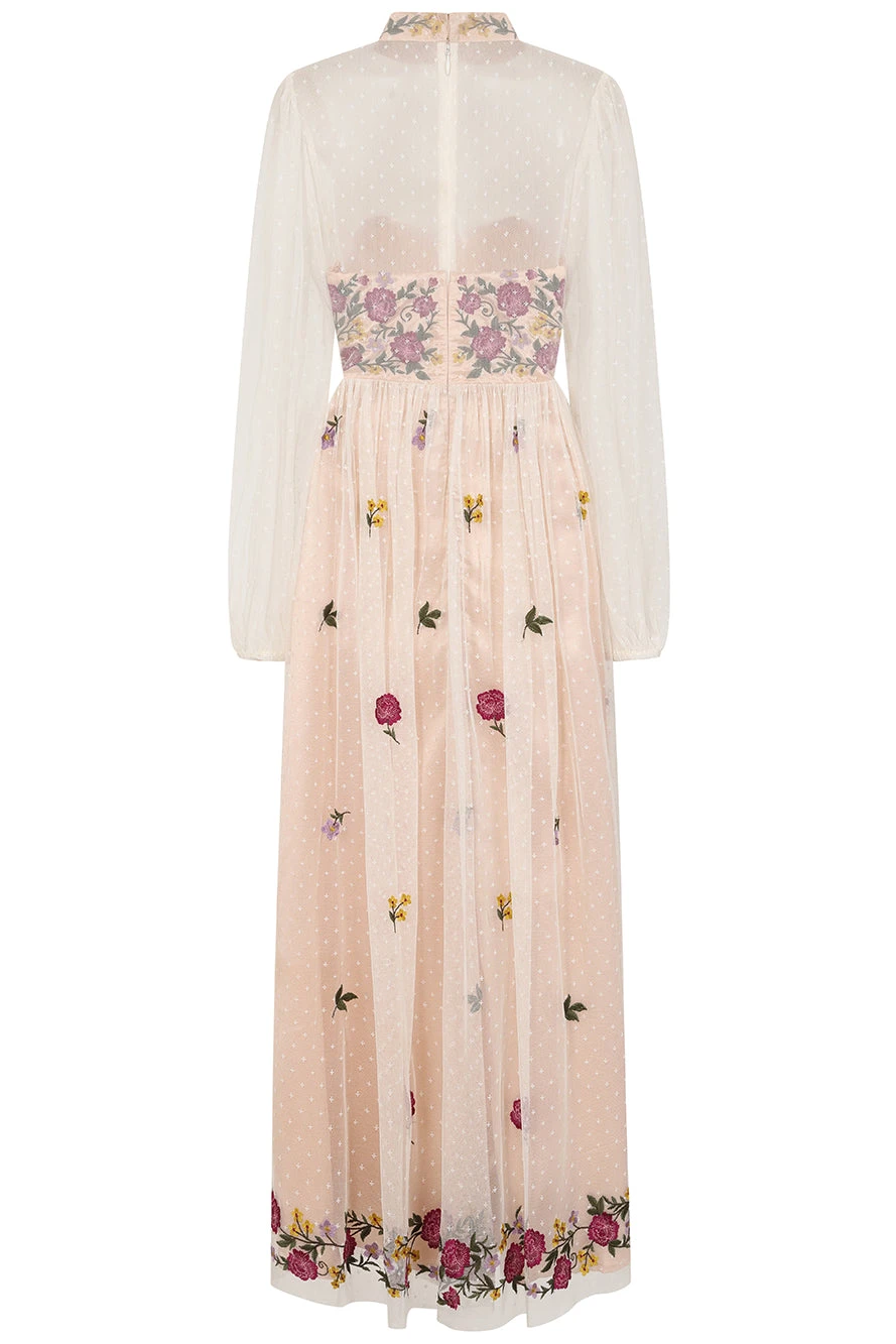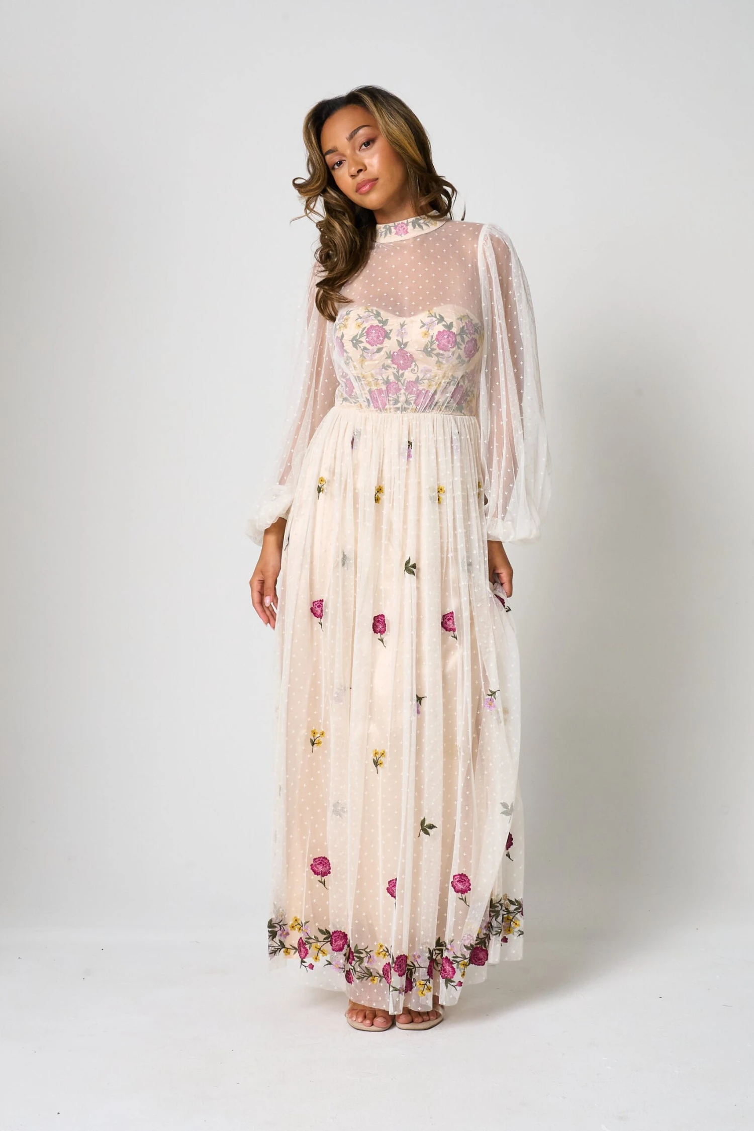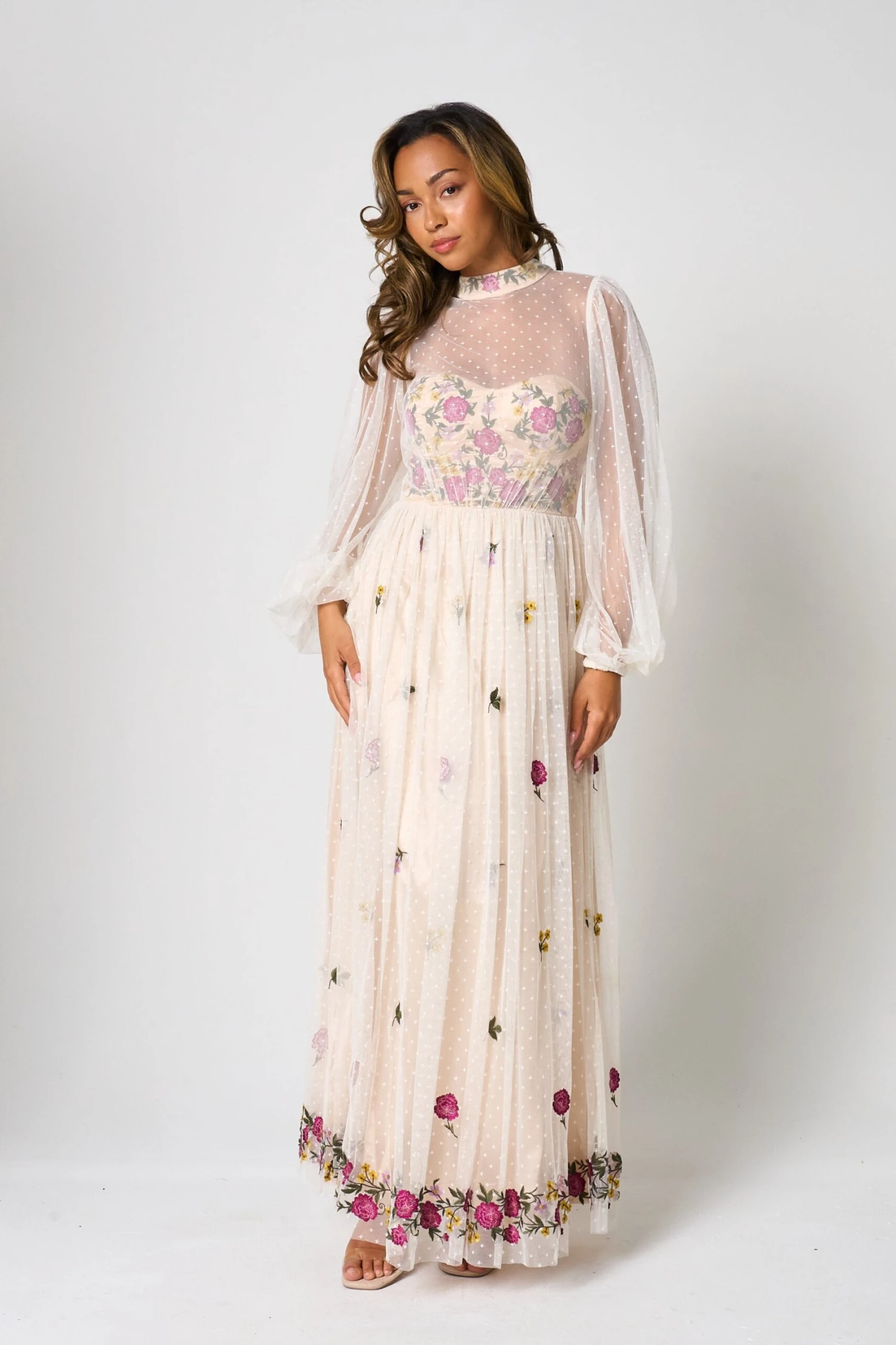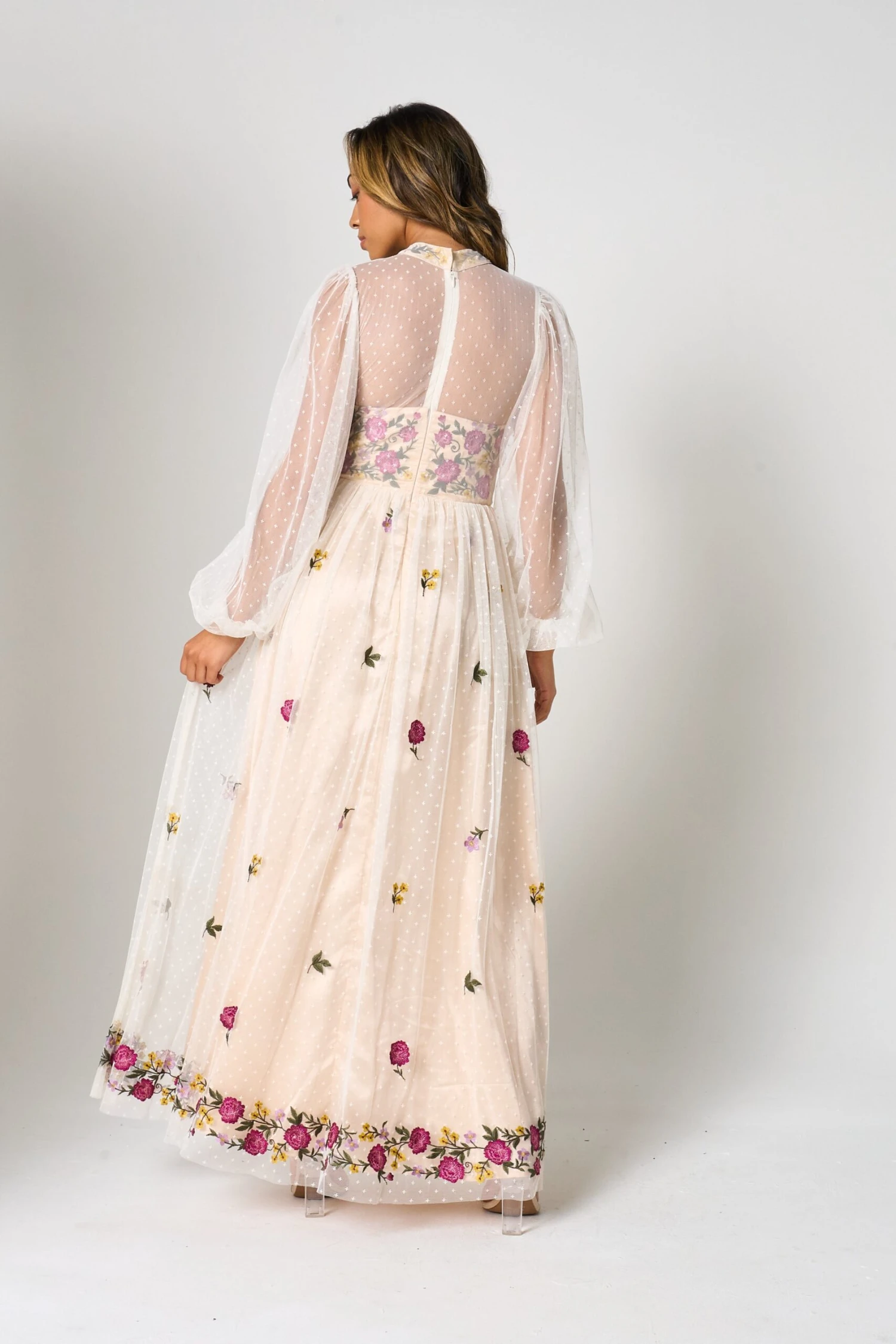 Indulge in a romantic floral fantasy with Gaia. Champagne in hue, this maxi length dress comprises of a fitted, strapless bodice and a voluminous full length skirt. Gaia is overlaid with polka dot mesh and embroidered through out with floral detailing.
