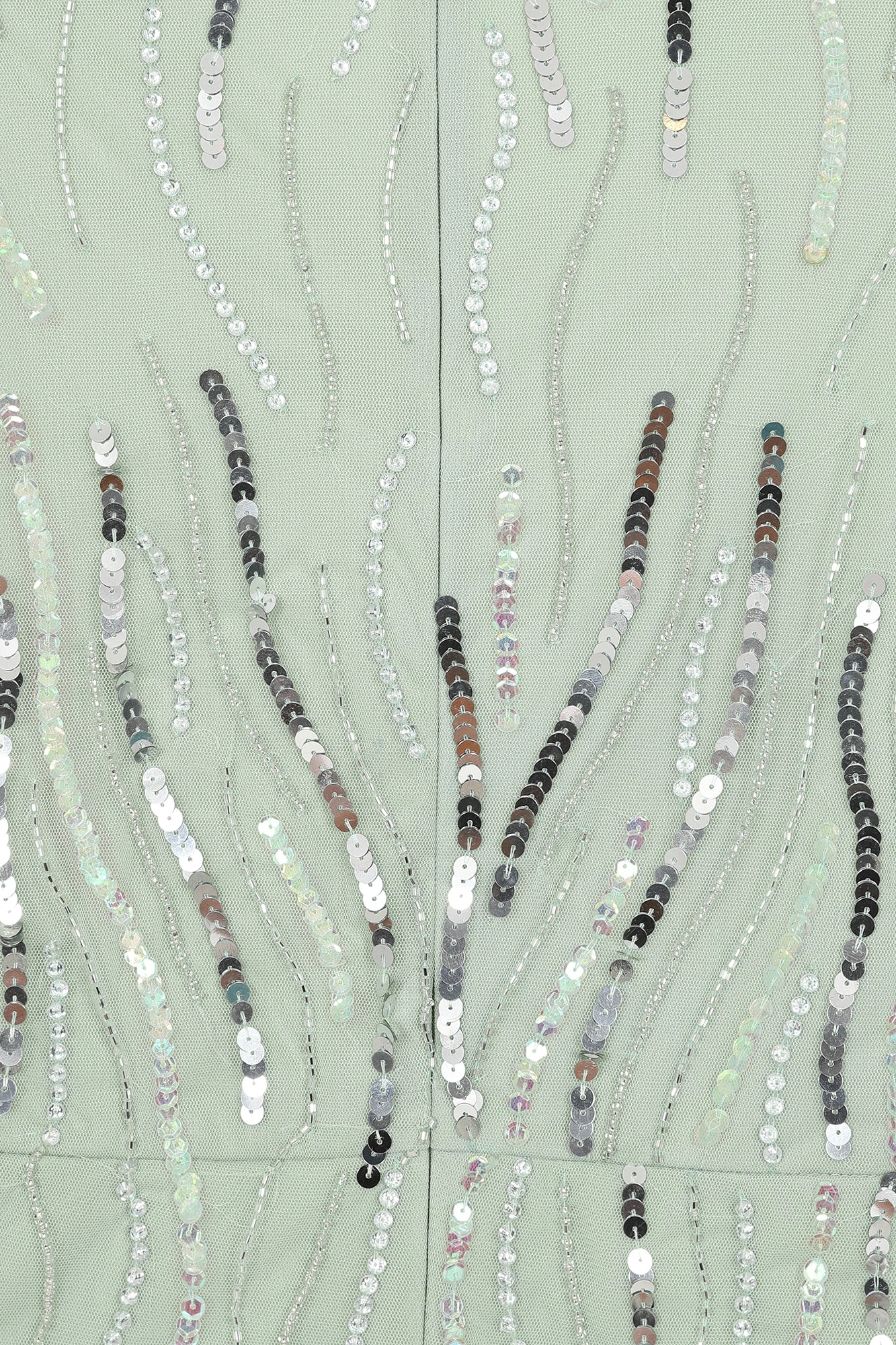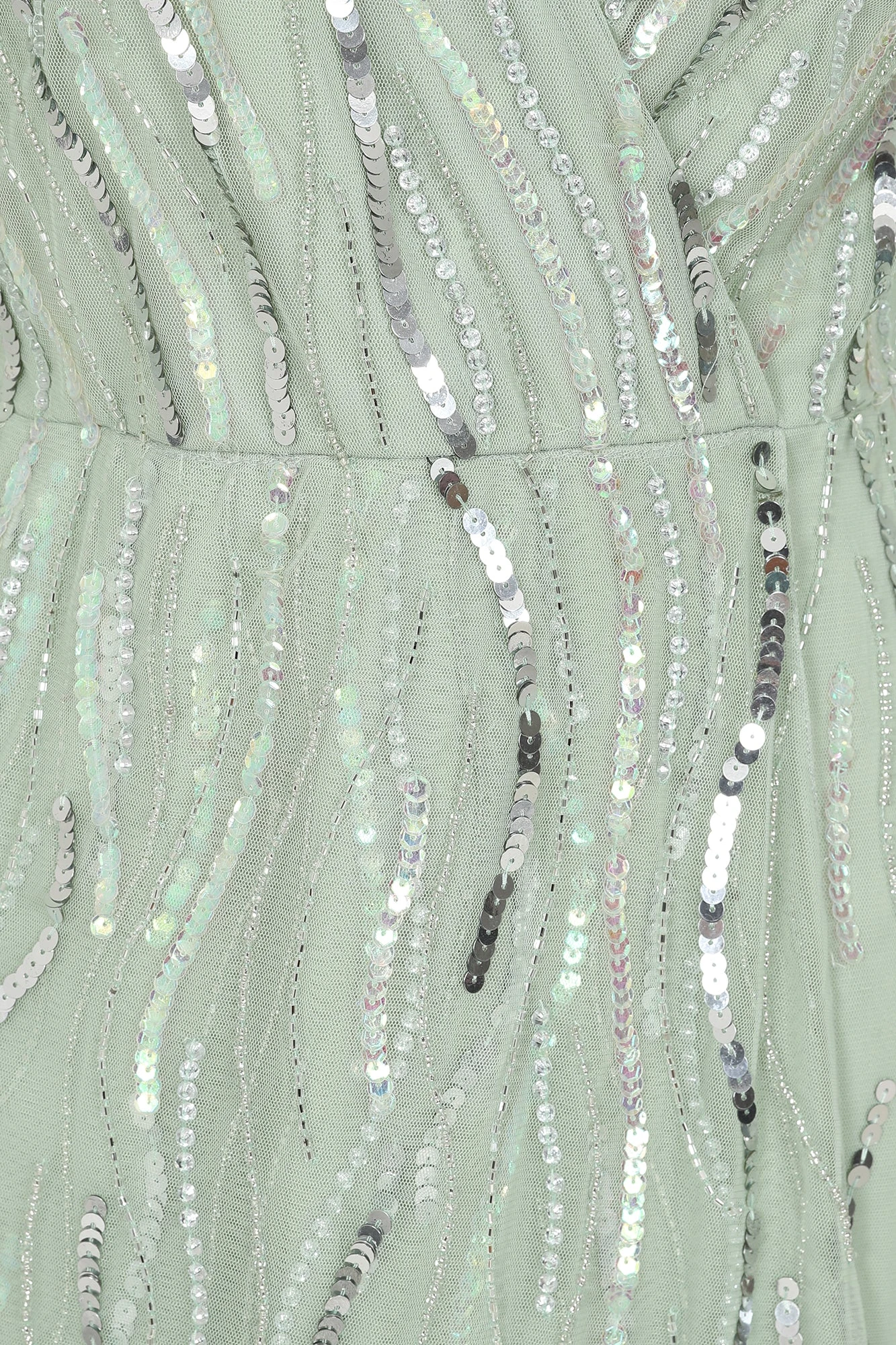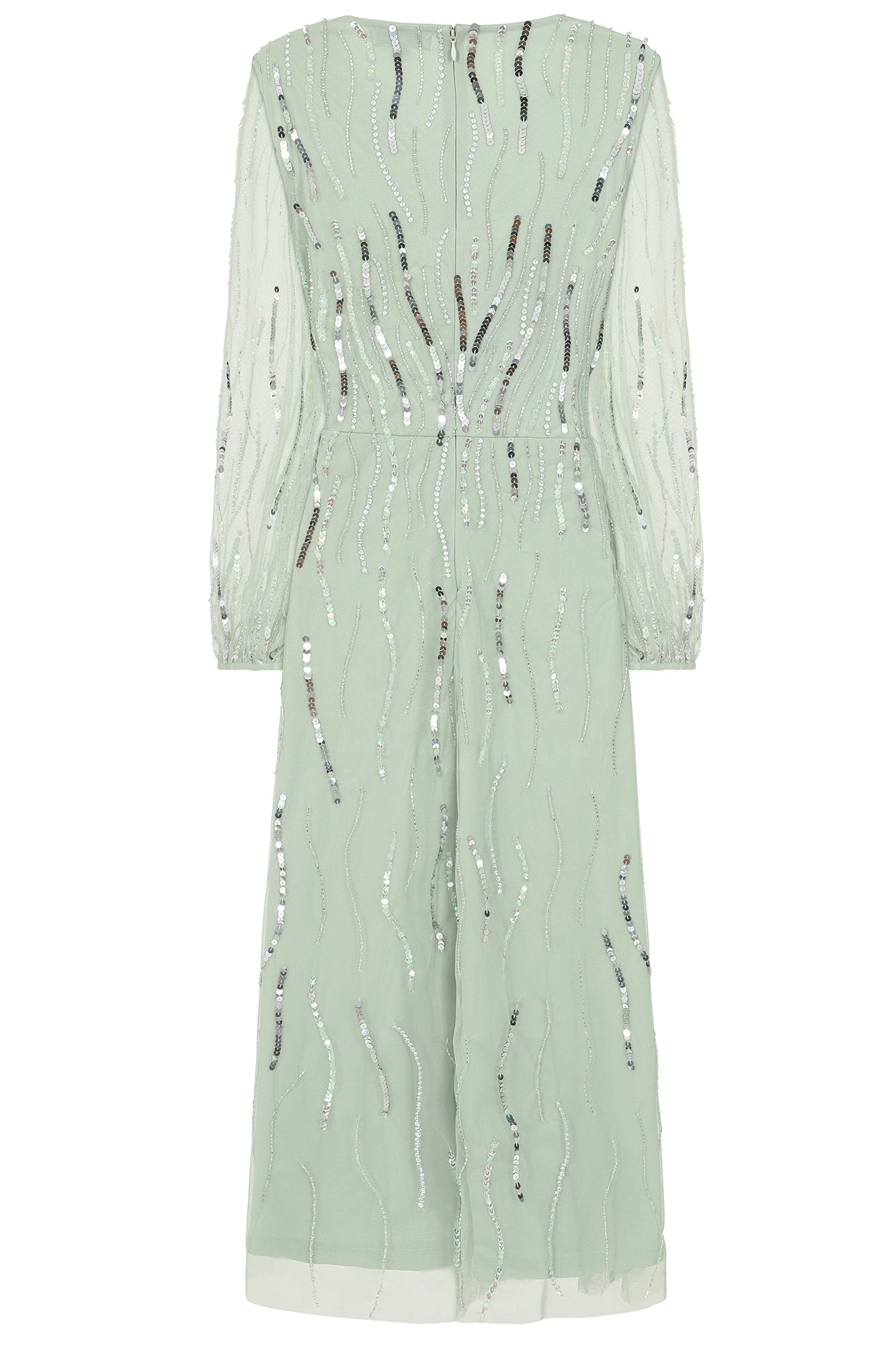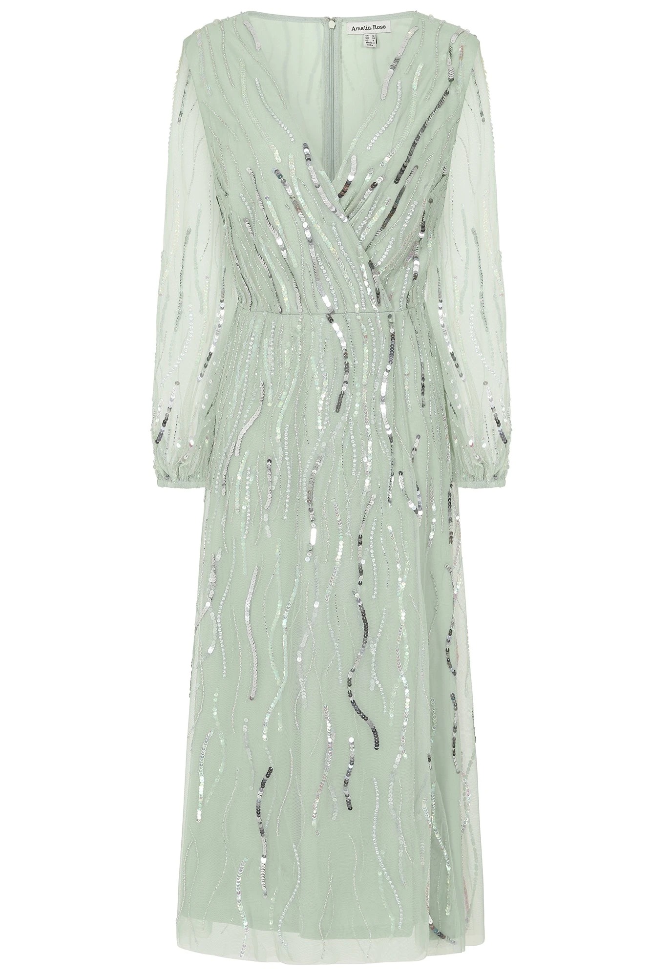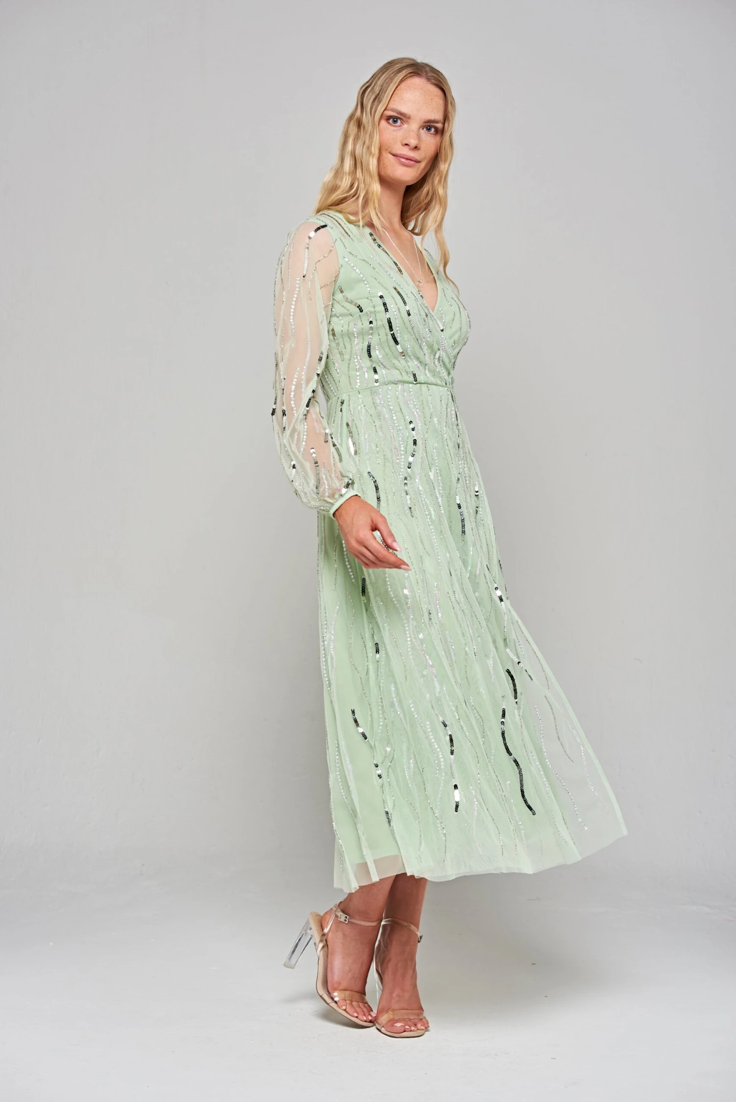 Step serenely into any special occasion with the pale green Geneva. Midi in length, this long sleeved dress features a wrap style neckline and is complete with abstract swirls of silver sequin embellishment.