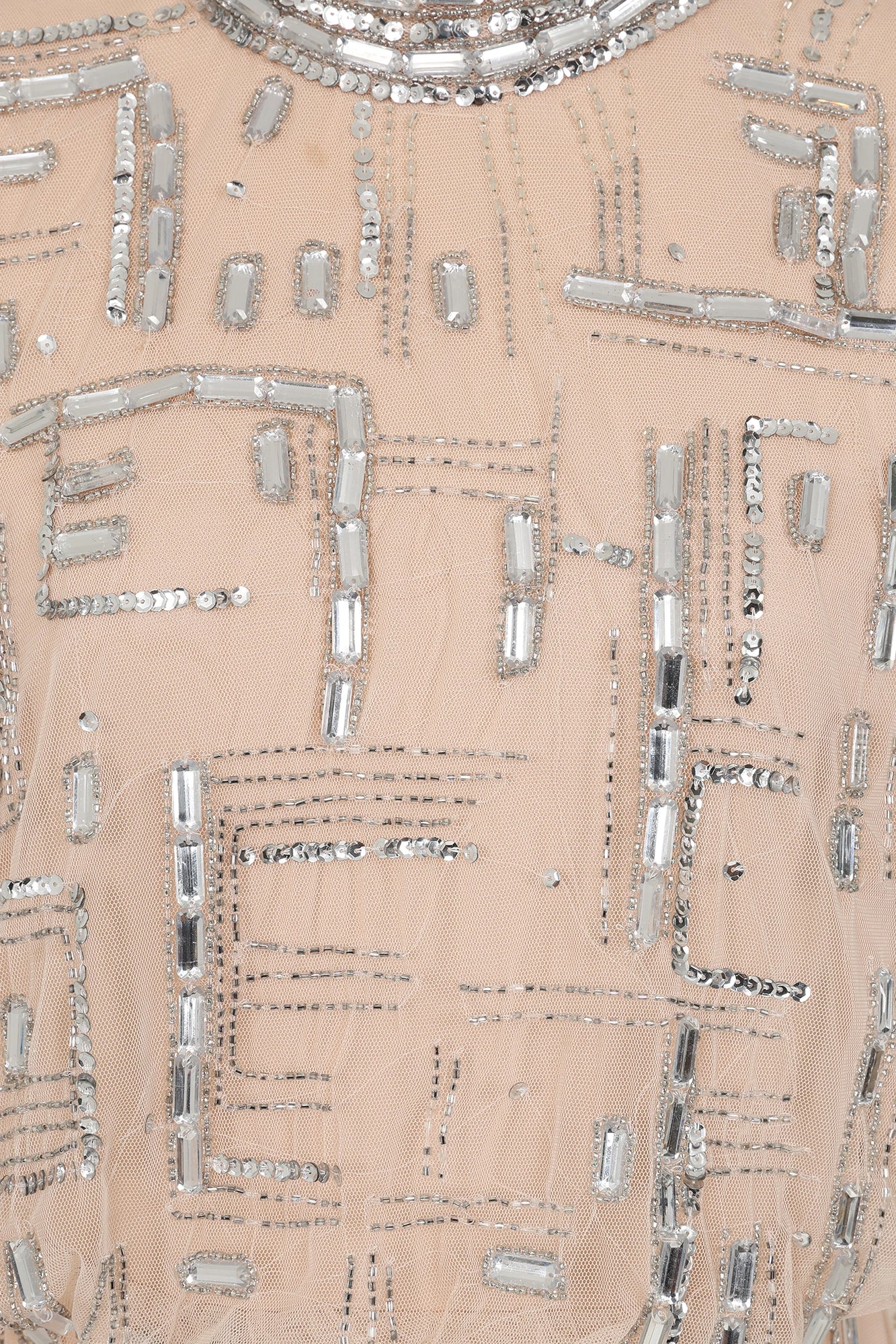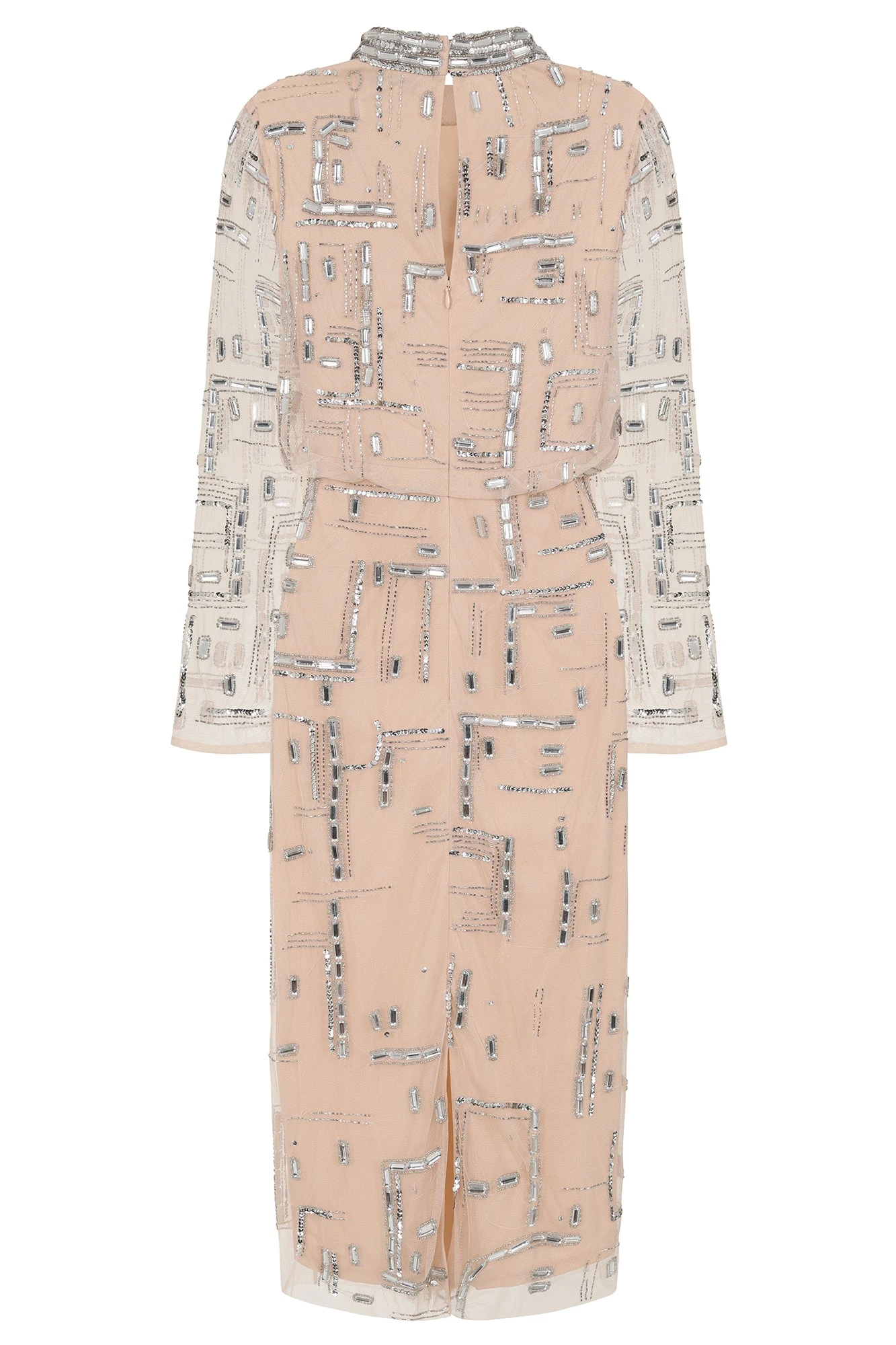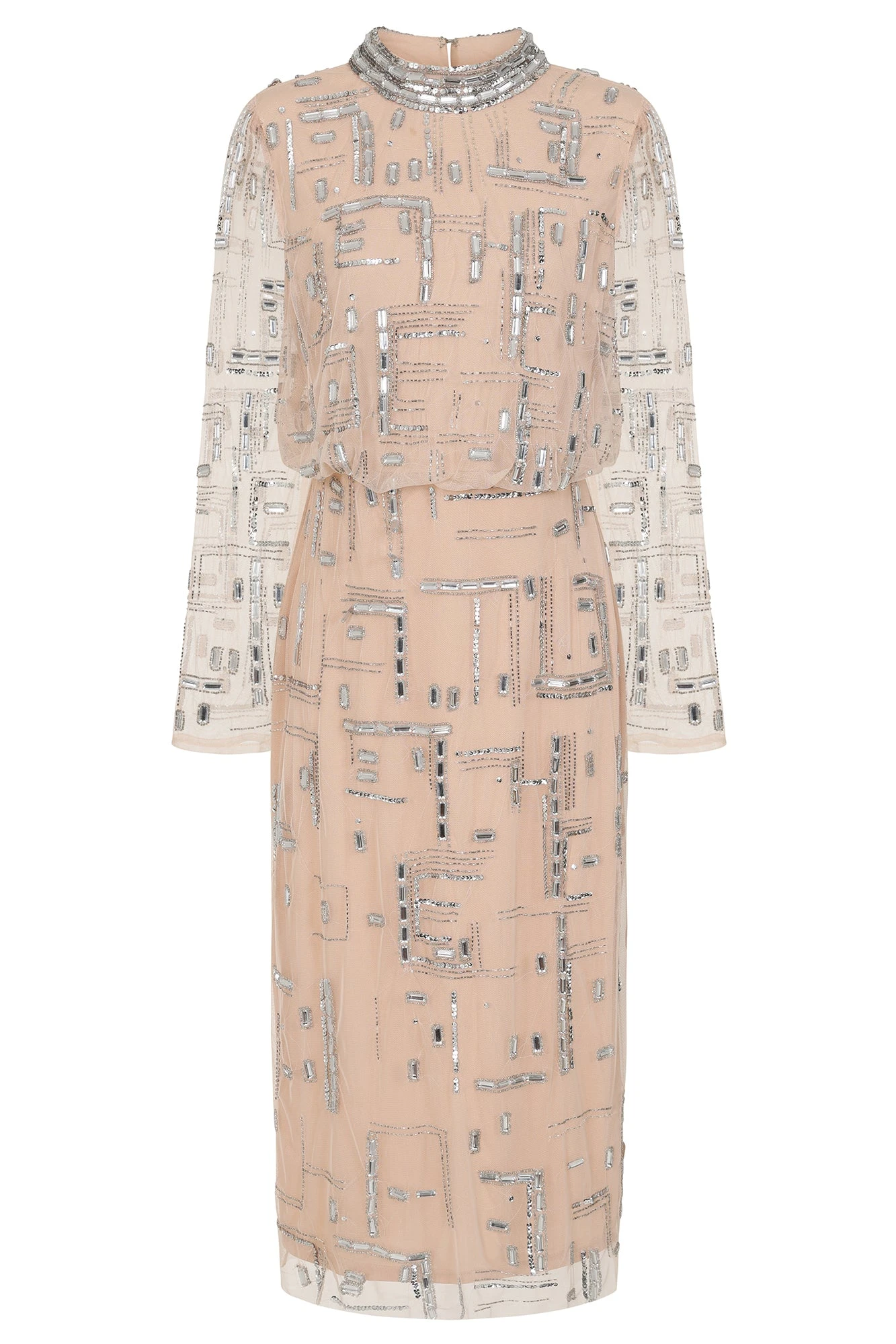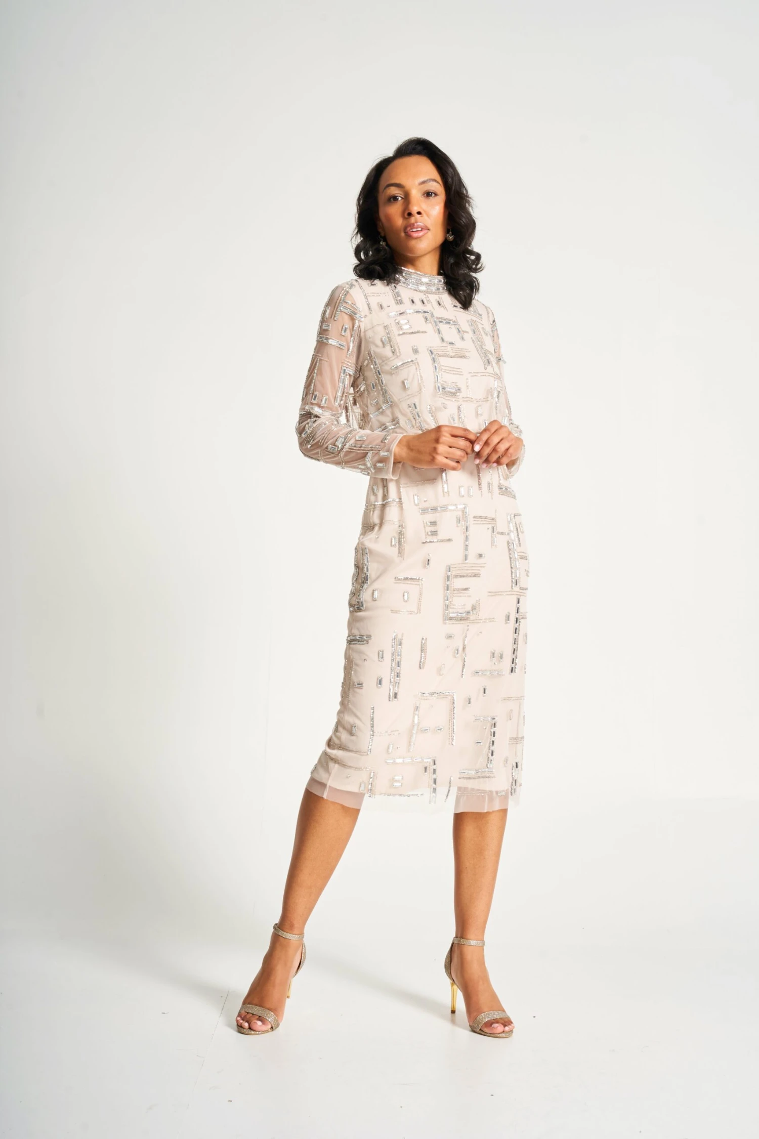 A showstopping dress in a neutral hue, Giselle showcases eye-catching embellished detailing throughout. Midi in length, this style features a high neckline, figure-skimming pencil skirt and full length sleeves.