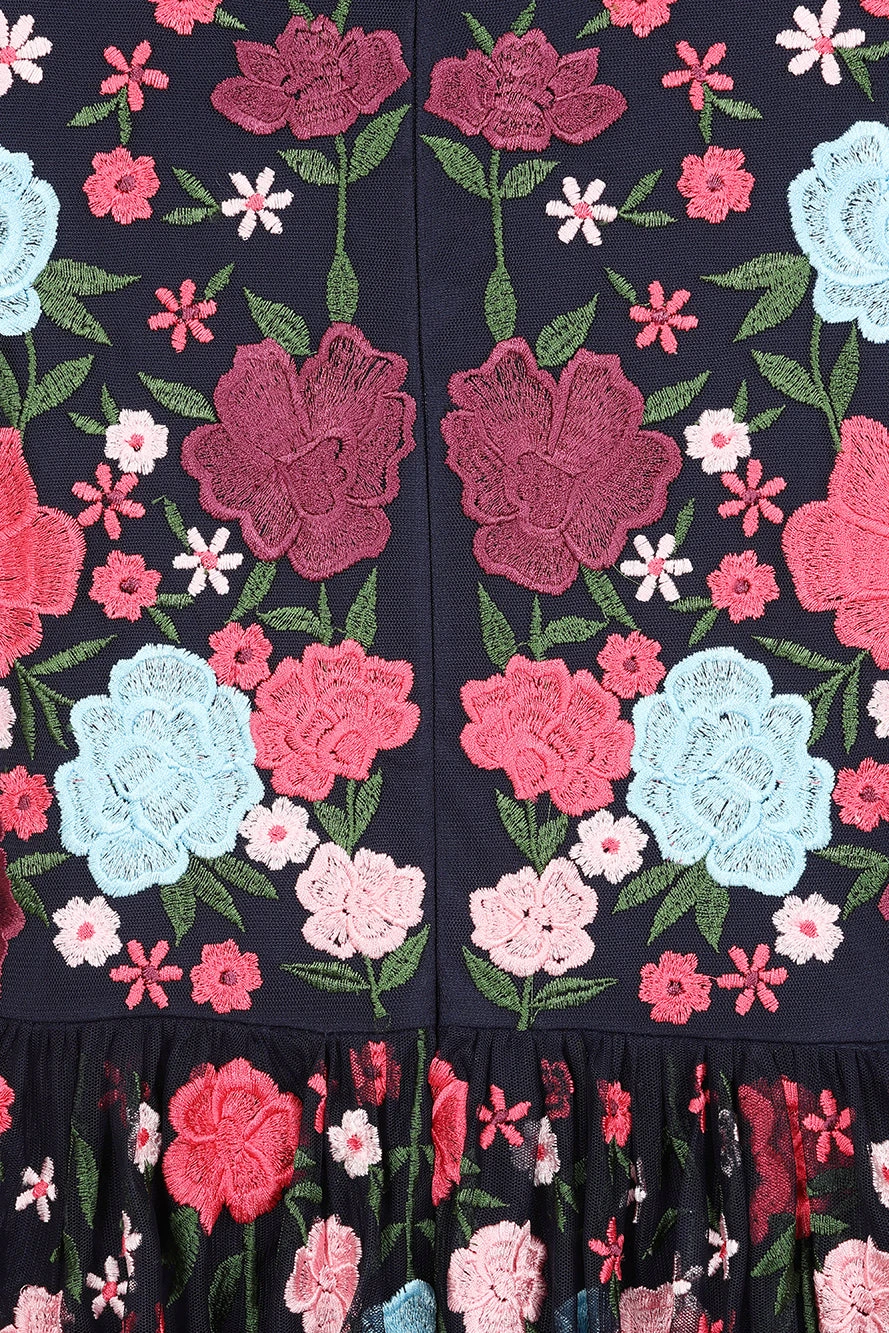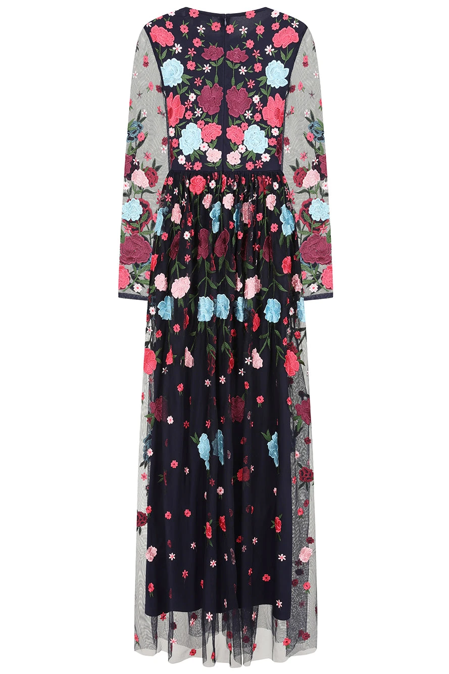 Go full-on floral this spring with Iris. Contrasting a minimal silhouette with colourful all-over embroidery, this long sleeved navy maxi dress is the perfect choice for weddings, garden parties and race day.