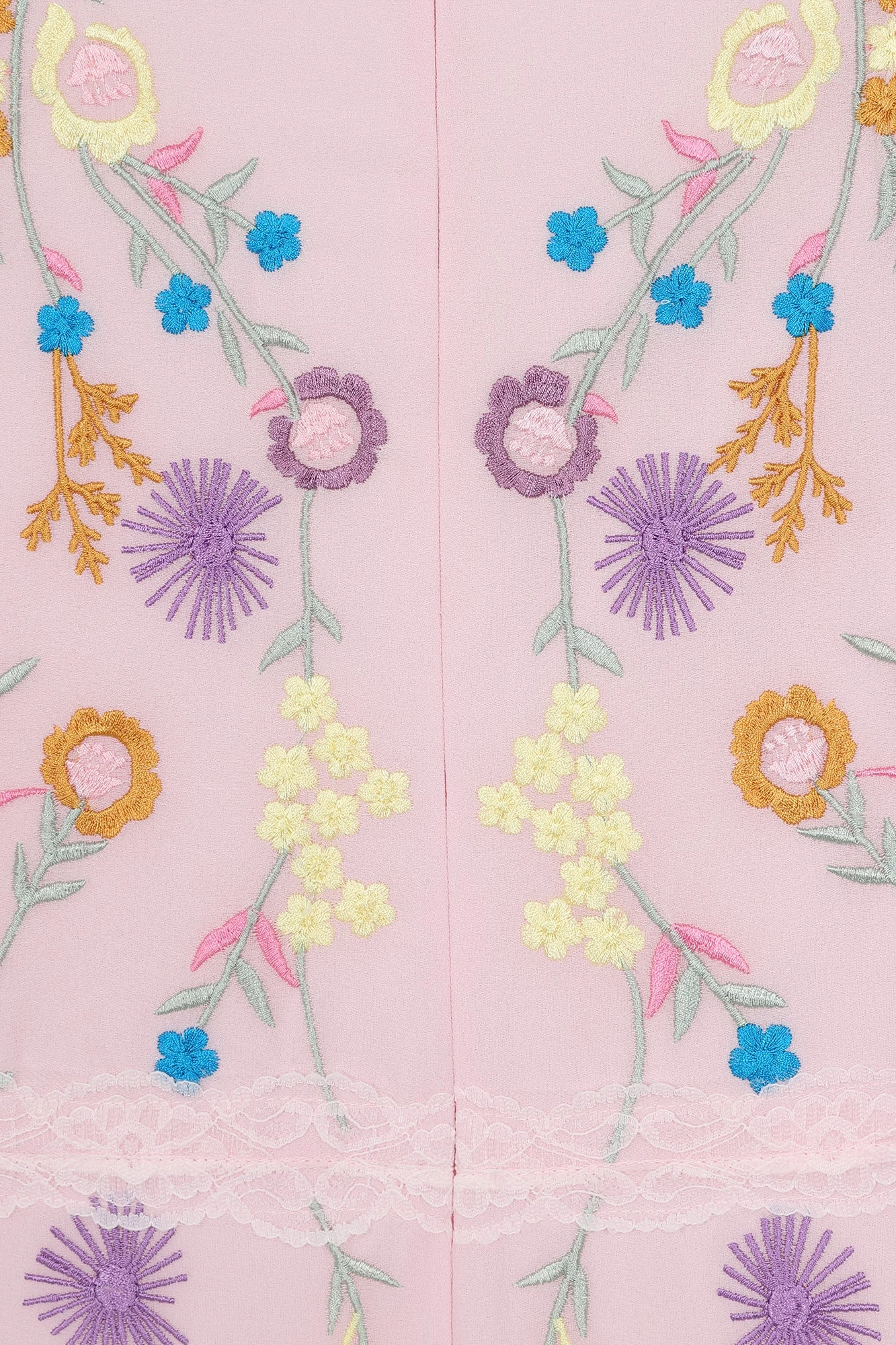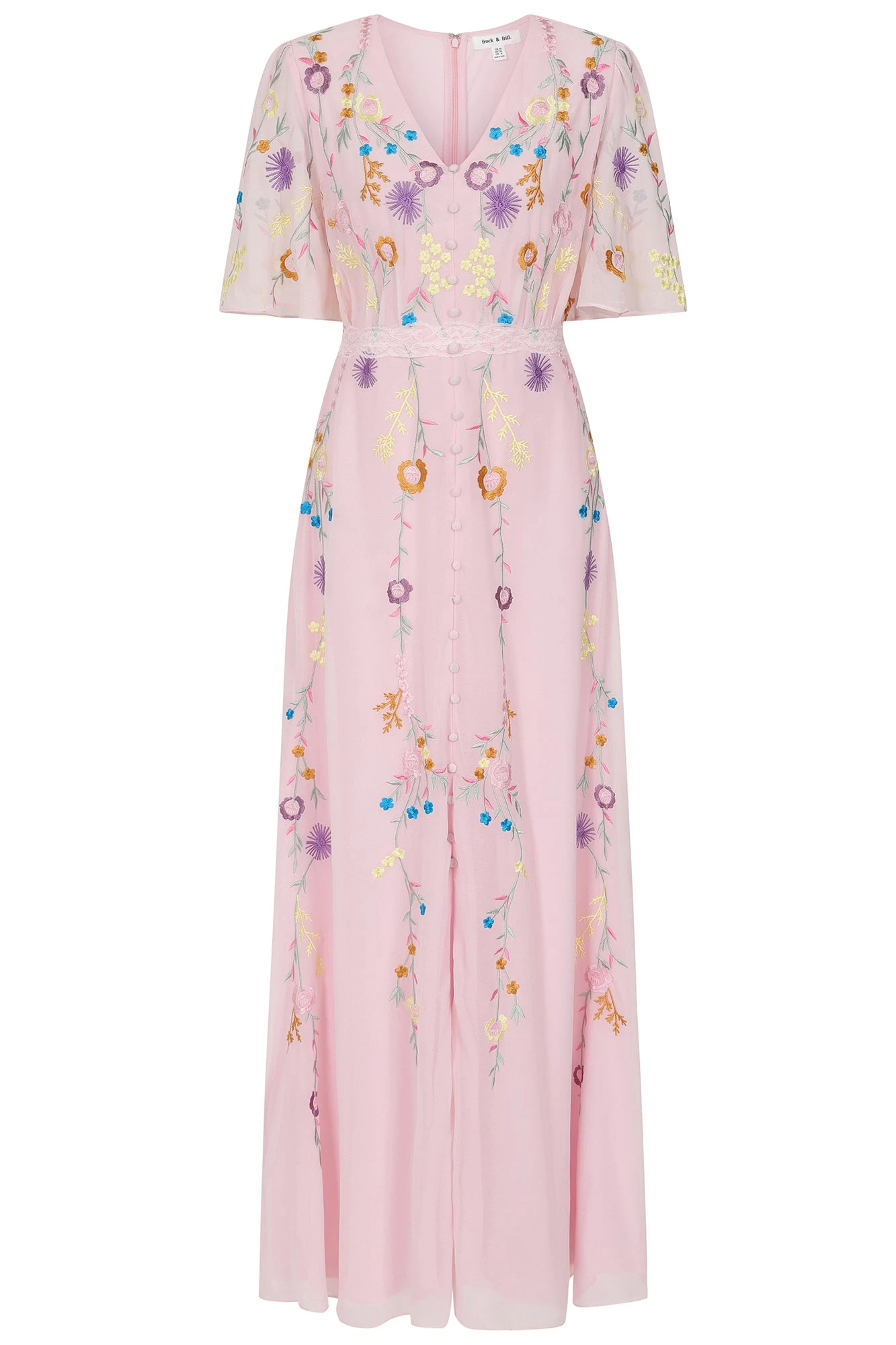 Live life joyfully with Irisa! Cut in a minimal, button through silhouette, this blush pink maxi dress is populated throughout with vibrantly coloured floral embroidery. Featuring short sleeves and a v neckline, tonal lace trim around the waist completes this style.