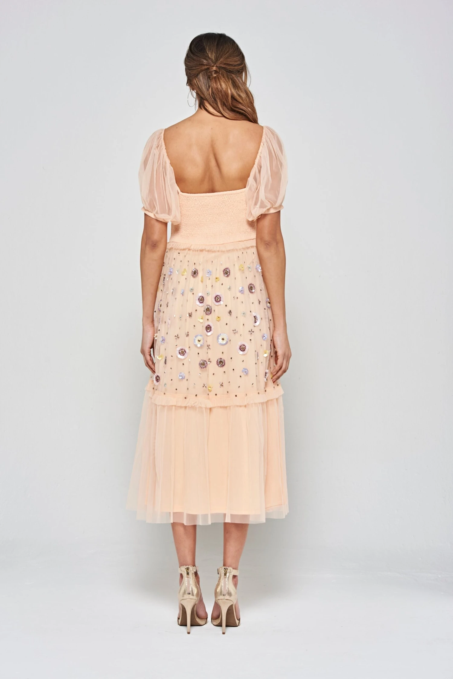 Bringing a touch of glamour to the classic floral midi dress, Jalin is artfully adorned with colourful embellishment, arranged in a ditsy floral motif. Set atop a pale, almond hued mesh, this pretty detailing is complimented by a square neckline, puff sleeves and ruffled trim. Pick out the pastel tones of the sequin flowers and style Jalin with candy coloured heels and accessories for a seriously sweet Summer outfit.