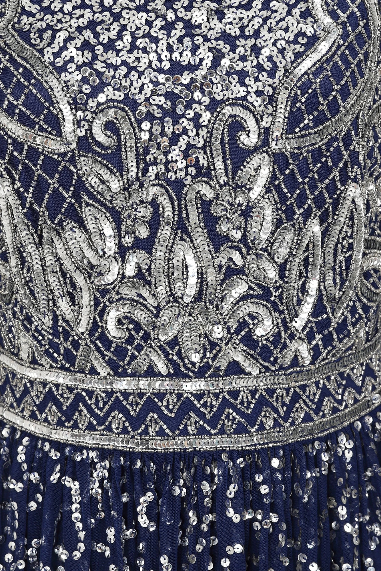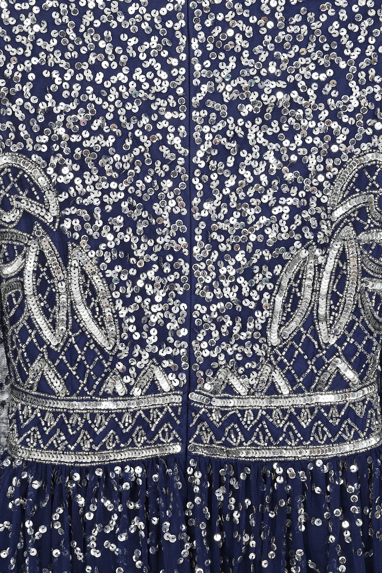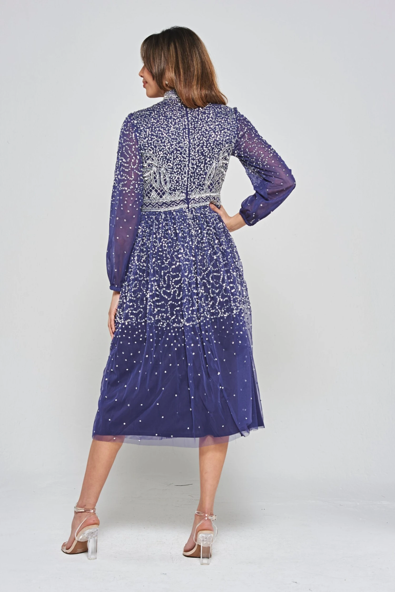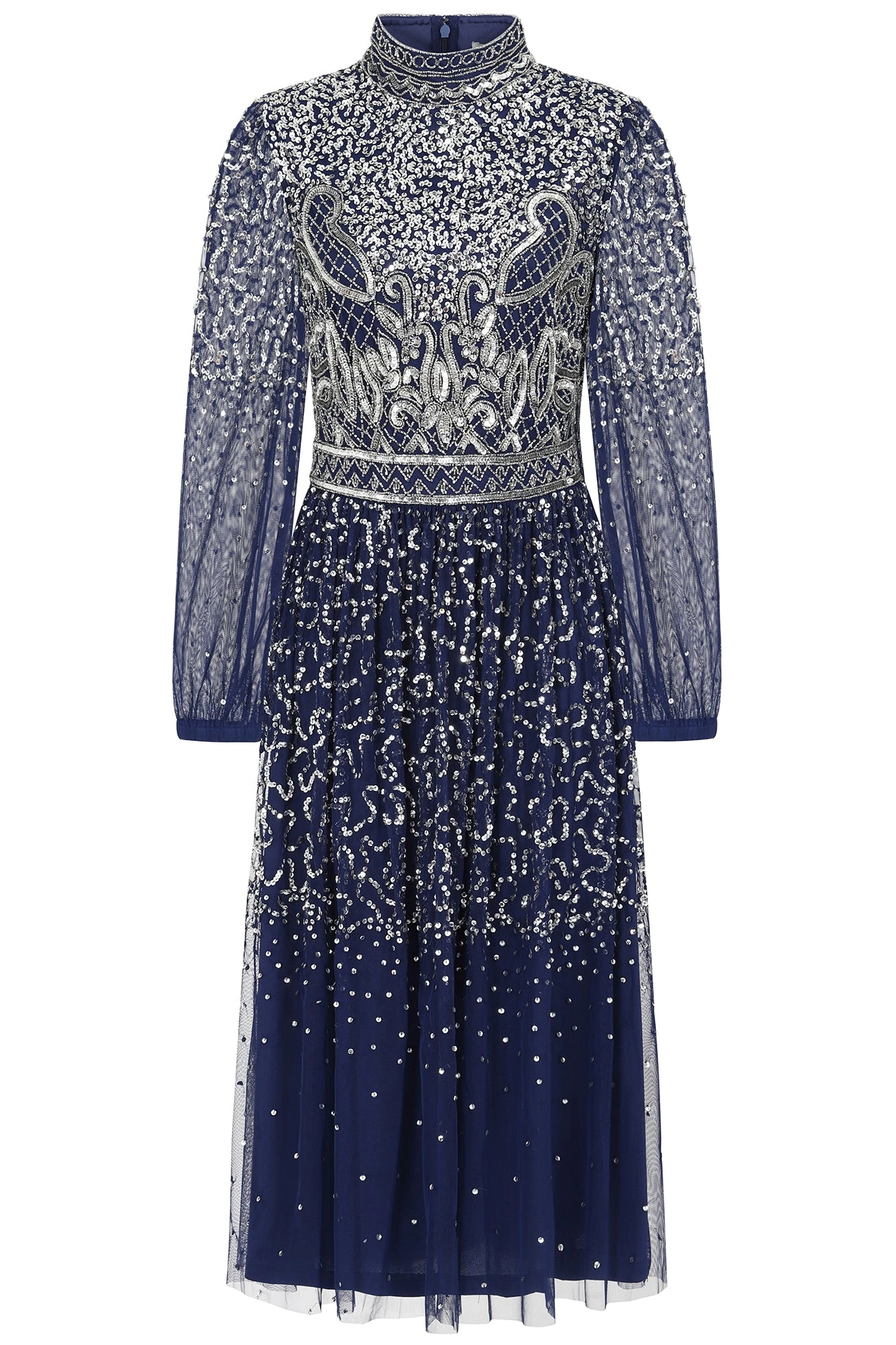 Shine bright this party season with our sparkling Jeanne dress. Realised in a navy blue hue, this long sleeved midi is decked with eye-catching silver embellishment. Jeanne is complete with a statement high neckline and a full length lining.