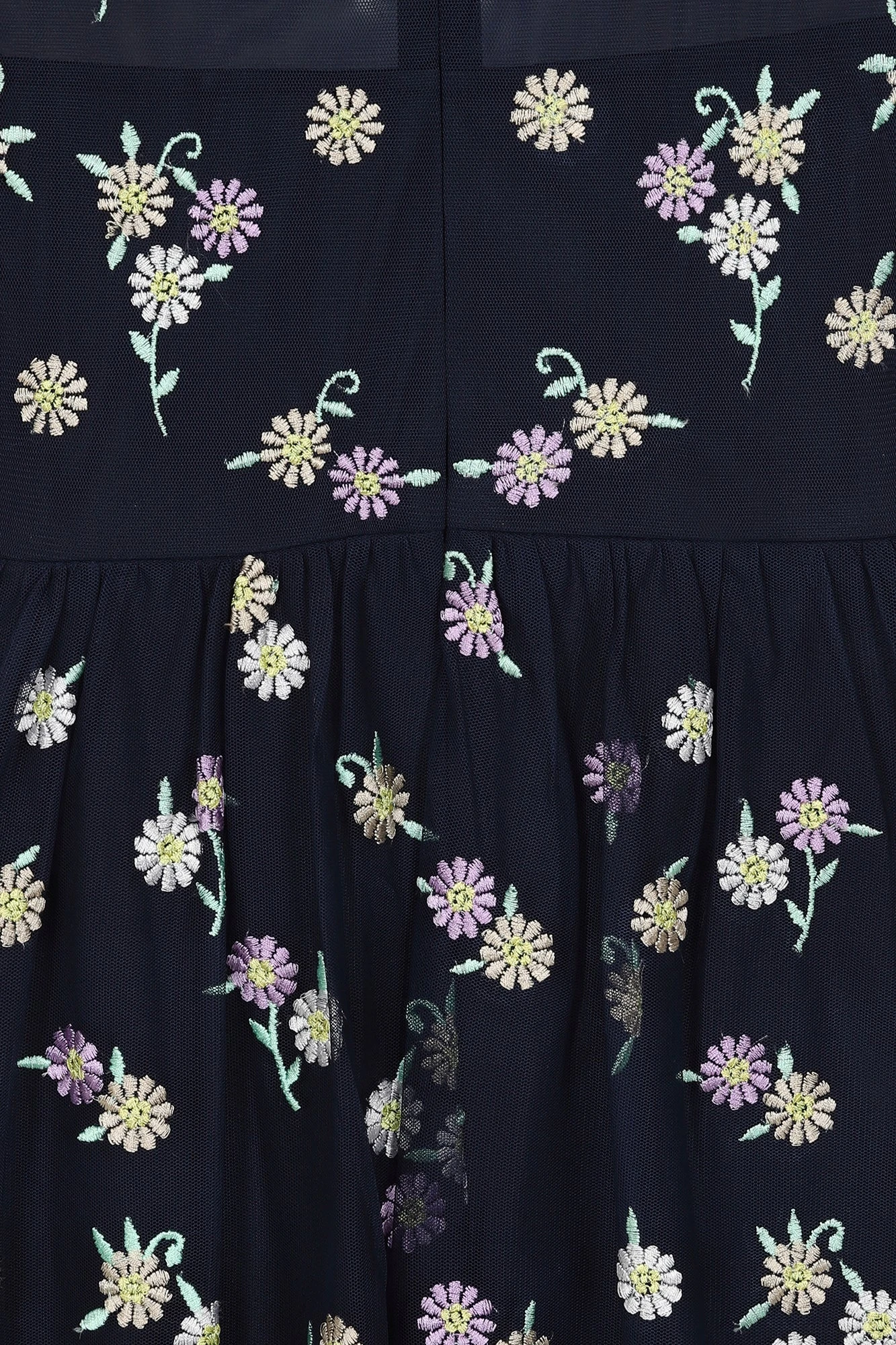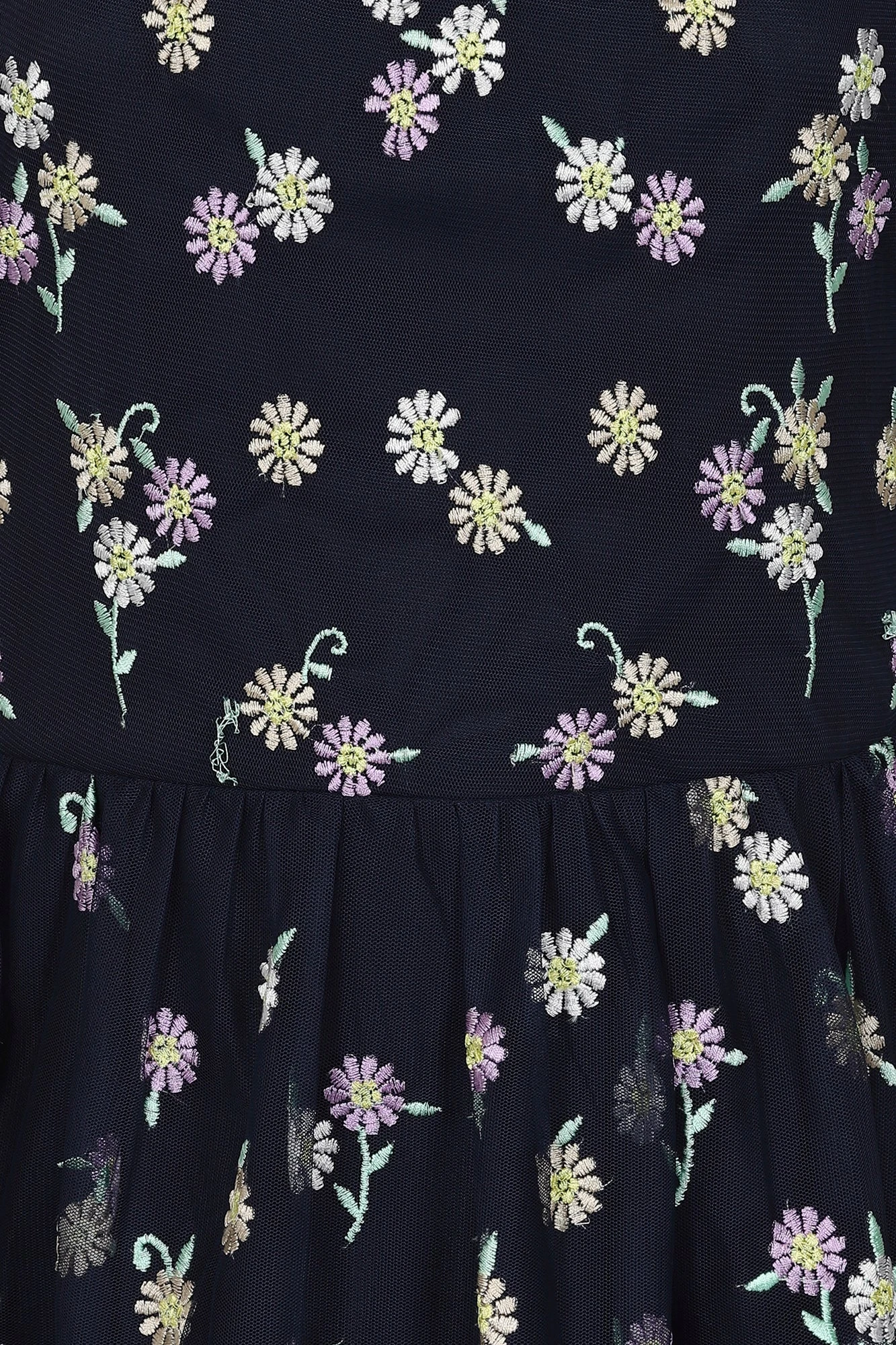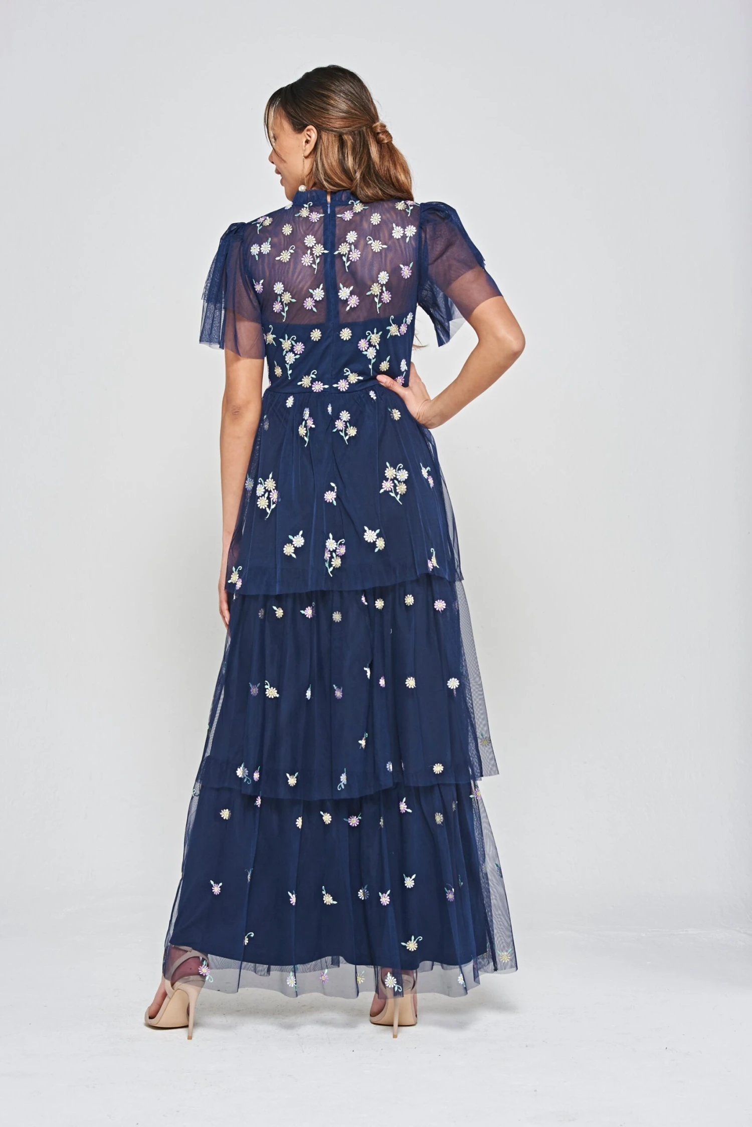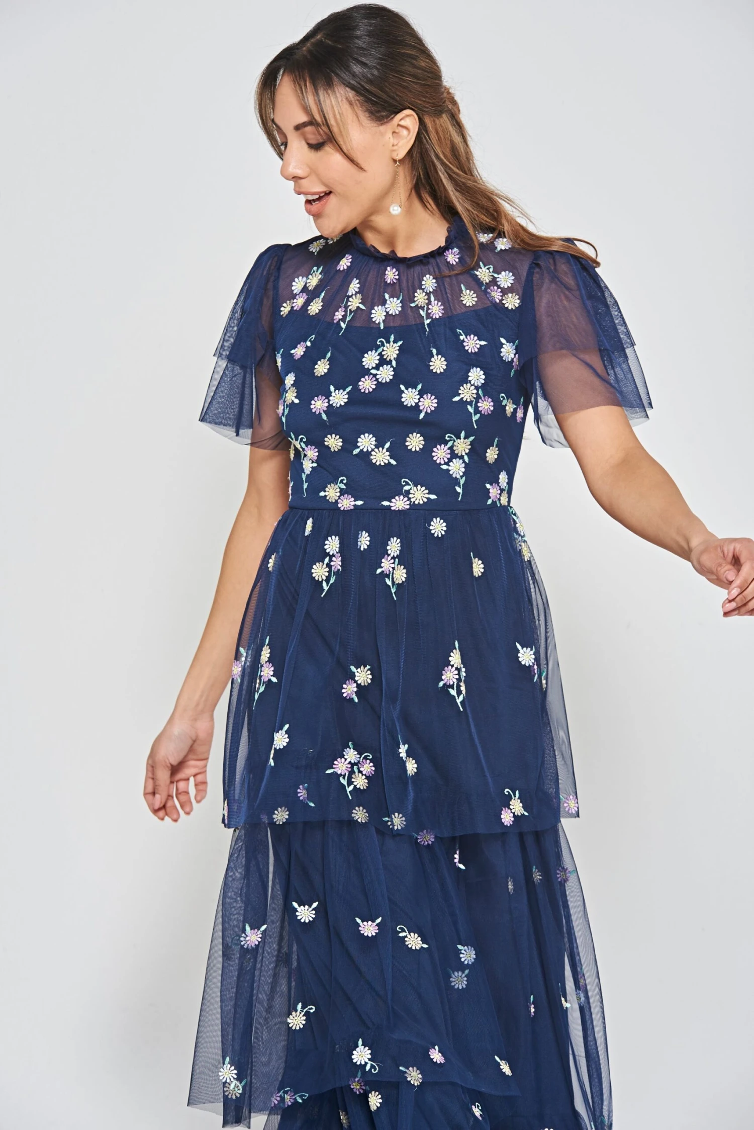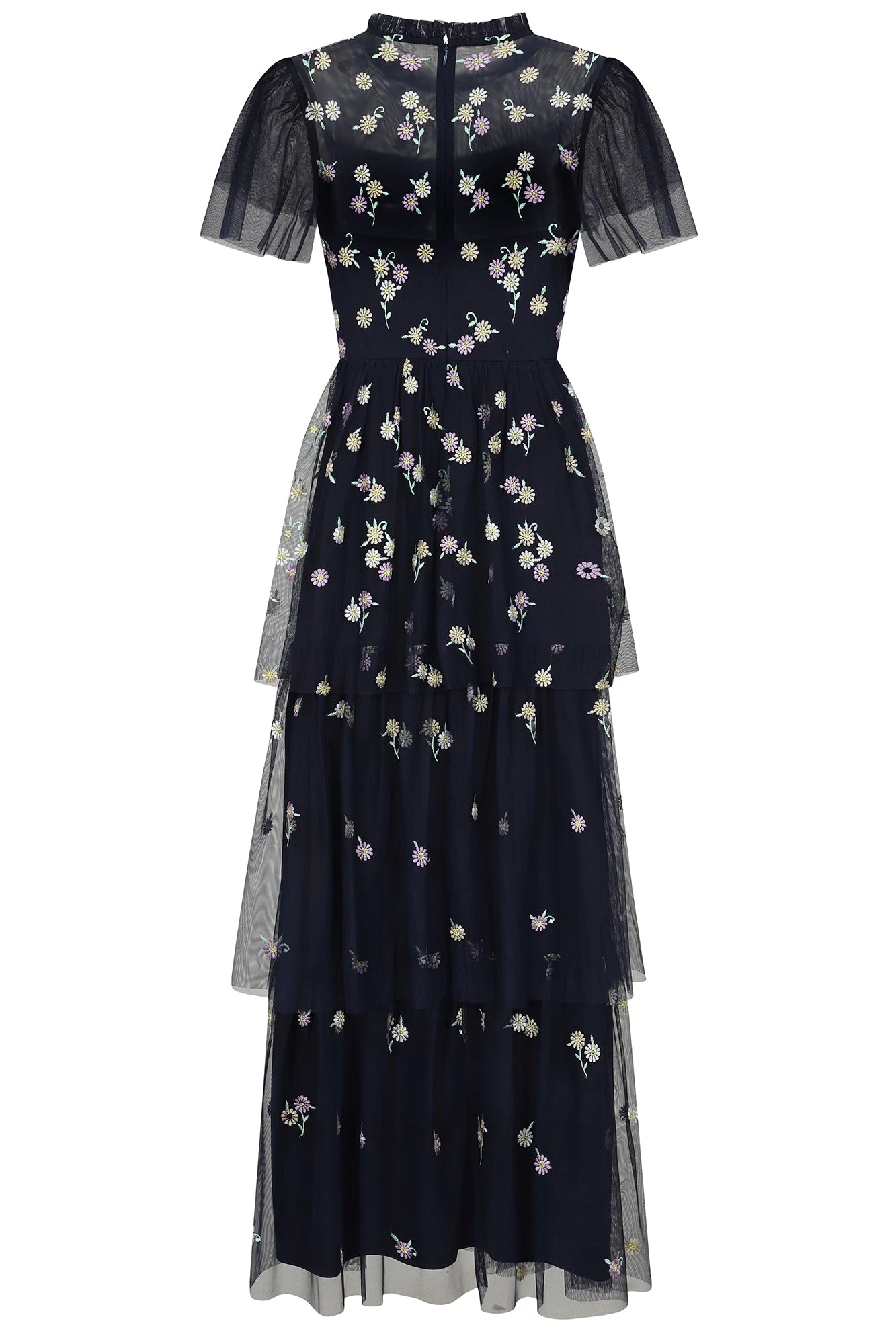 A dress designed for special days, the deep navy Jemima is overflowing with delightful pink and yellow daisy embroidery. Overlaid with tiers of gauzy mesh, this maxi length frock ensures a swish with every step. Jemima is complete with a high gathered neckline and flutter style sleeves.