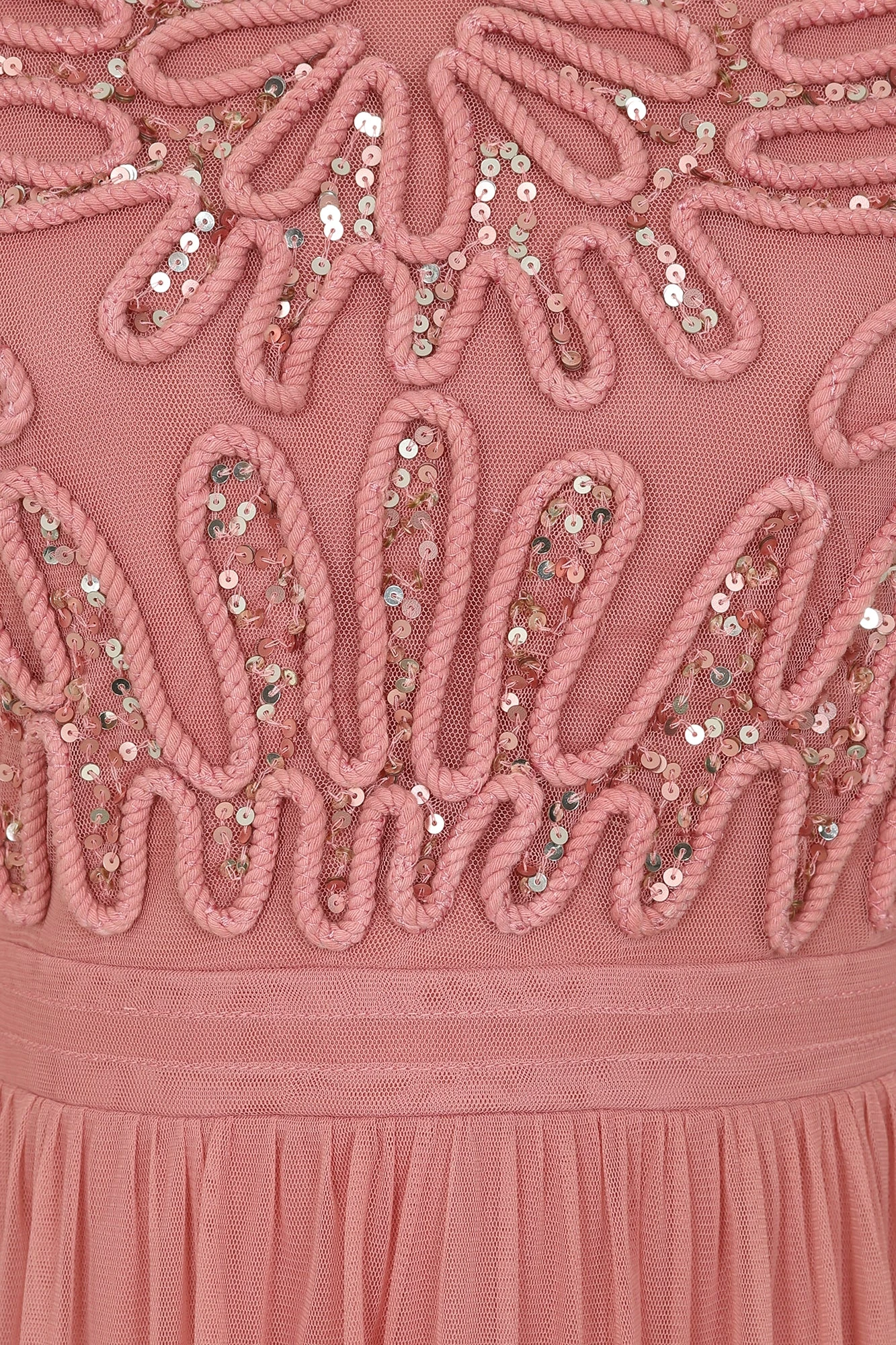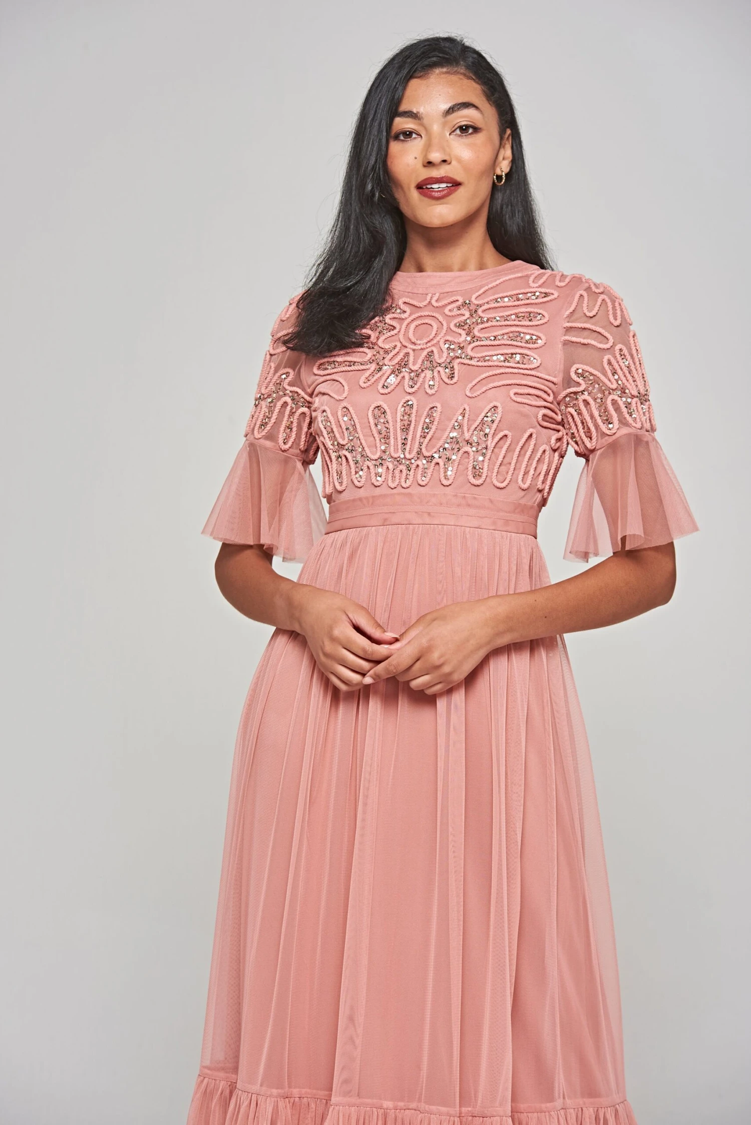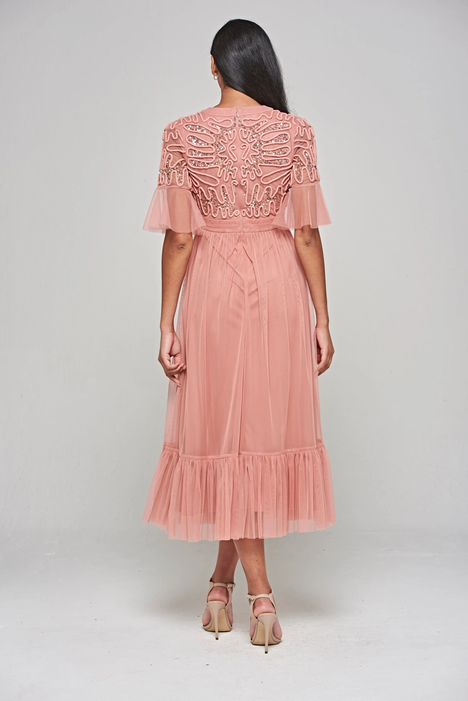 Resplendent in rose tan, the thoroughly feminine Jenna is the perfect choice for winter weddings and special occasions! Boasting a bodice intricately embroidered with cornelli detailing and scattered with rose gold sequins, this darling midi is complete with a gently flaring tulle skirt.