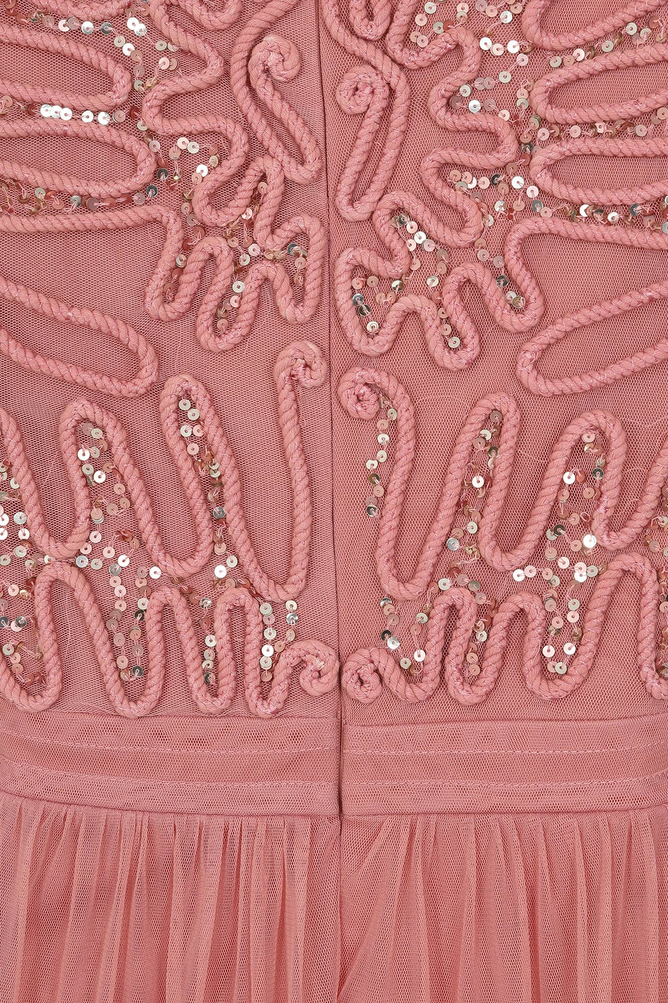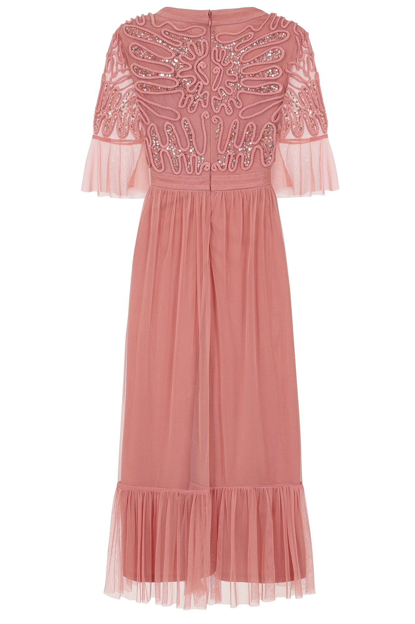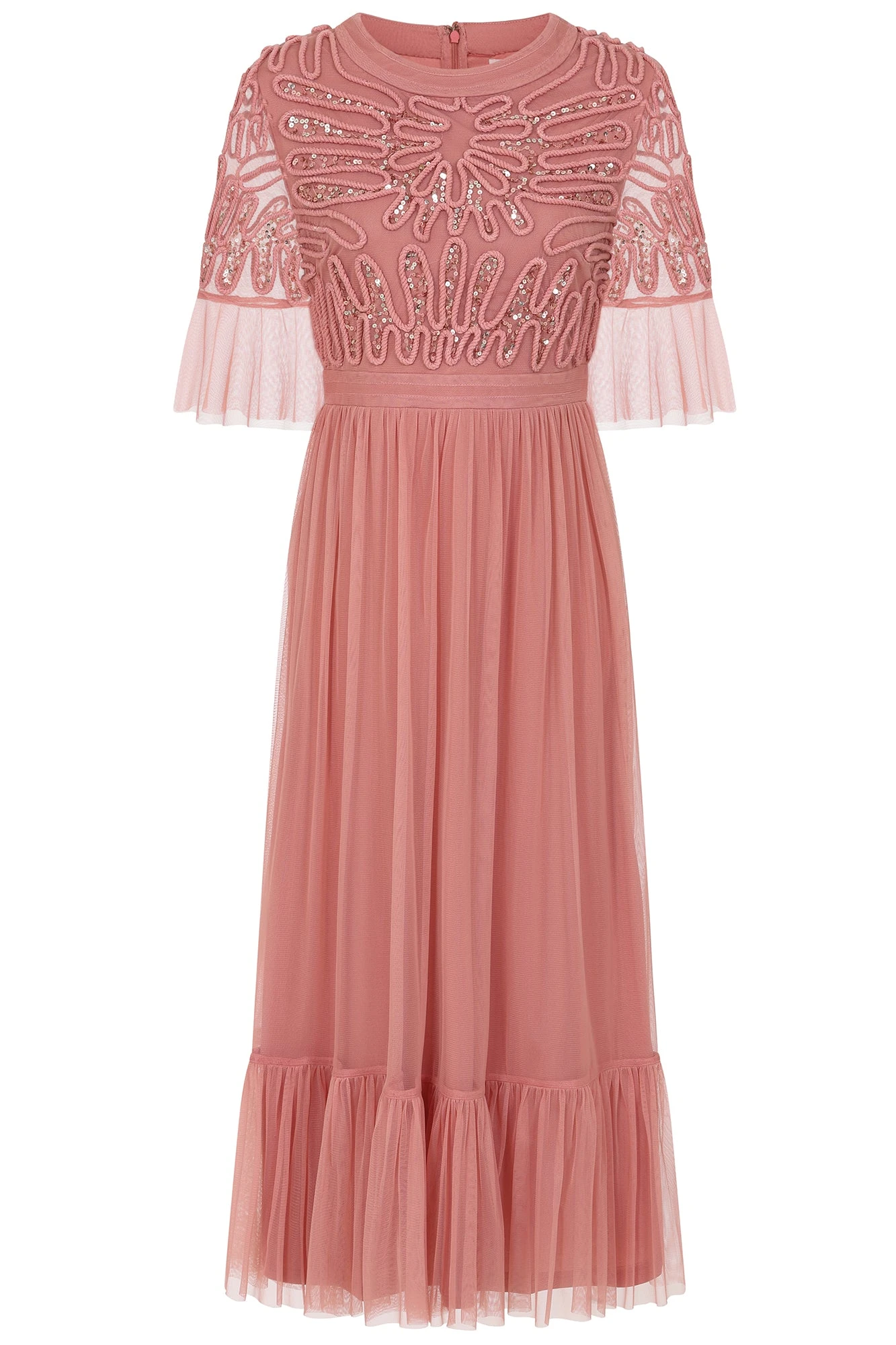 Resplendent in rose tan, the thoroughly feminine Jenna is the perfect choice for winter weddings and special occasions! Boasting a bodice intricately embroidered with cornelli detailing and scattered with rose gold sequins, this darling midi is complete with a gently flaring tulle skirt.