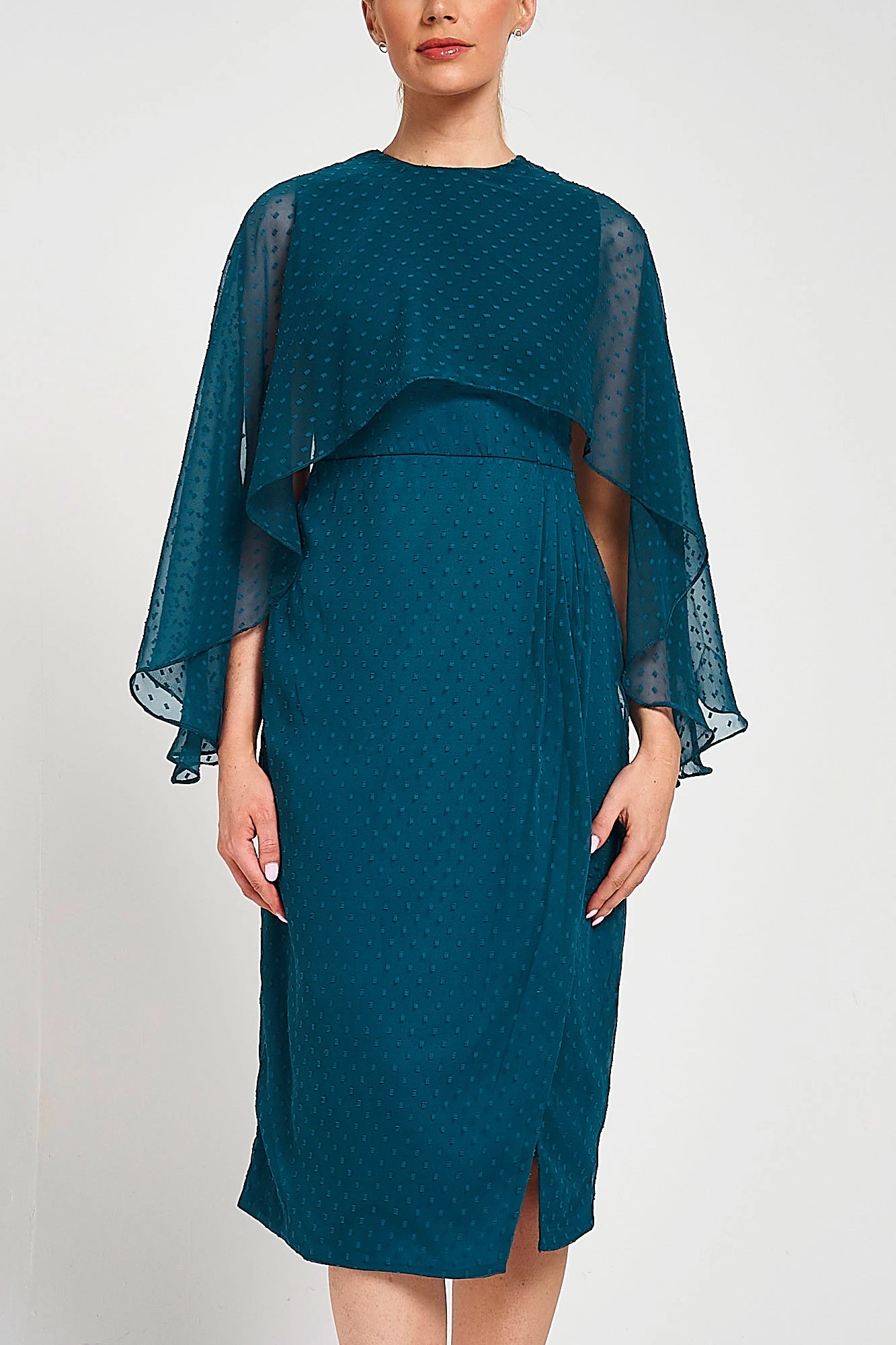 Brighten up any day in our teal blue Juliet. Midi in length, this style consists of a figure skimming, pencil-style dress sat beneath a flowing cape overlay. Style with silver accessories for an instant special occasion outfit.