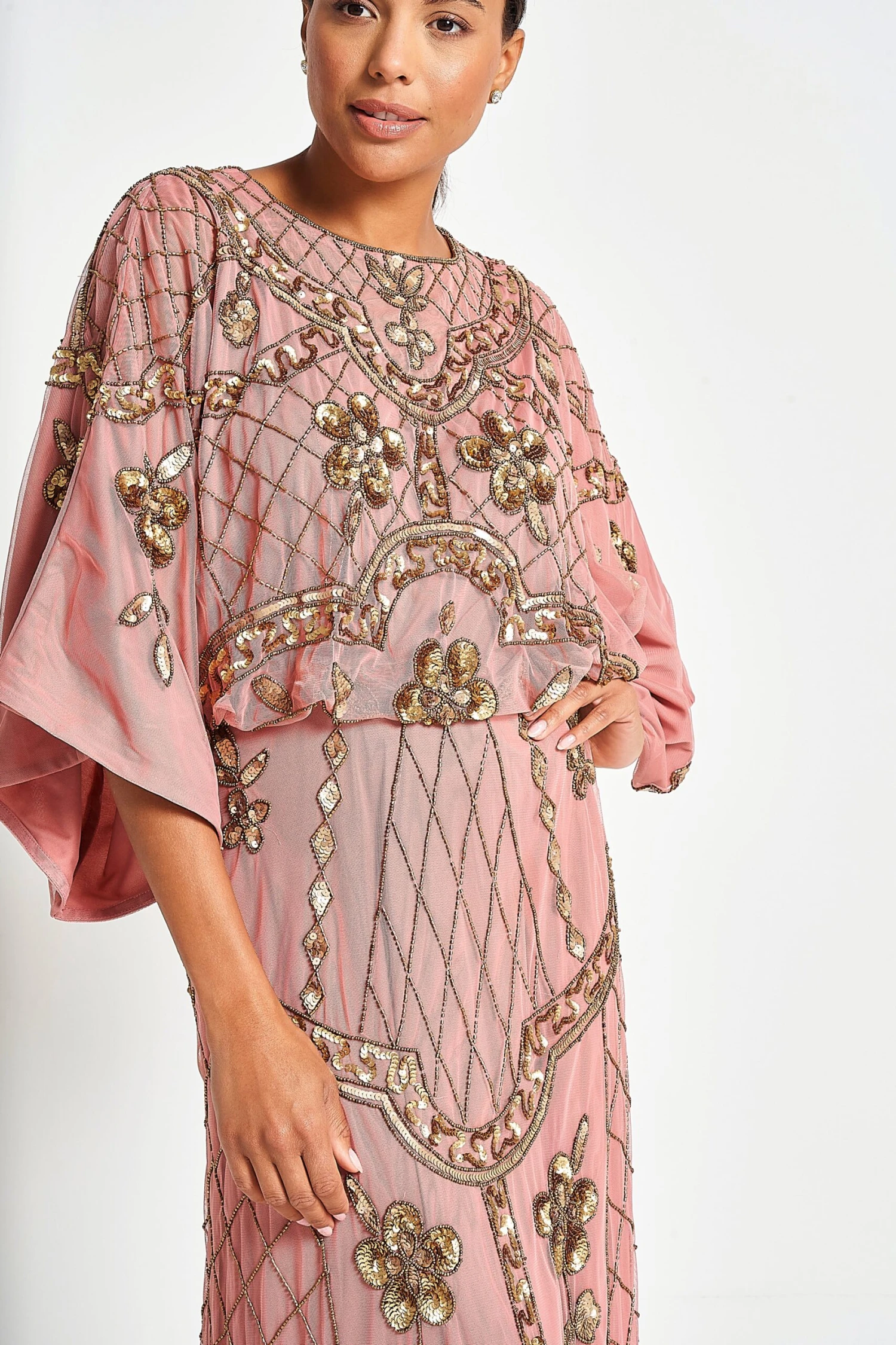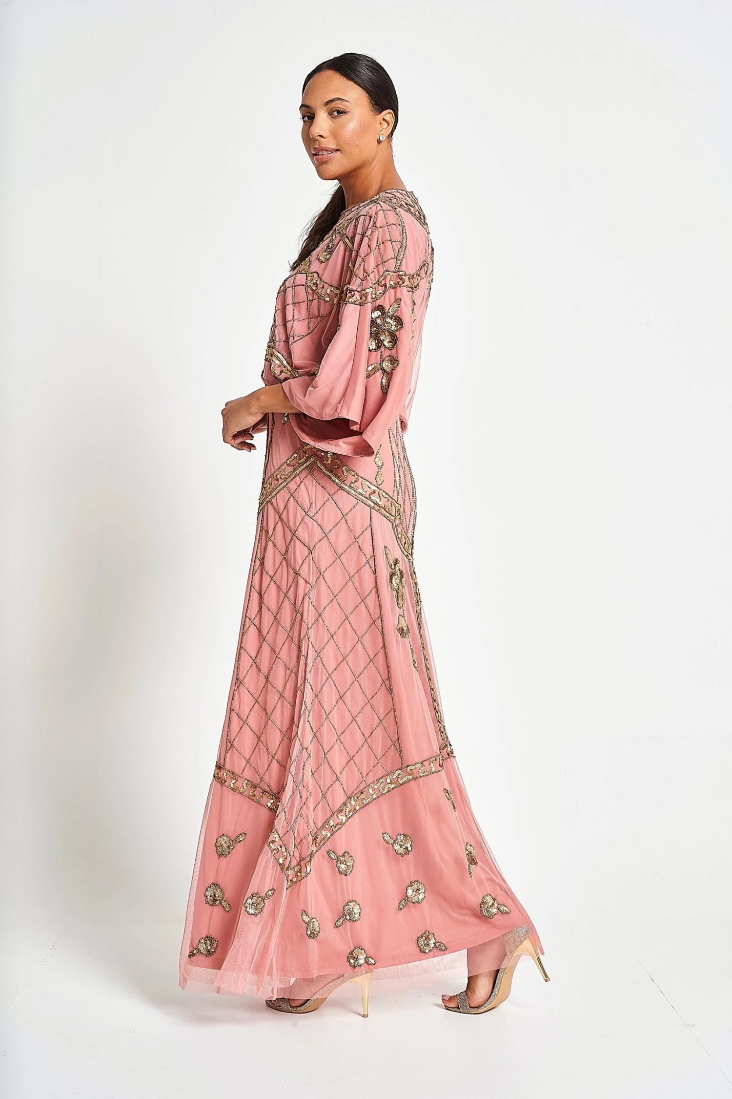 A true special occasion showstopper, our blush hued Kassia boasts ornate embellished detailing in a vintage inspired motif. Relaxed in silhouette, this maxi length piece balances batwing sleeves and a flowing skirt with a nipped in waist. Kassia is fully lined with a concealed zip closure at back.