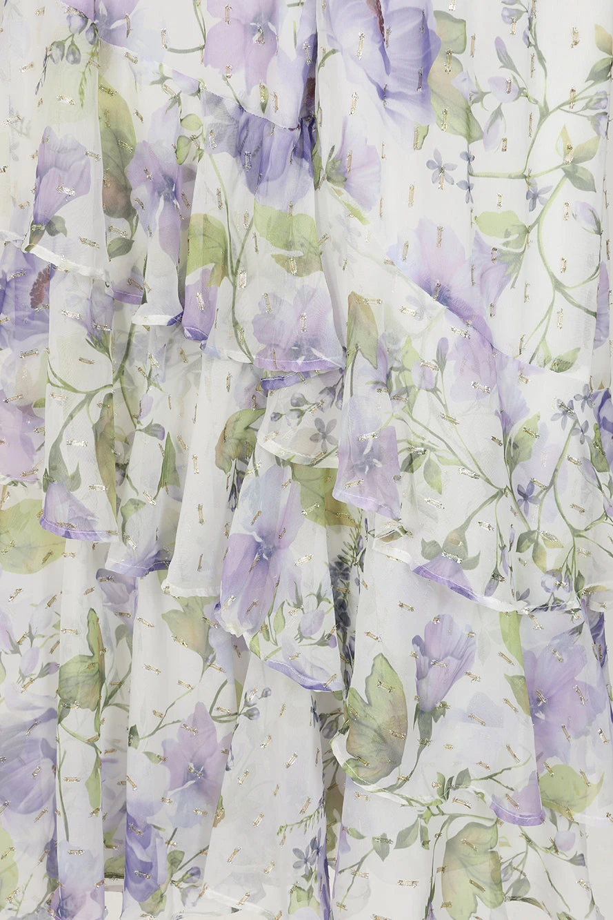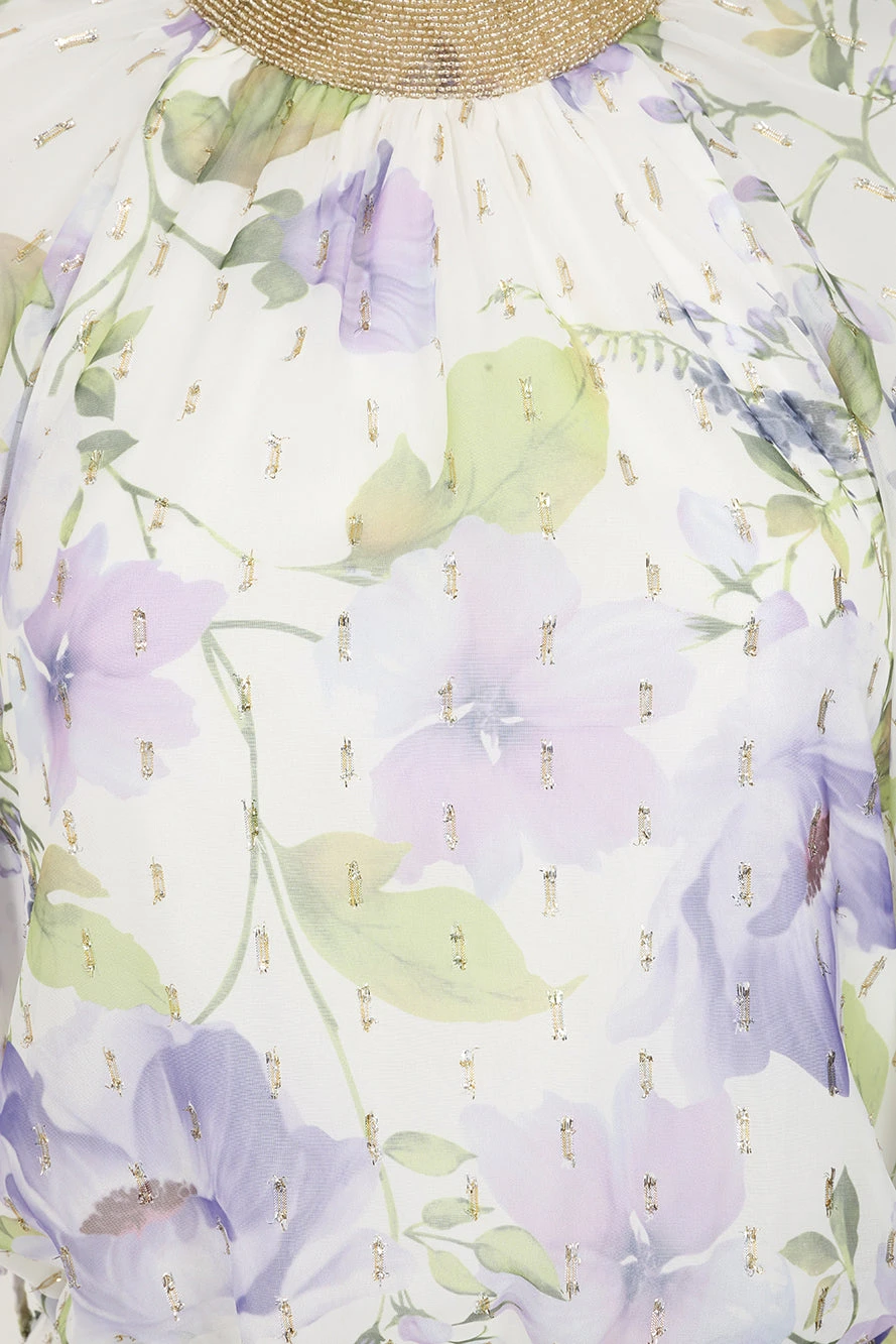 A springtime showstopper to put on repeat, Kelda pairs a romantic floral print with flecks of gold and eye catching embellishment around the neckline. Midi in length, this dress is complete with flutter sleeves and coordinating belt around the waist.
