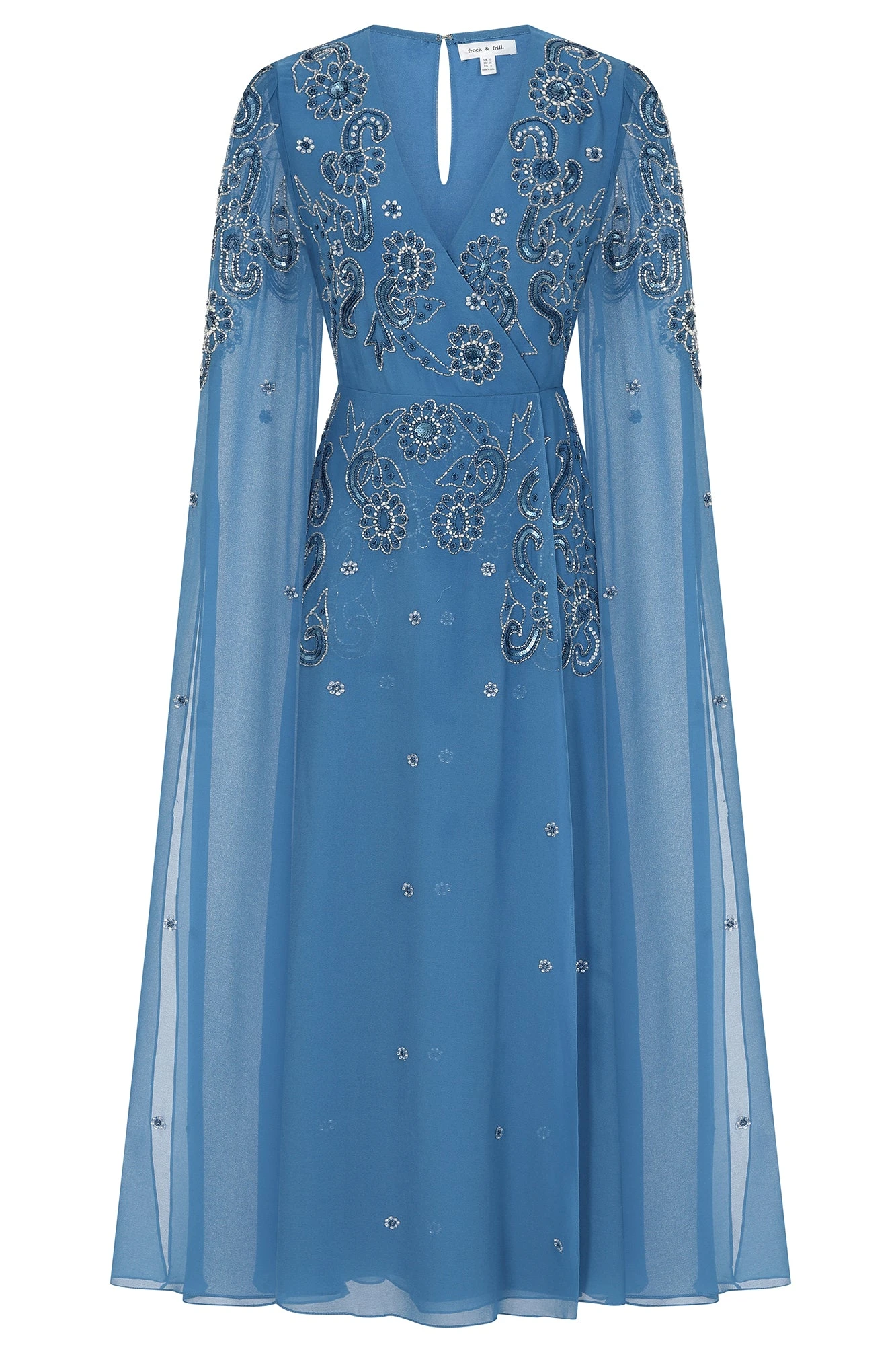 Introducing Laelia: a special occasion showstopper. Vivid blue in hue, this elegant maxi dress boasts tonal beadwork and hem length cape sleeves. Style with a statement necklace and silver heels for instant wedding season glamour.